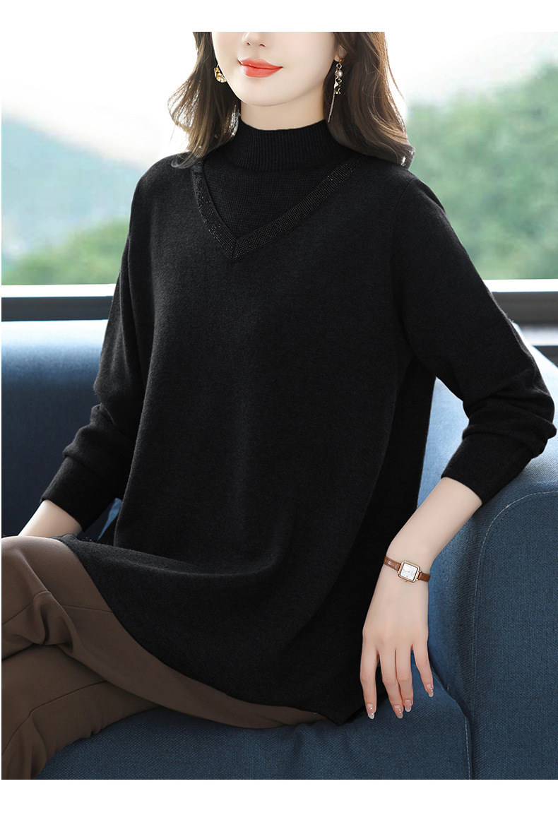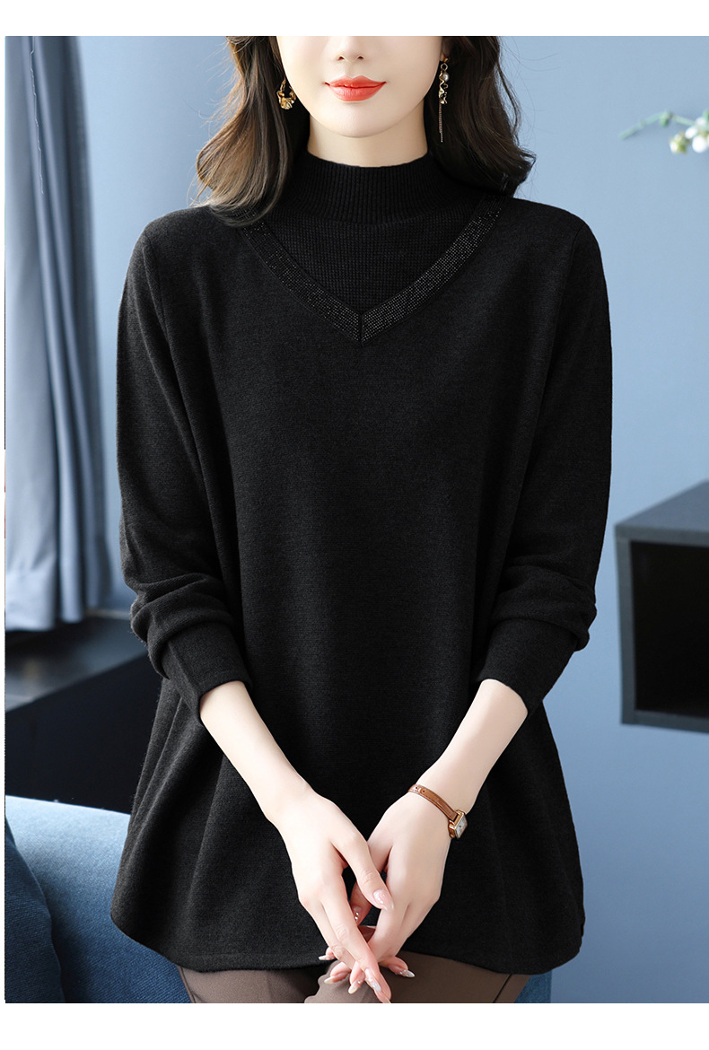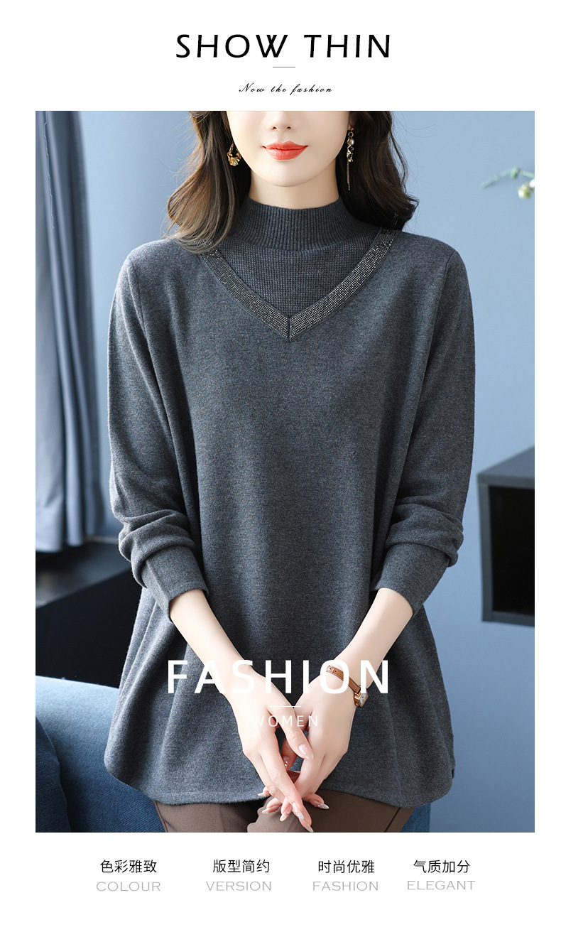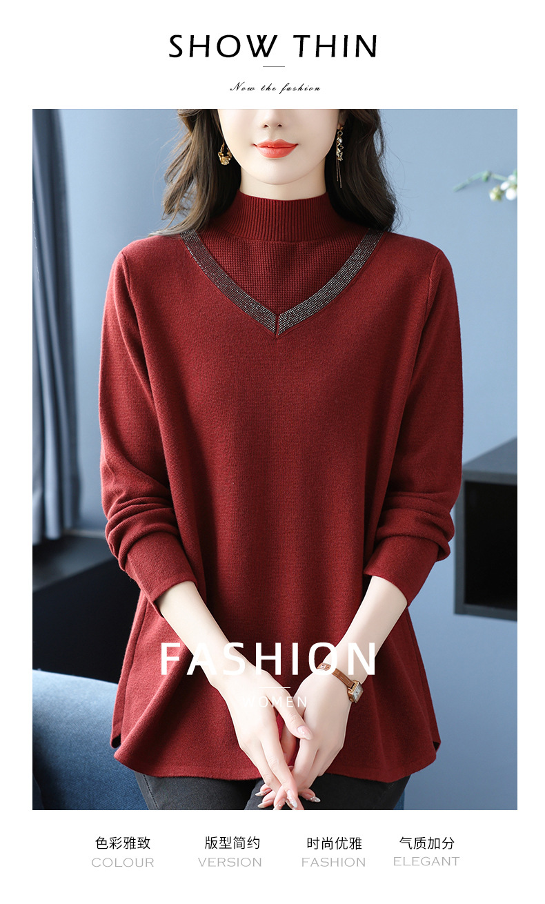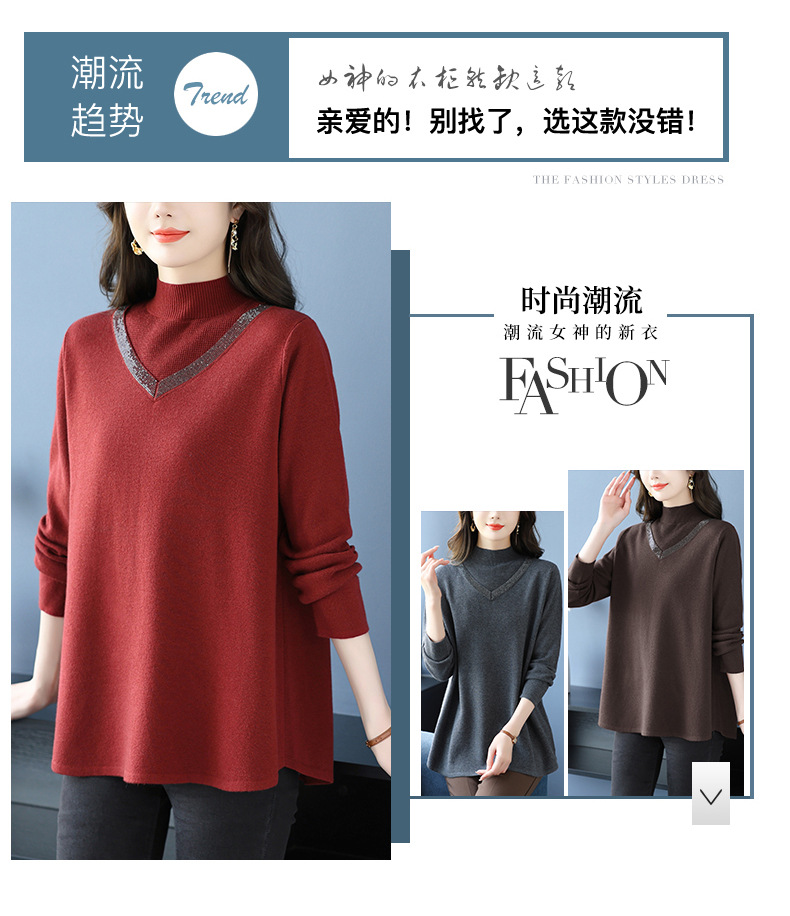 CC 10-7091半高领毛衣烫钻宽松显瘦中长款针织衫