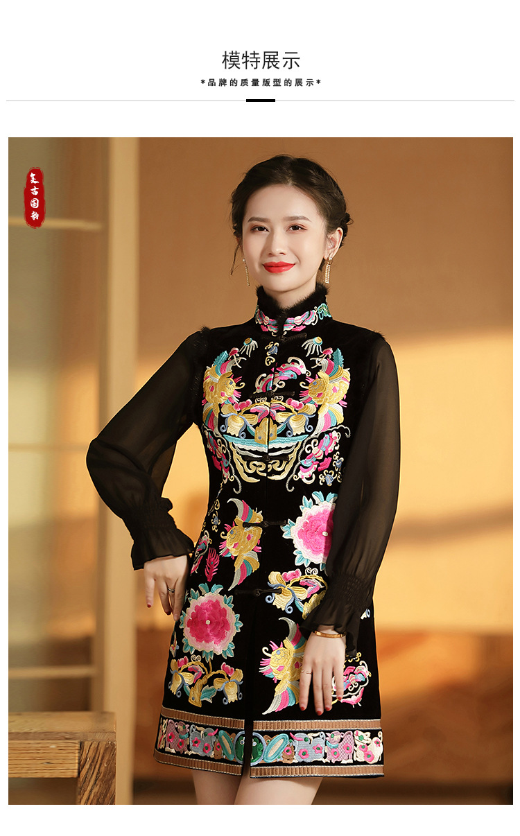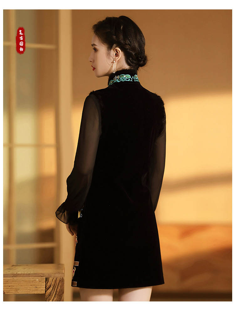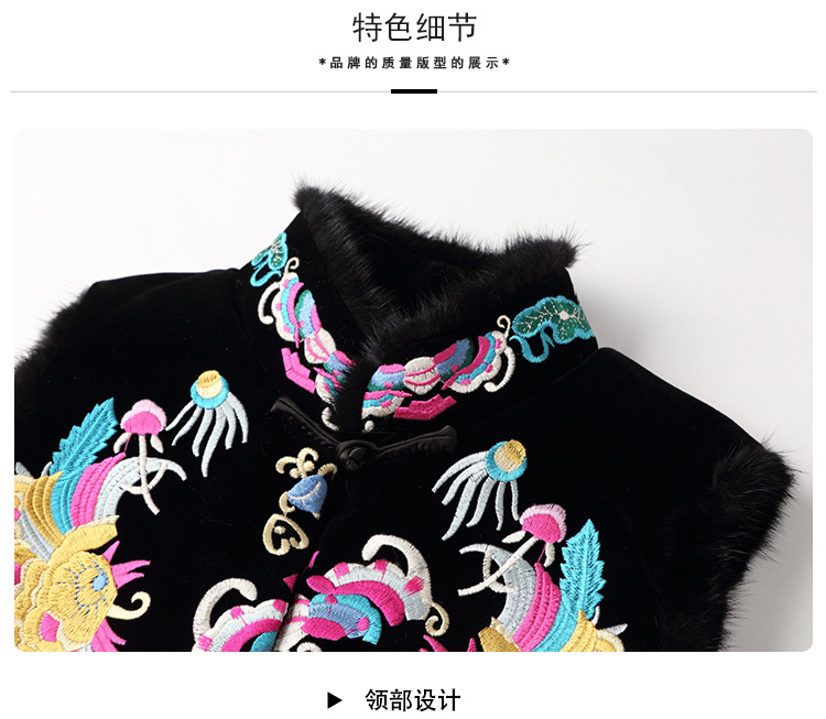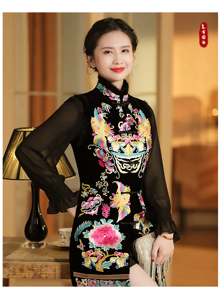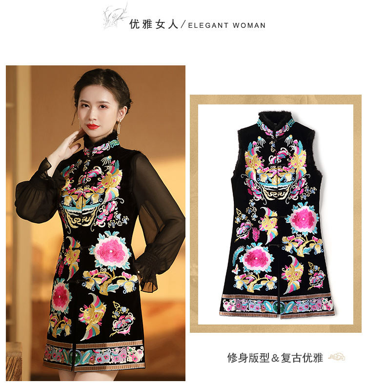 上海旗袍厂AYK-QF-201706219秋冬加厚旗袍裙复古无袖马甲刺绣中长款水貂毛修身连衣裙女