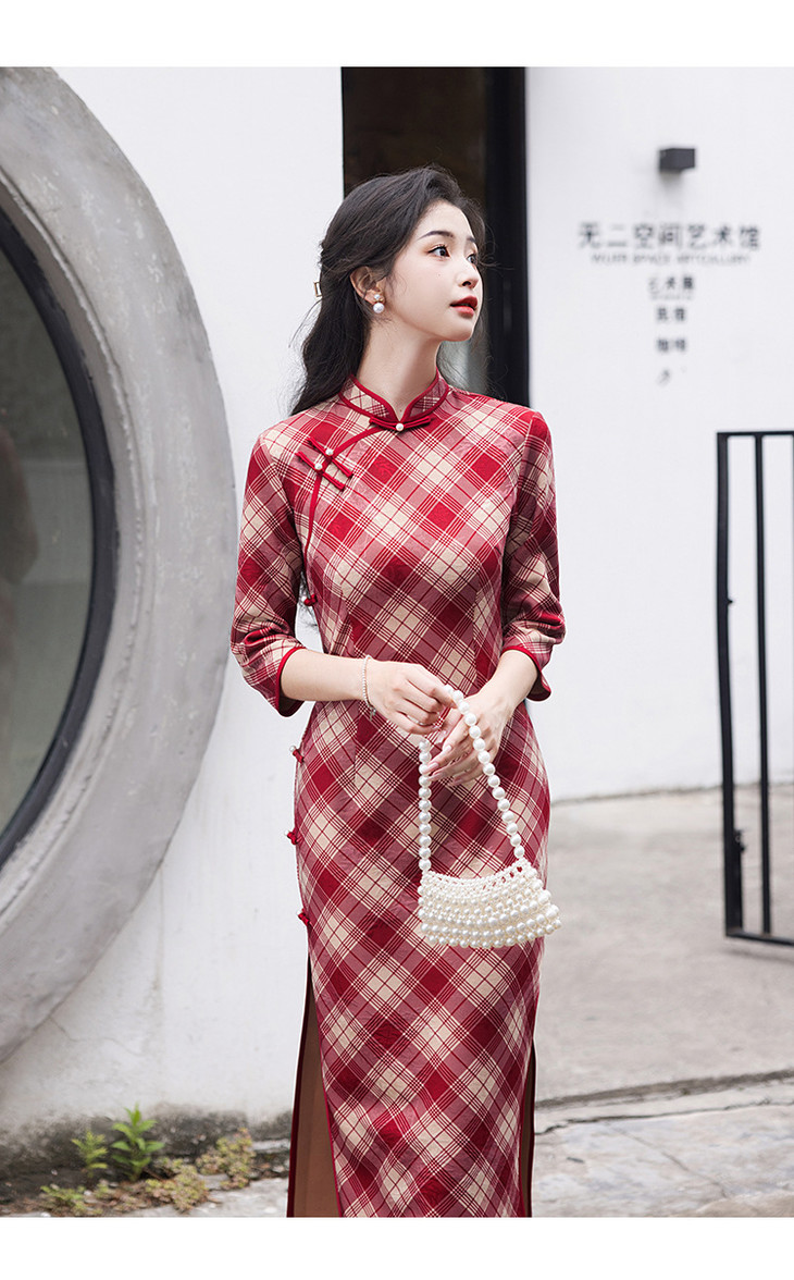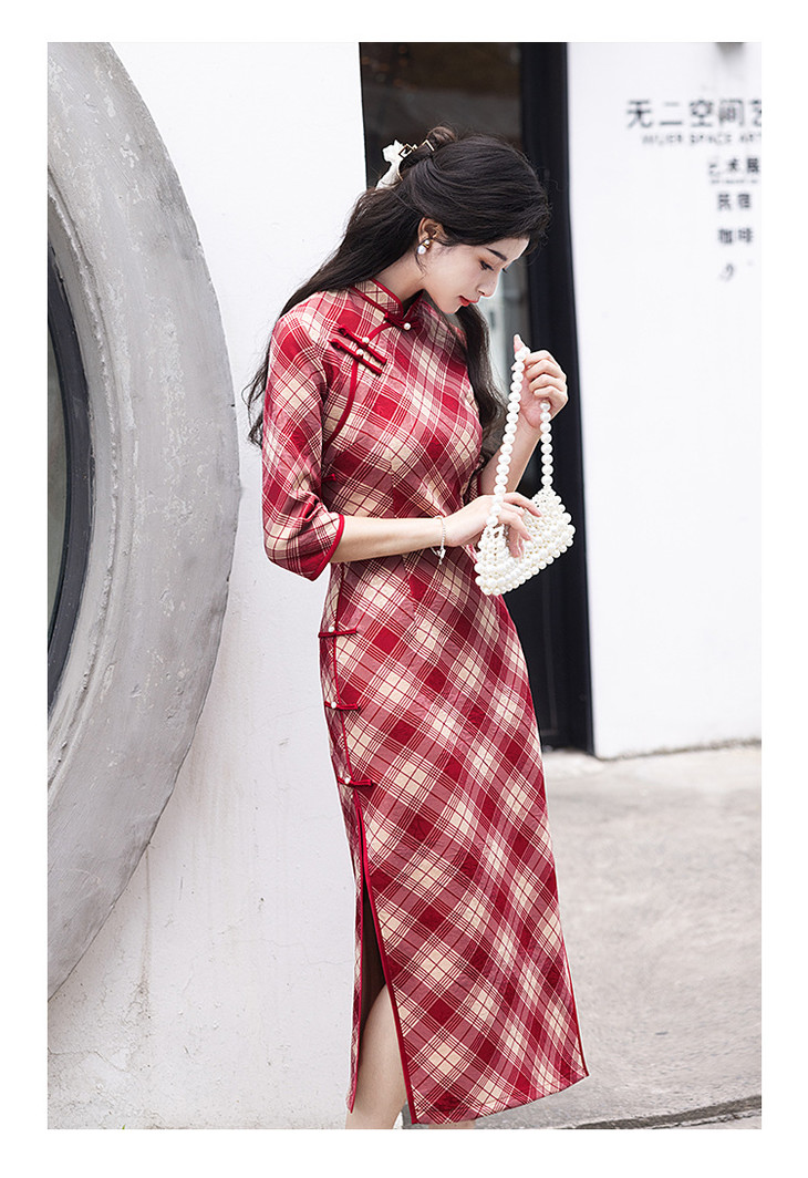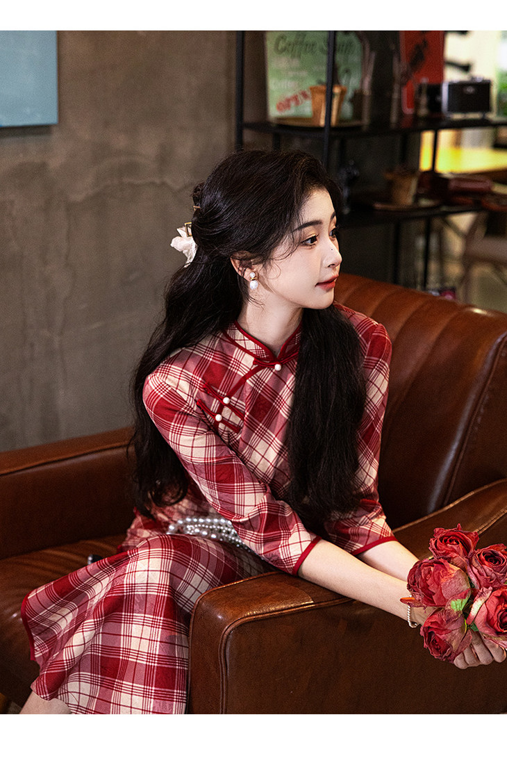【预售3天发货】2024秋季新款民国年轻款复古红色格子长袖改良版旗袍LSB3146 商品图2