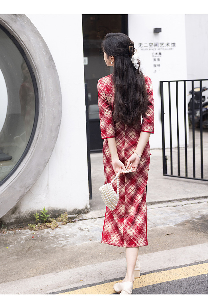 【预售3天发货】2024秋季新款民国年轻款复古红色格子长袖改良版旗袍LSB3146 商品图4