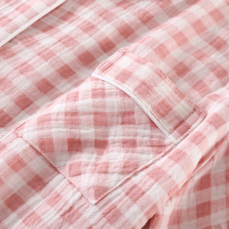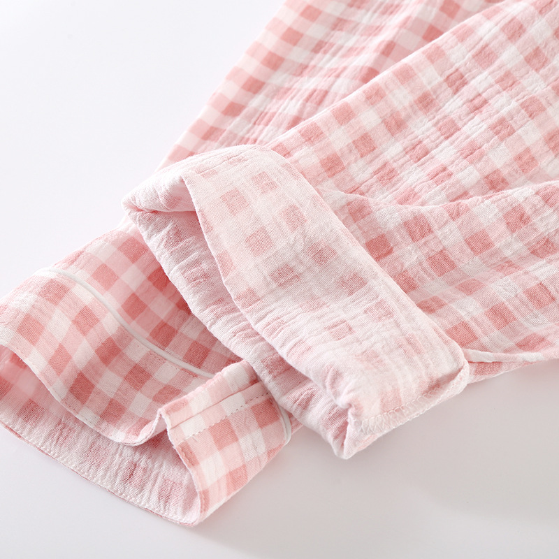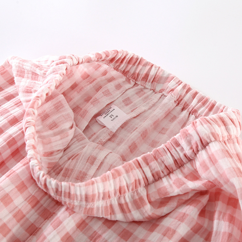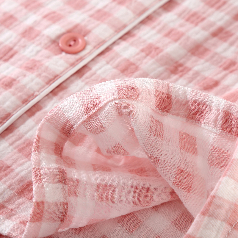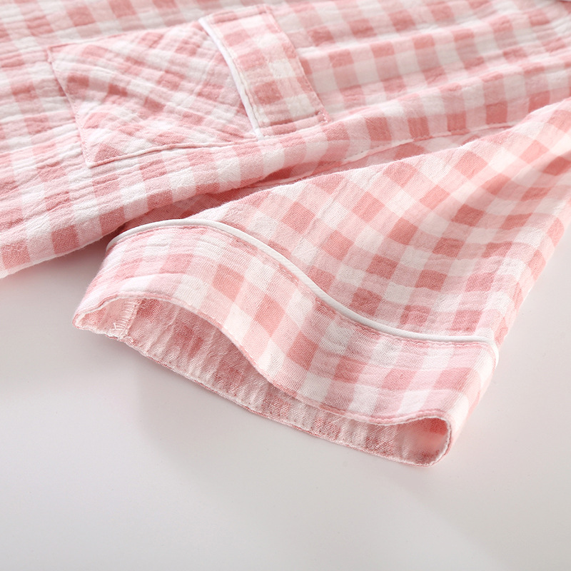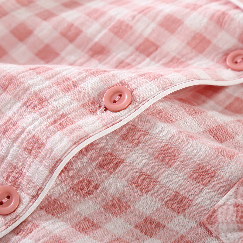 雀说夏款日系简约格子纯棉双层纱布女士三件套睡衣薄款短袖家居服套装AL