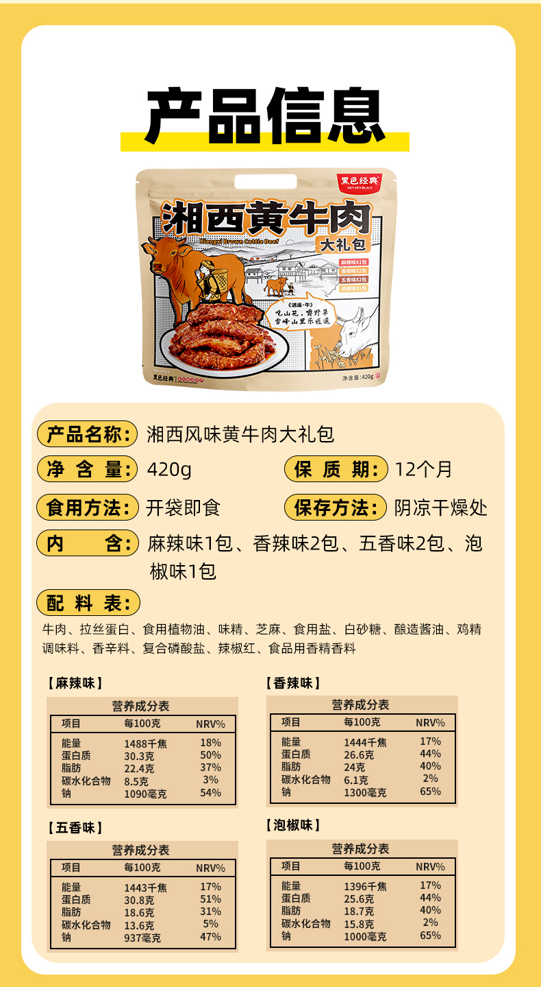【限时69元】黑色经典湘西黄牛肉大礼包特产版420g/袋 含四种口味