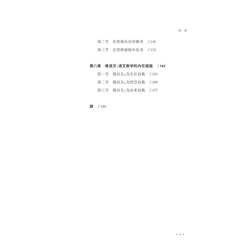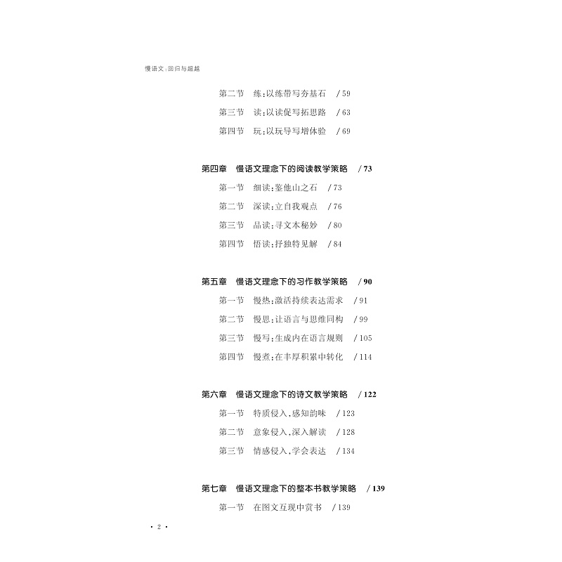 现代社会,一切都是快节奏、高速度。审视我们的语文课堂,狂轰滥炸式地讲解,囫囵吞枣式地读书,浅尝辄止式地思考。孩子们没有时间细细品味语文之韵味,没有空间深度思考语文之内涵,这样的“快语文”往往潜伏着与语文本质脱轨的可能。本书围绕“慢语文”展开,慢在文本细读上:从成人登攀的“引领”走向儿童徜徉的“陪同”;慢在教学设计上:从基于语文的“有意义”,走向追寻语文的“有意思”;慢在教学细节上:从关注产出的效率,走向期冀等待的硕果。结合着不同课型的语文教学实践进行真实有效的策略引导,具有很强的实践性、操作性特点,对不同课型的语文教学具有较高的参考价值。