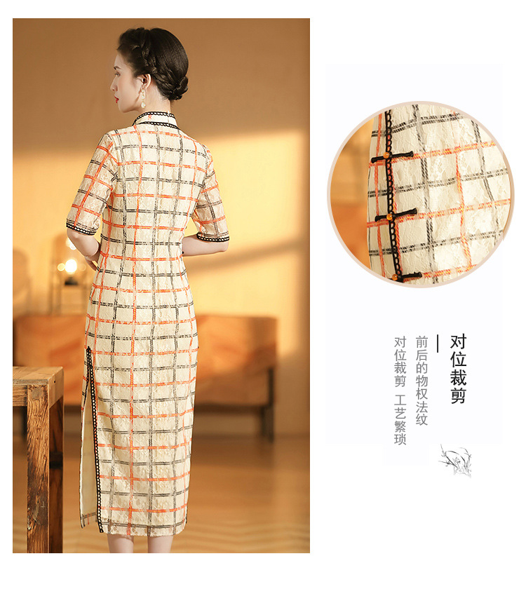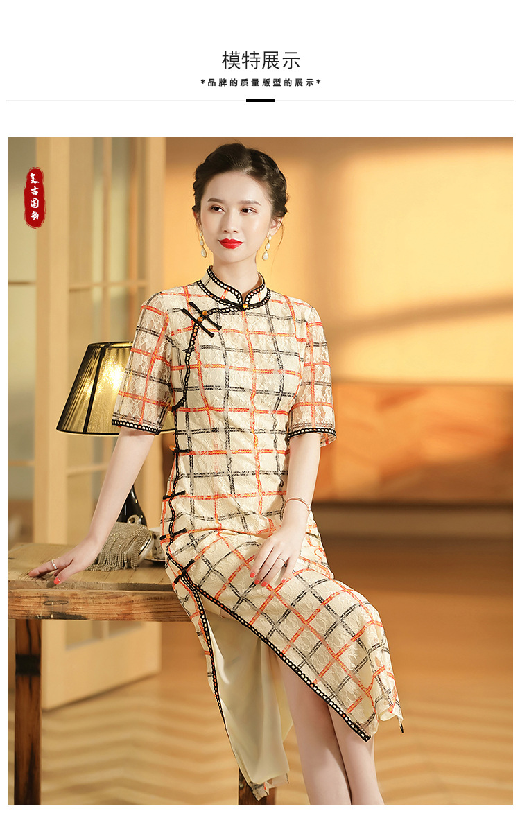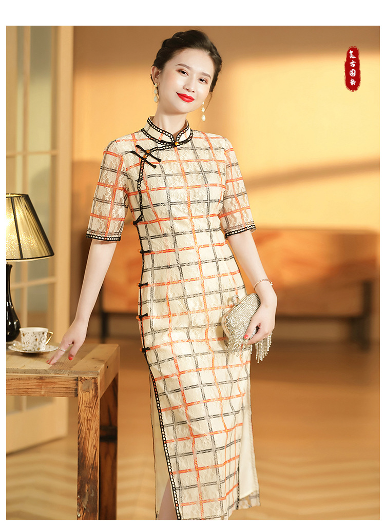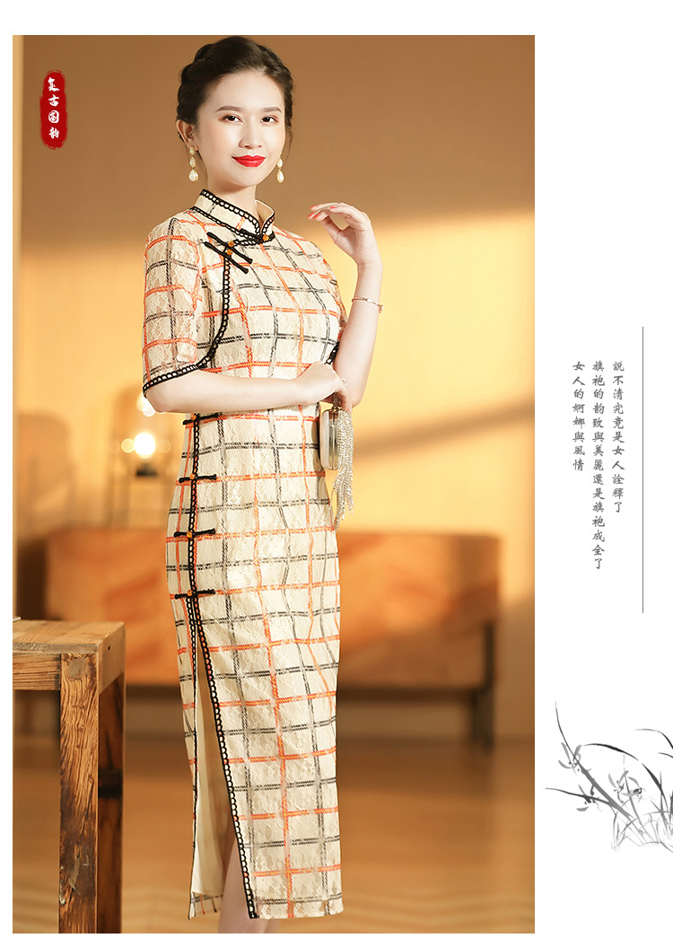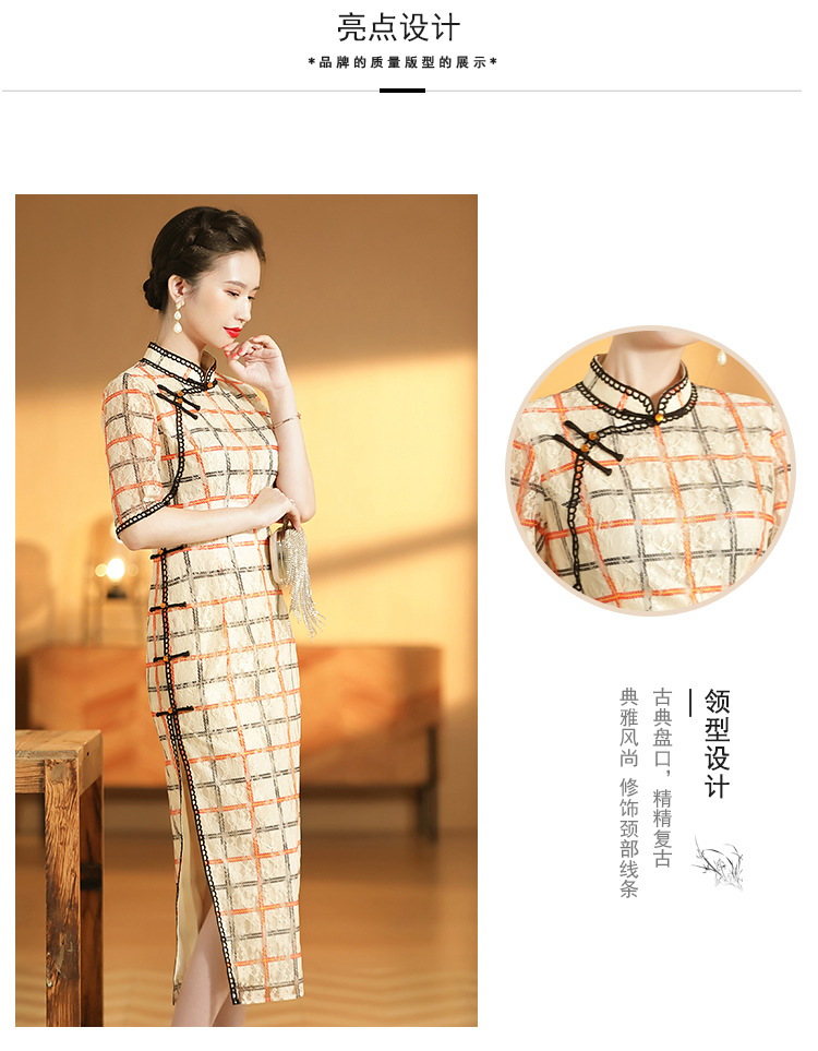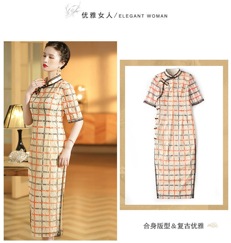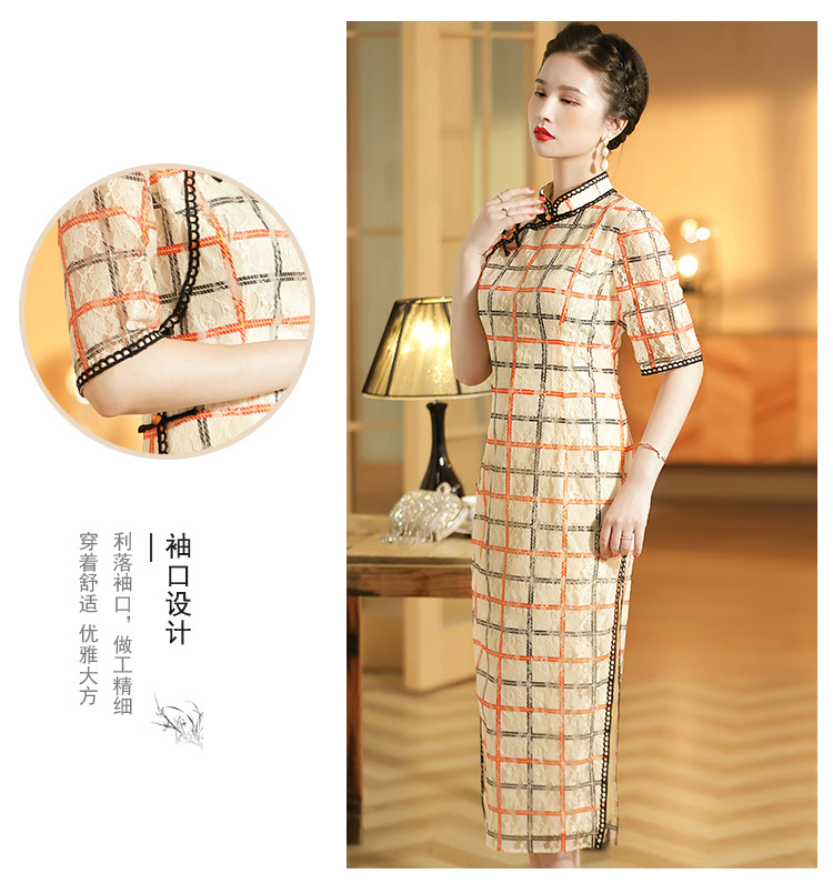 上海旗袍厂AYK-QF-201008蕾丝杏底红黑格旗袍连衣裙2021早春国风女装长款修身短袖旗袍裙女
