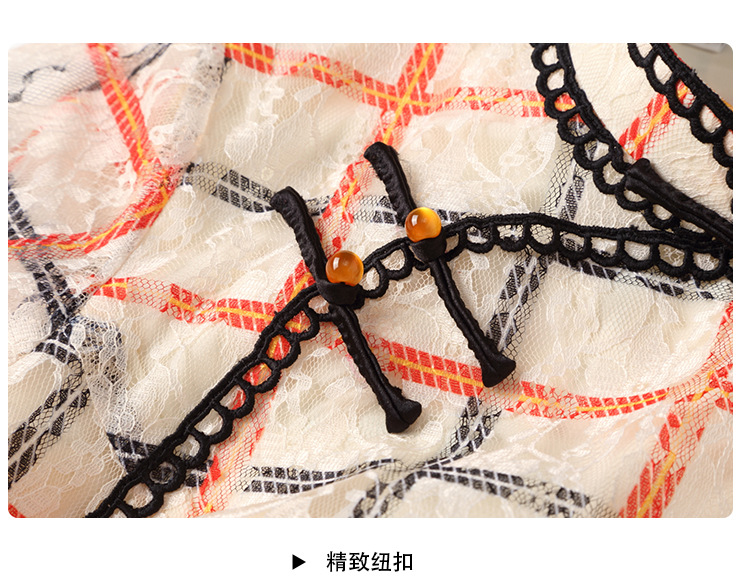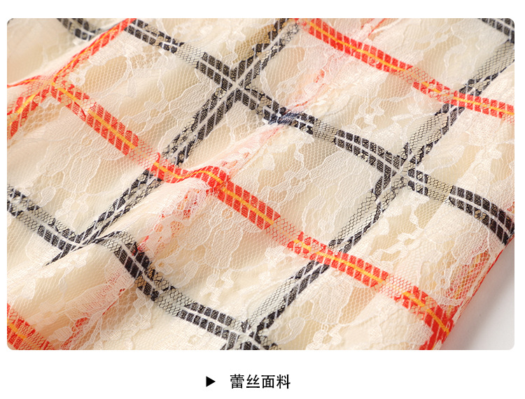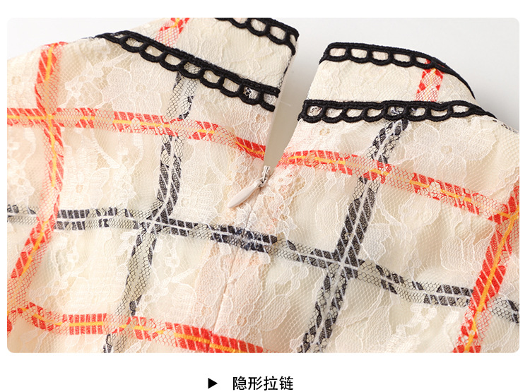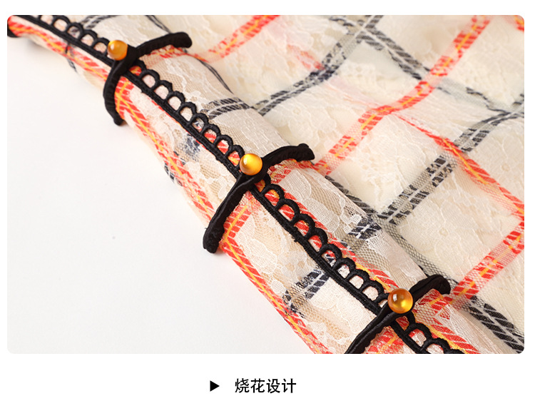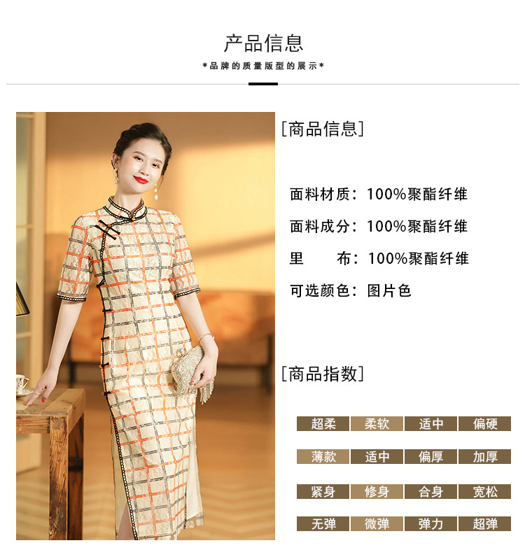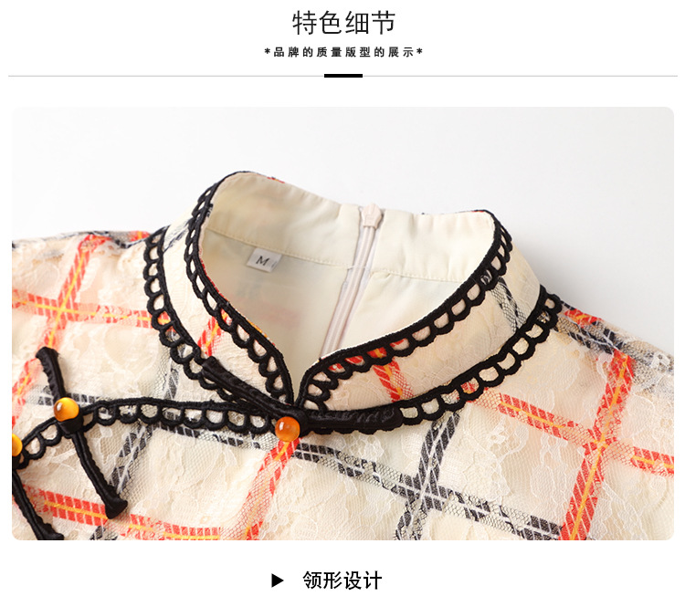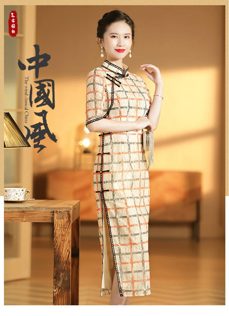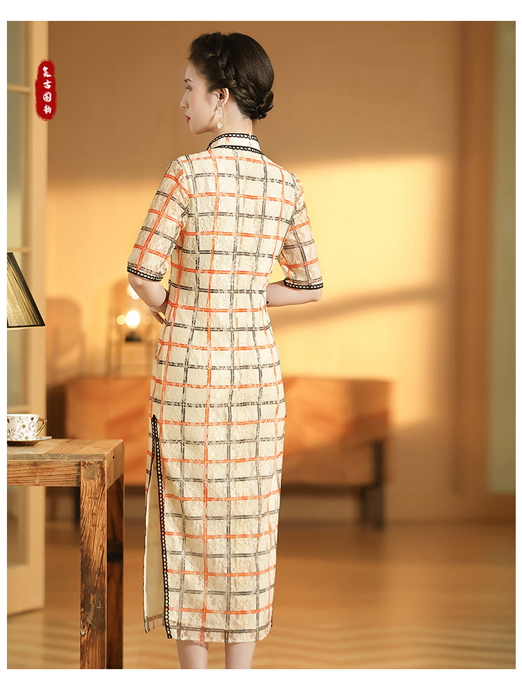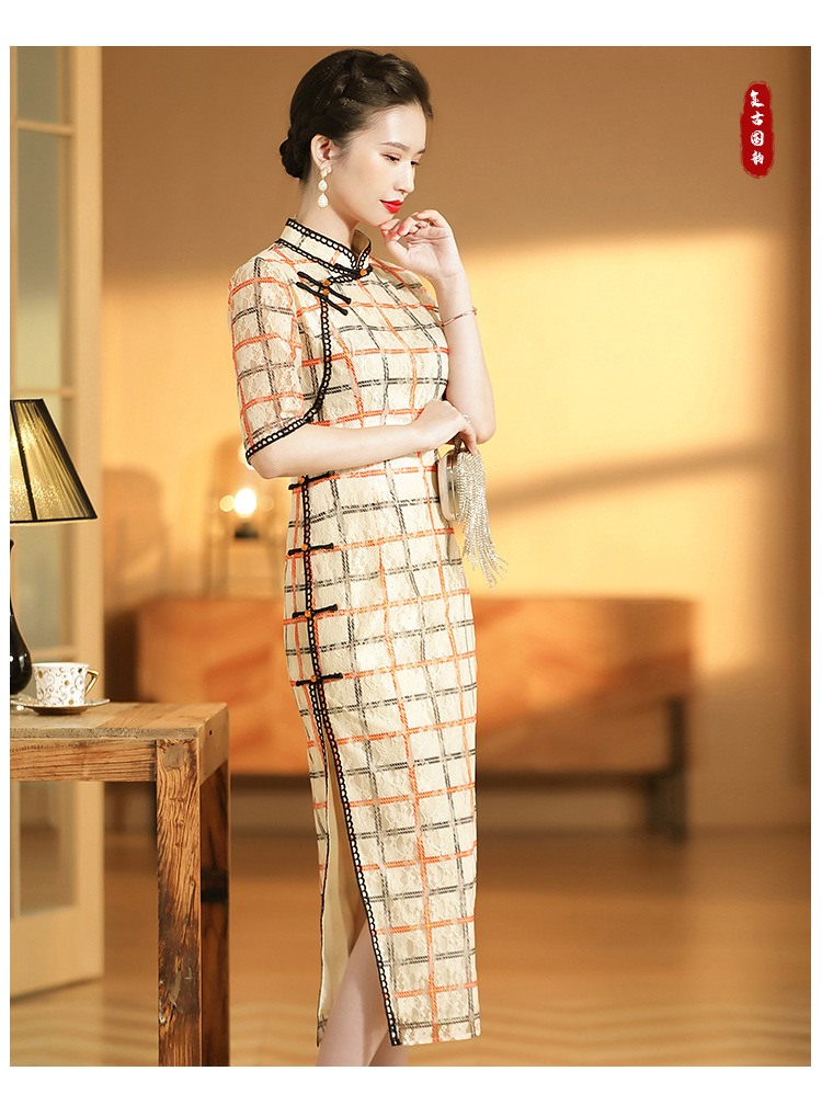 上海旗袍厂AYK-QF-201008蕾丝杏底红黑格旗袍连衣裙2021早春国风女装长款修身短袖旗袍裙女