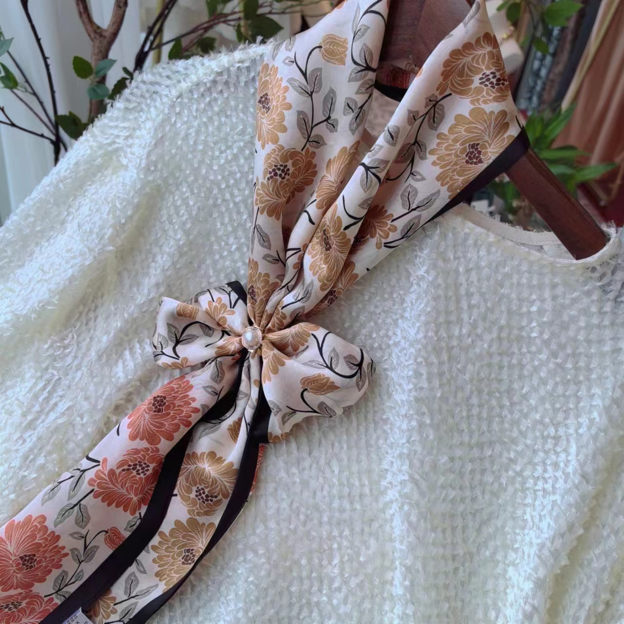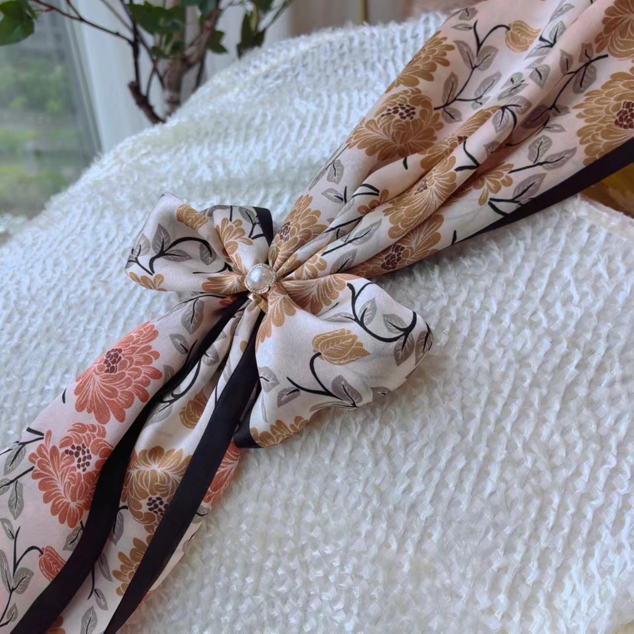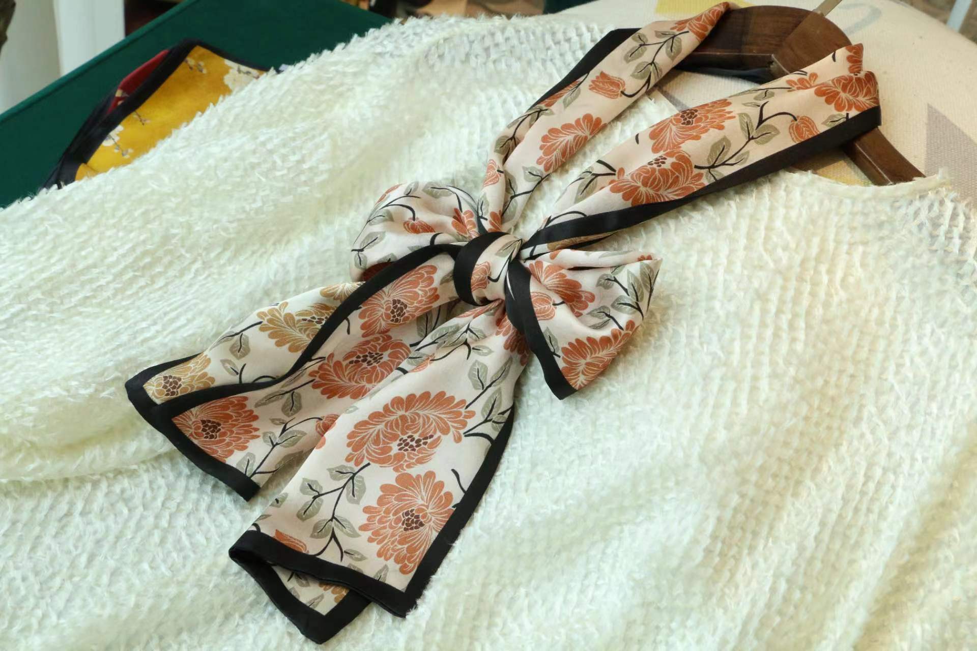 一面黄色系,一面橘色系的真丝飘带,春夏天特别好搭配,而且不挑人,提气衬肤。