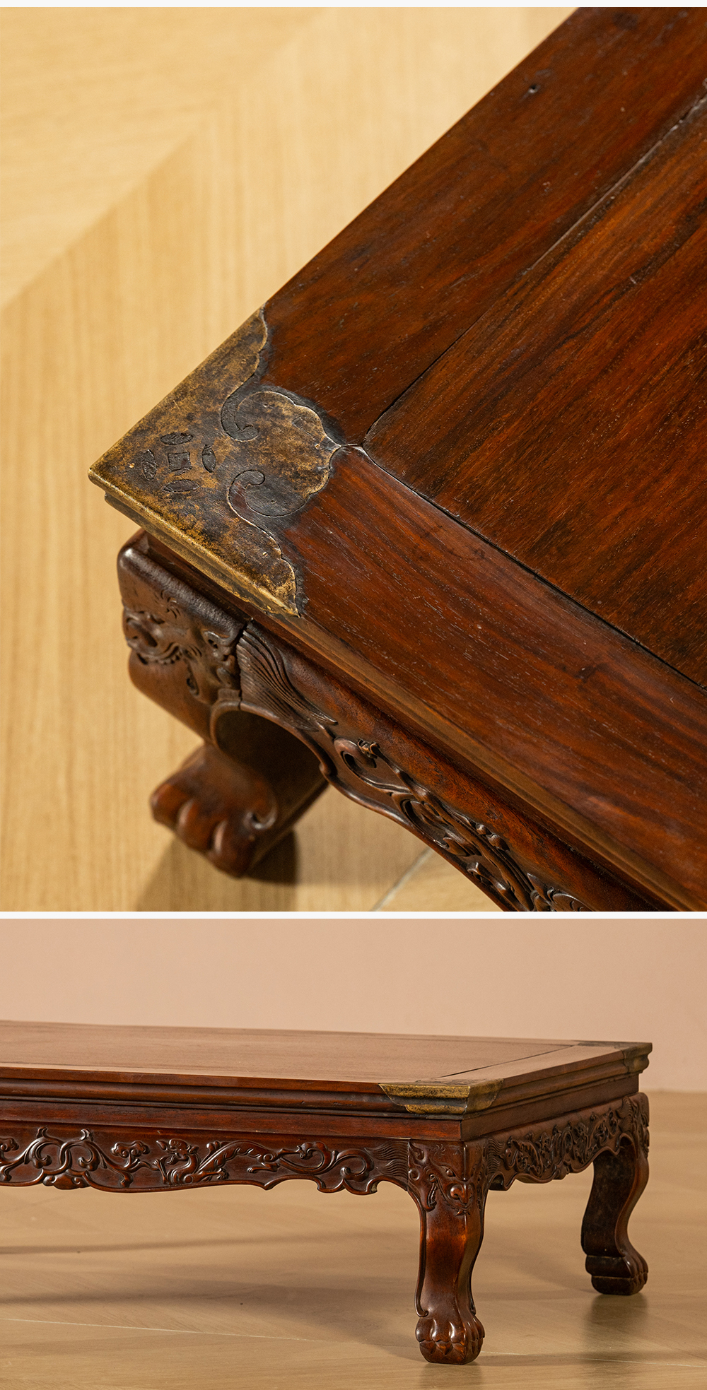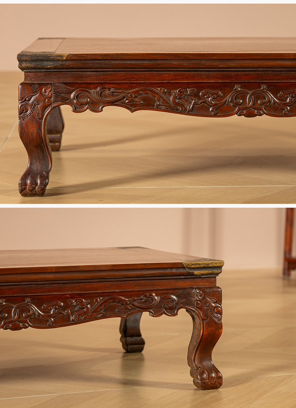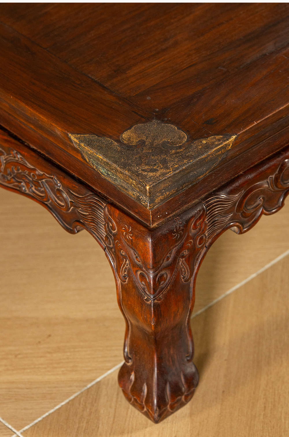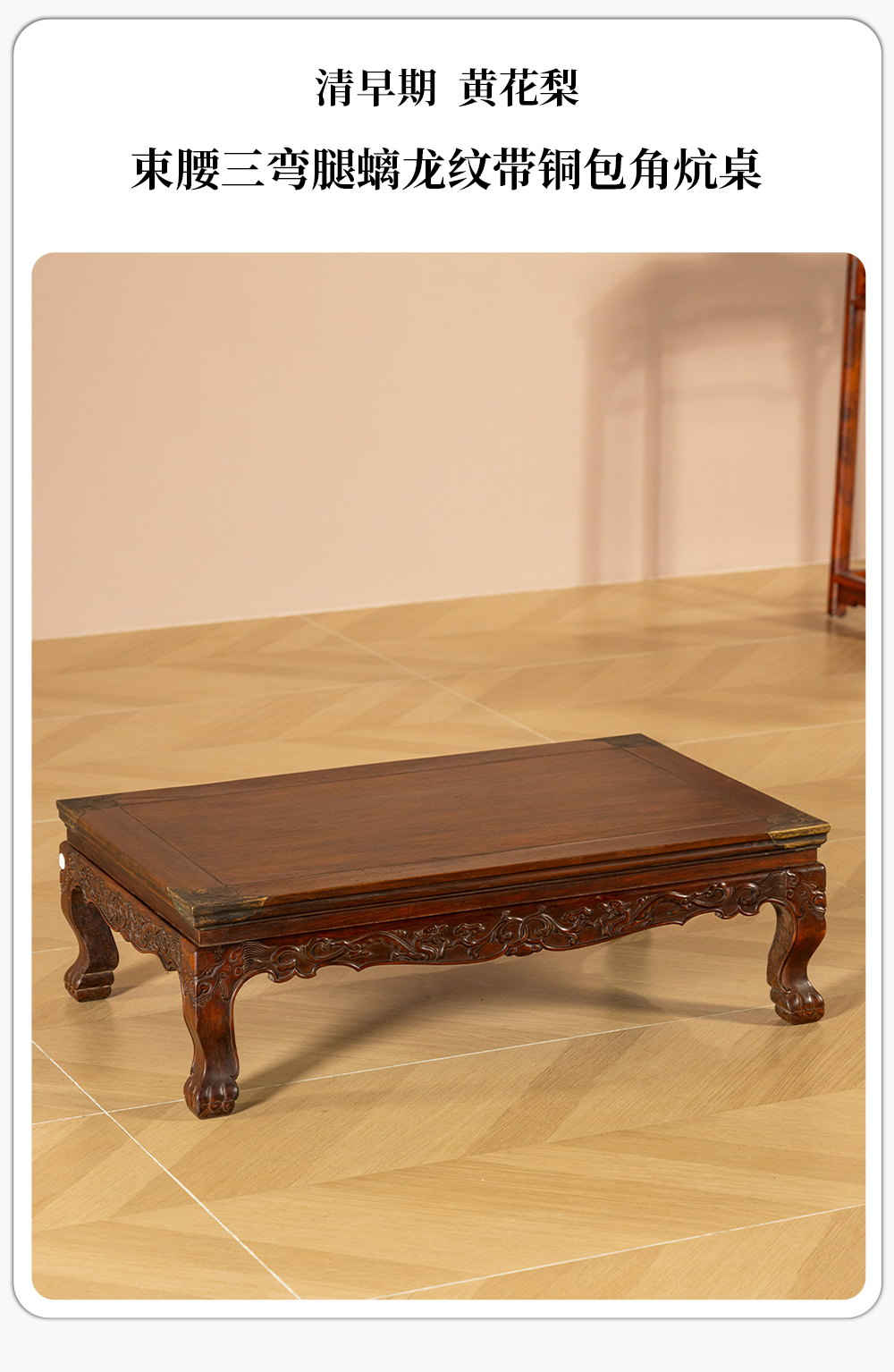 清早期 黄花梨束腰三弯腿螭龙纹带铜包角炕桌