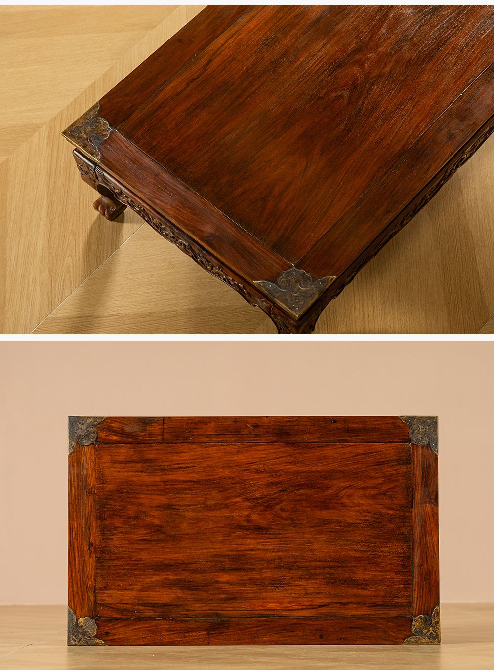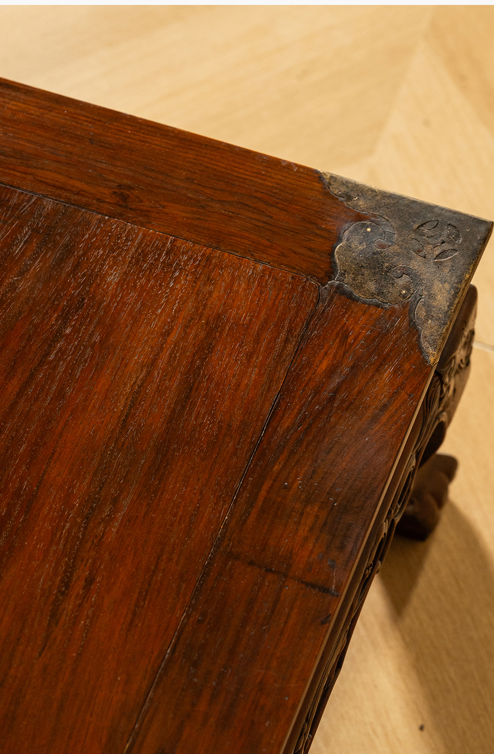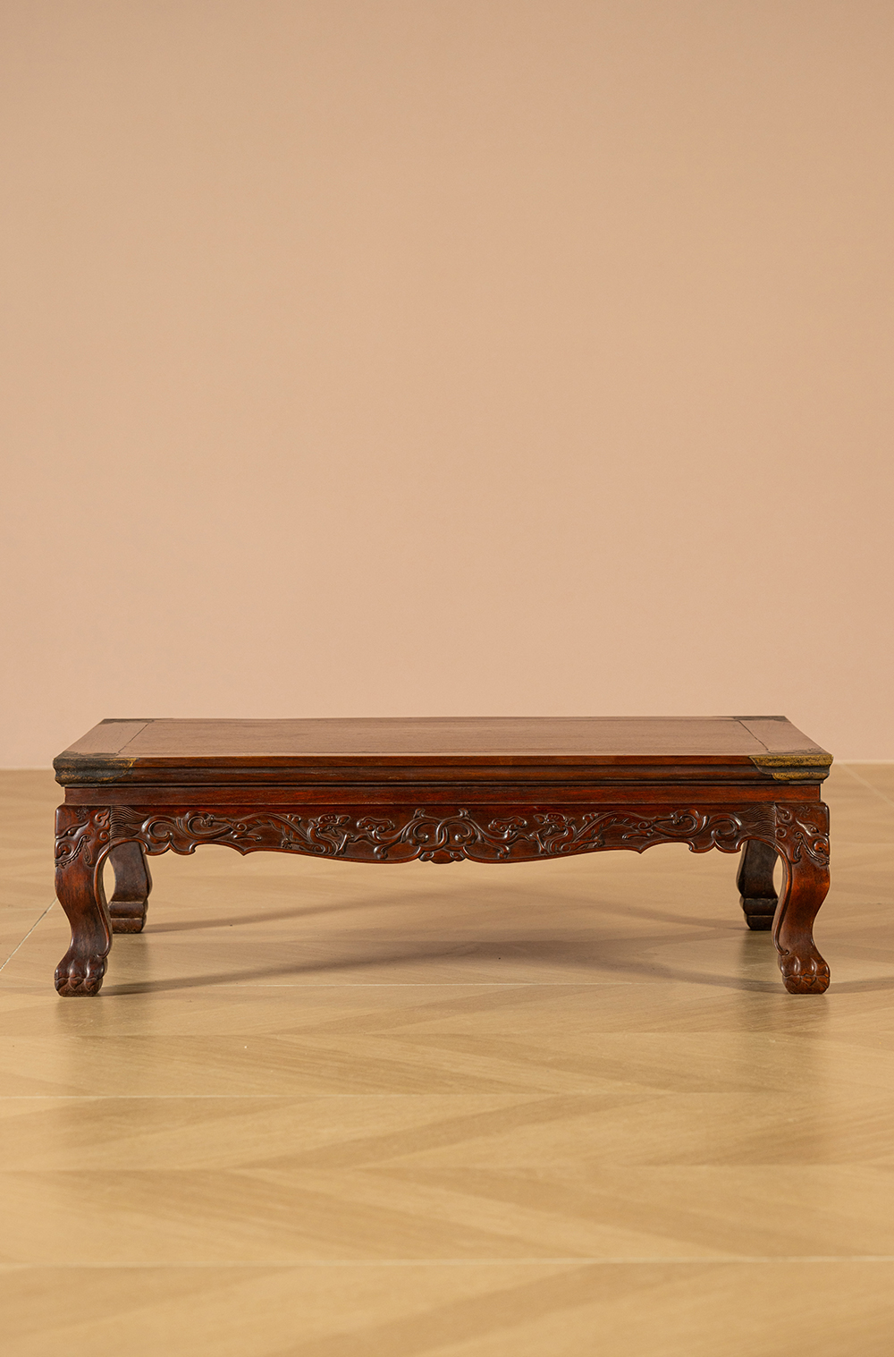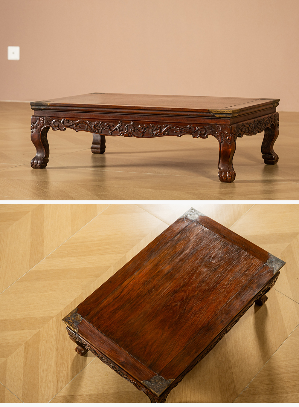 清早期 黄花梨束腰三弯腿螭龙纹带铜包角炕桌