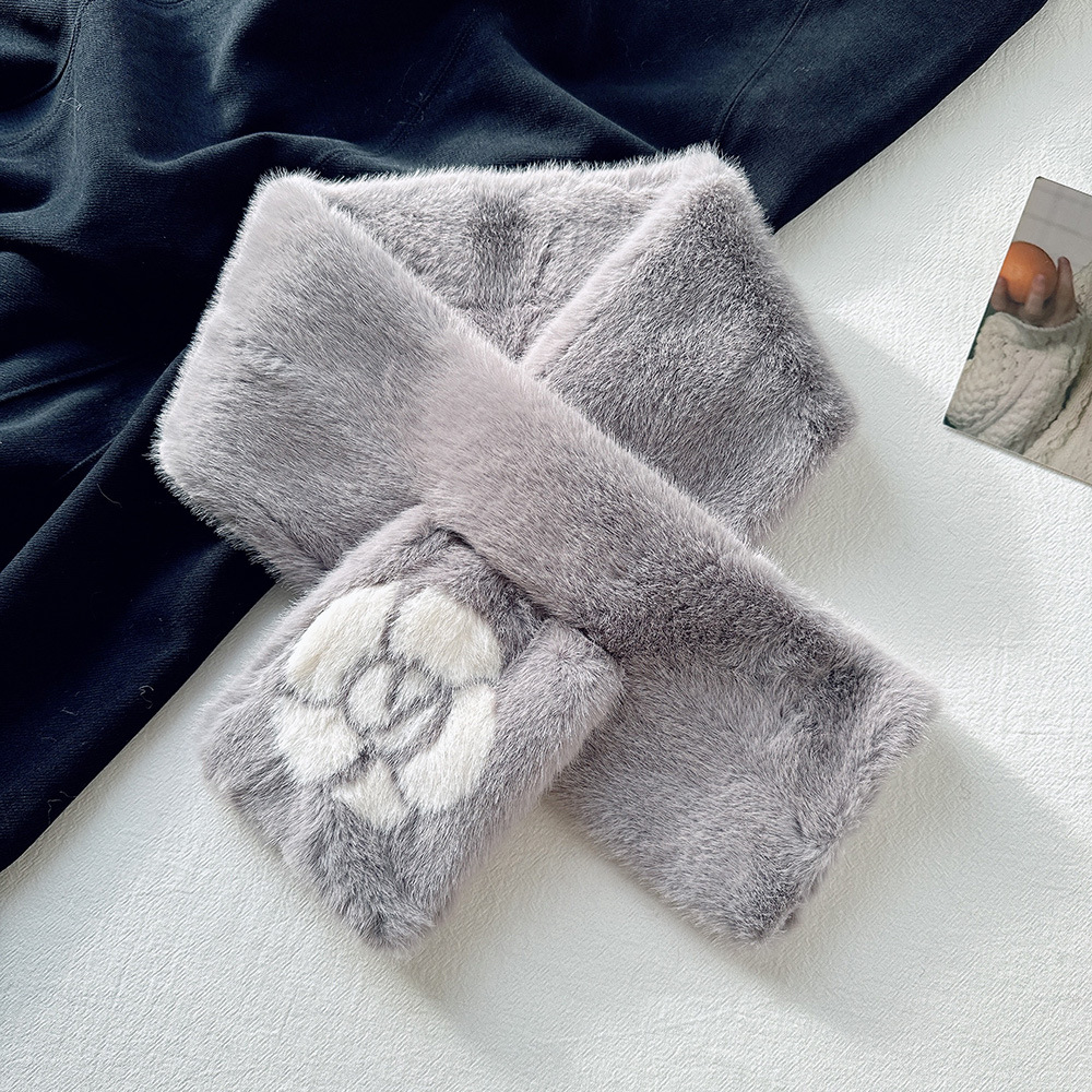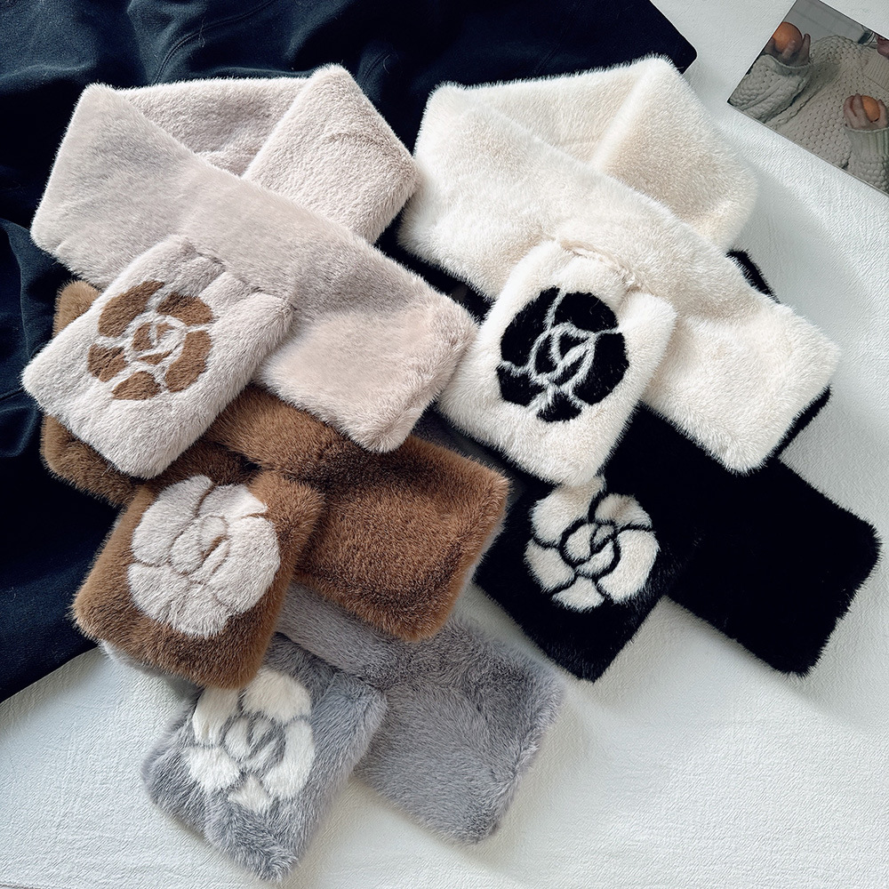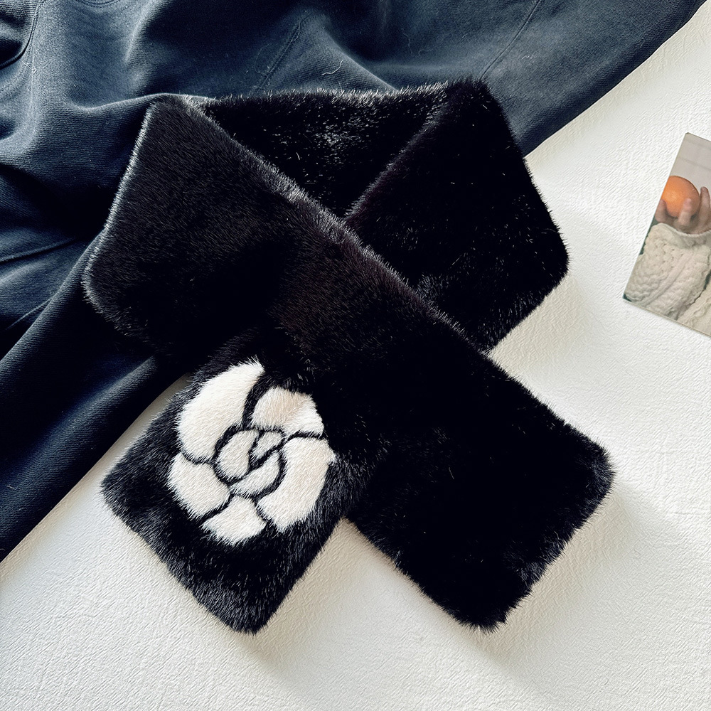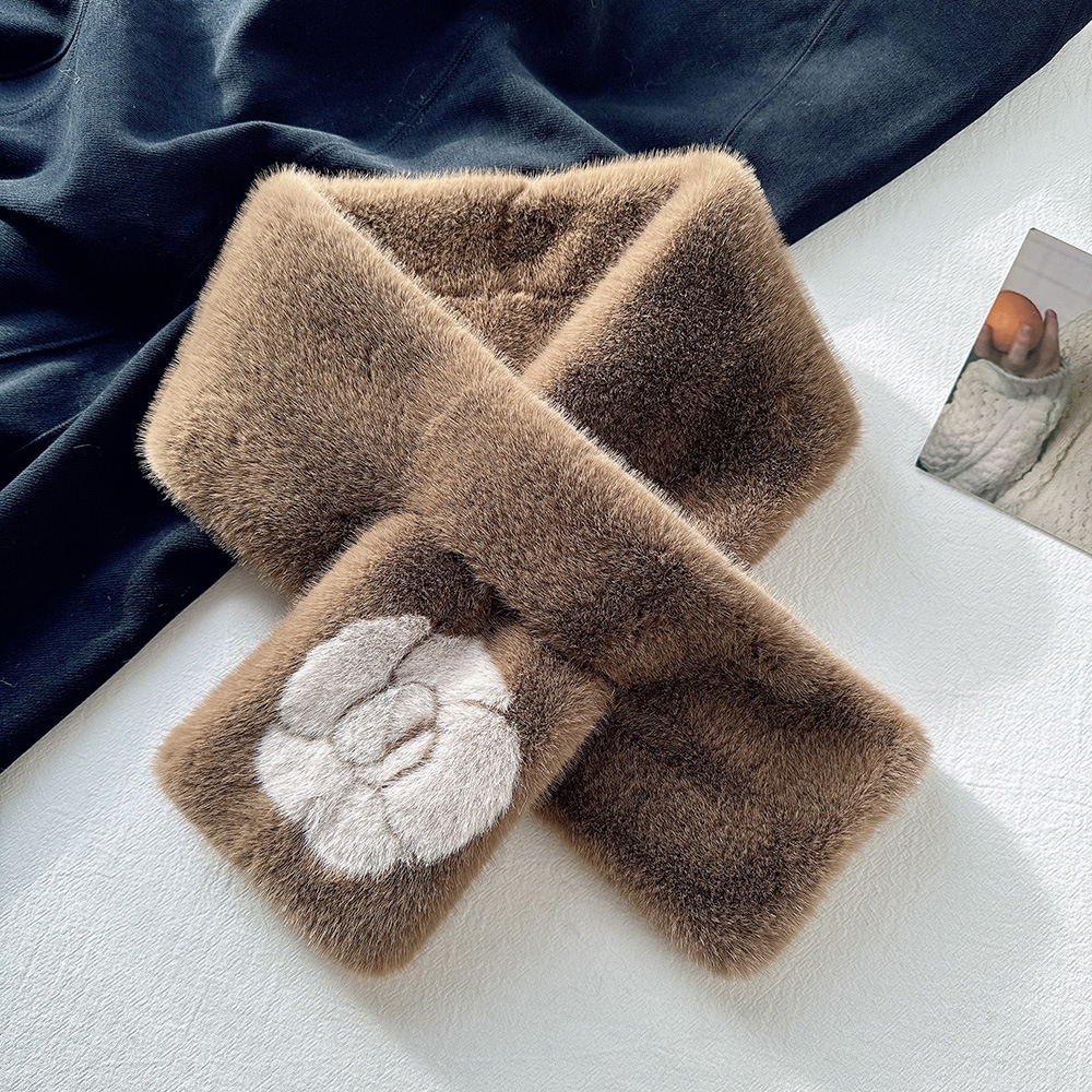雀说手工缝制山茶花毛绒绒围巾女冬季保暖交叉知性文艺毛领围脖高品质ALW035
