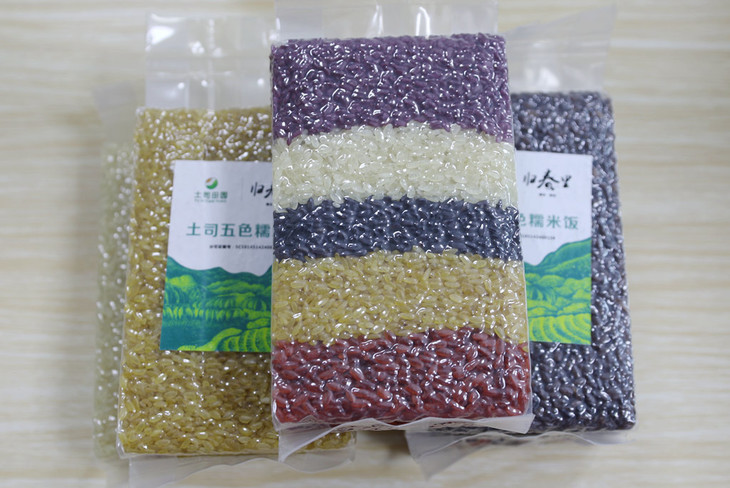 节日中每家每户的餐宴上都把五色香糯米饭摆设在显眼的地方,以显示“五谷丰登、丰衣足食”。