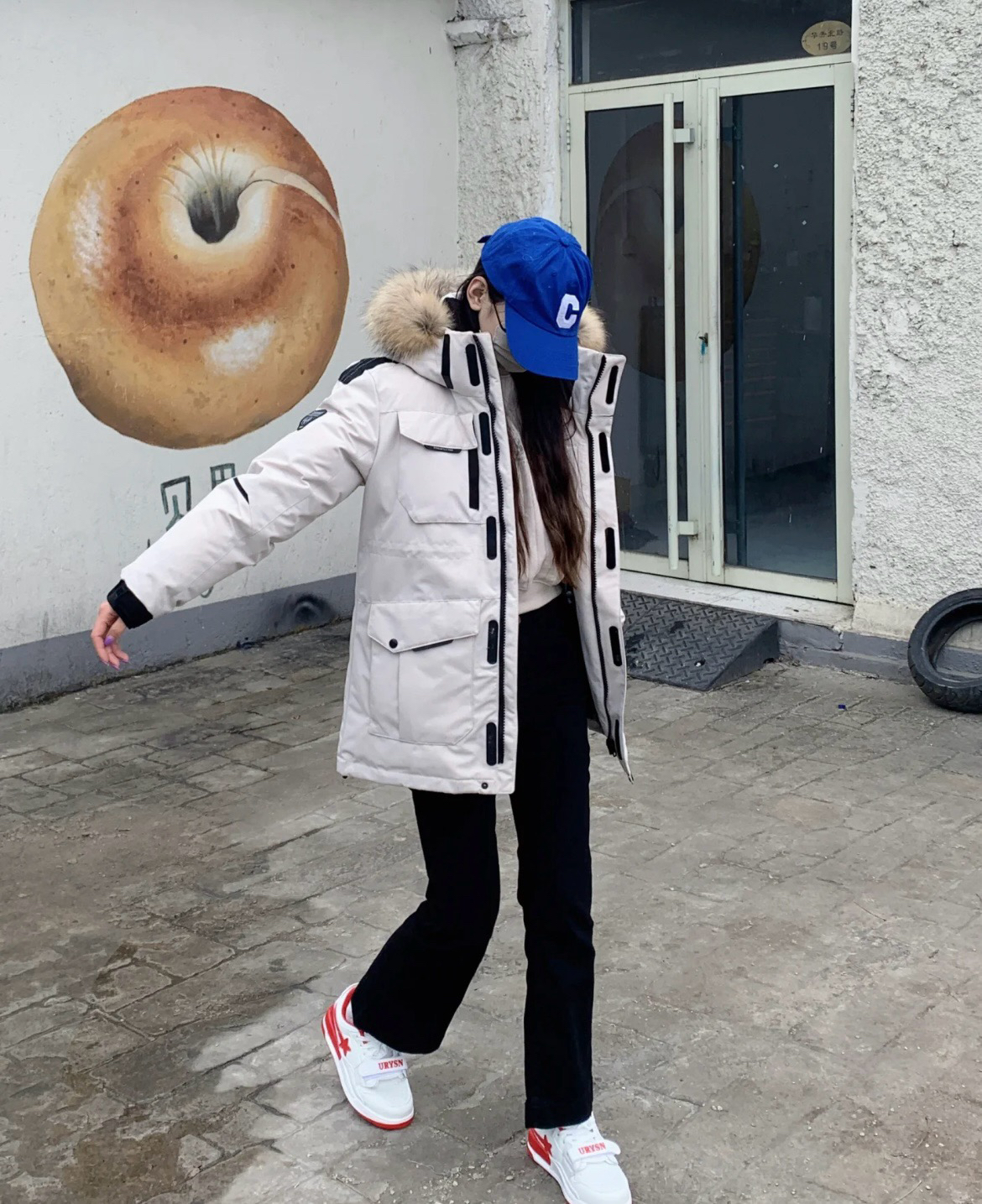 一件超有分量感,拿在手里也是沉甸甸的,内里填充白鸭绒,远用大绒朵可隔绝外部的温度影响,保住自身的温度,横格填充,保证每一格的充绒量均匀填充,就像穿上了一个柔软的“鸭绒被”,保暖效果满分!超大可拆卸毛领,真动物毛领貉子毛,天然的,蓬松度绝了,刮风天拉上连帽,从头暖到脖子,拍照自带氛围感,摘掉又是清爽利落的日常款!