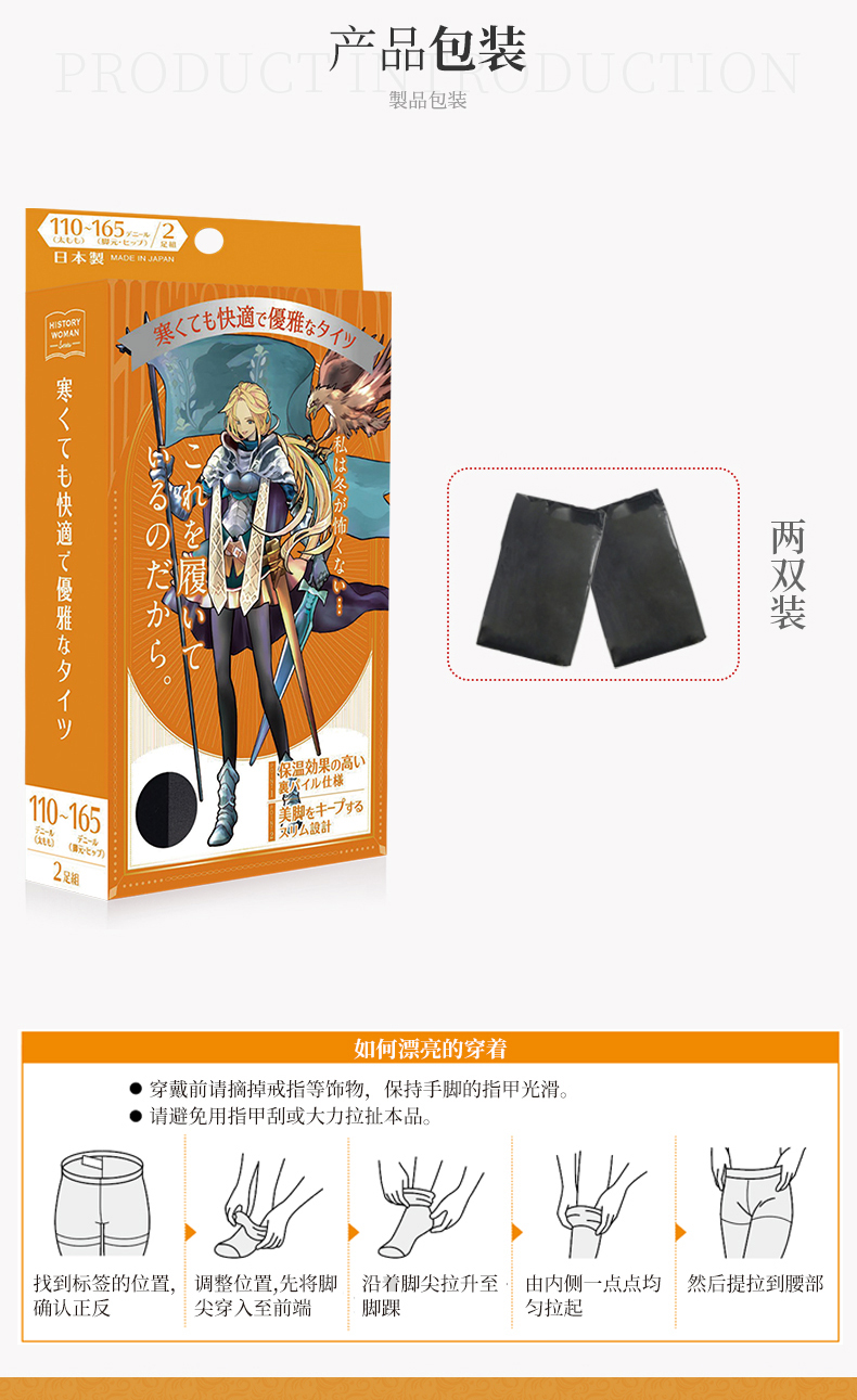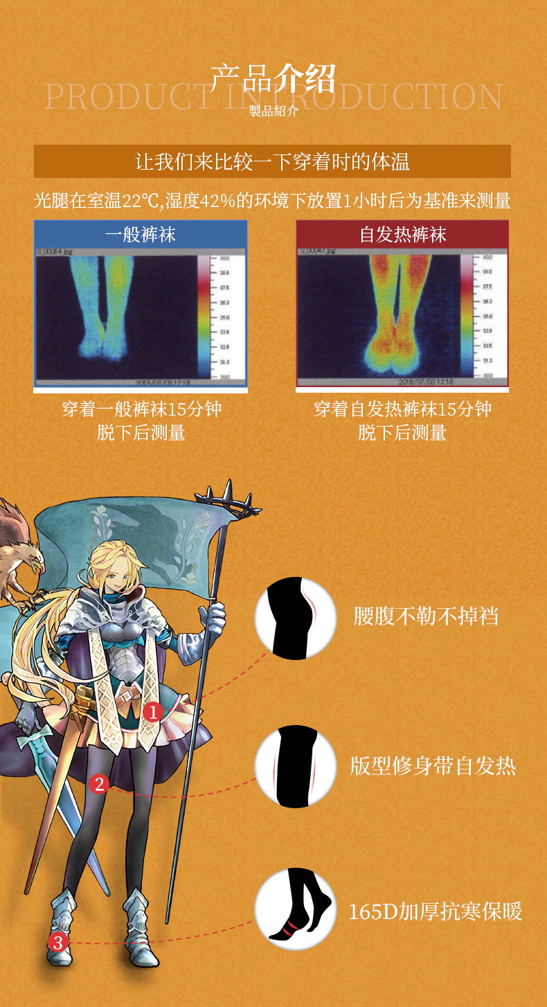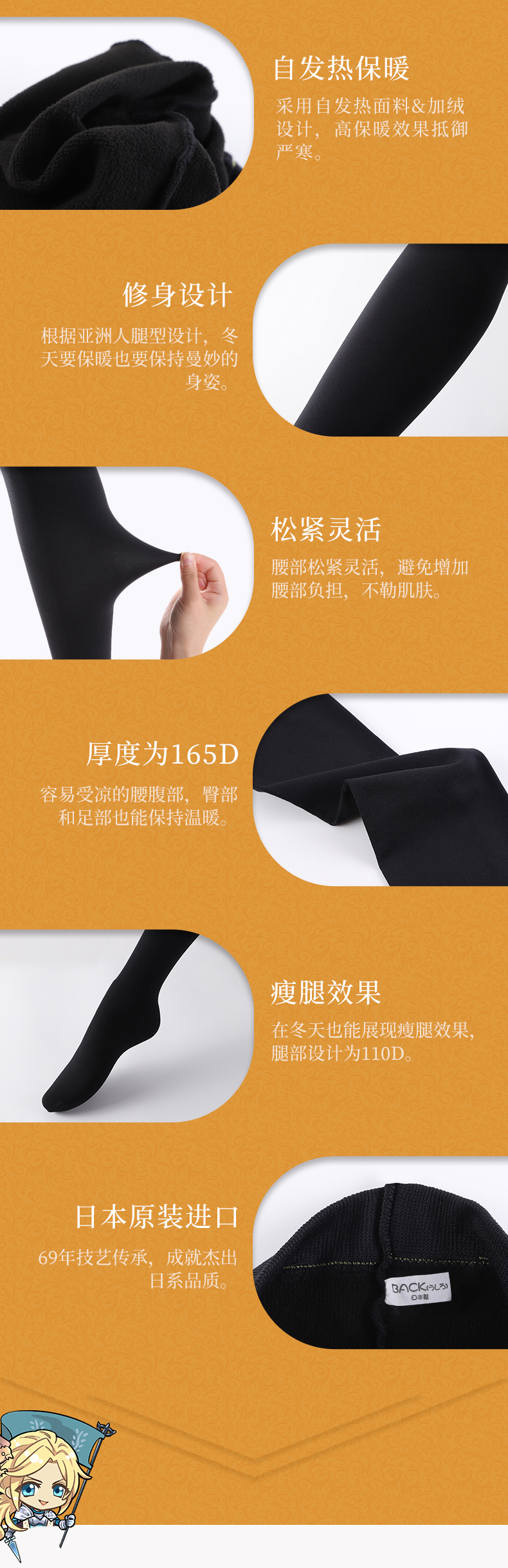 3、根据亚洲人腿型设计,修身提臀,腿部为110D,极致瘦腿,脚部加厚为 165D,温暖留存,锁住温度的同时保持纤细腿部,依旧美丽,在穿着厚重的冬天,尽情展现你的魅力。