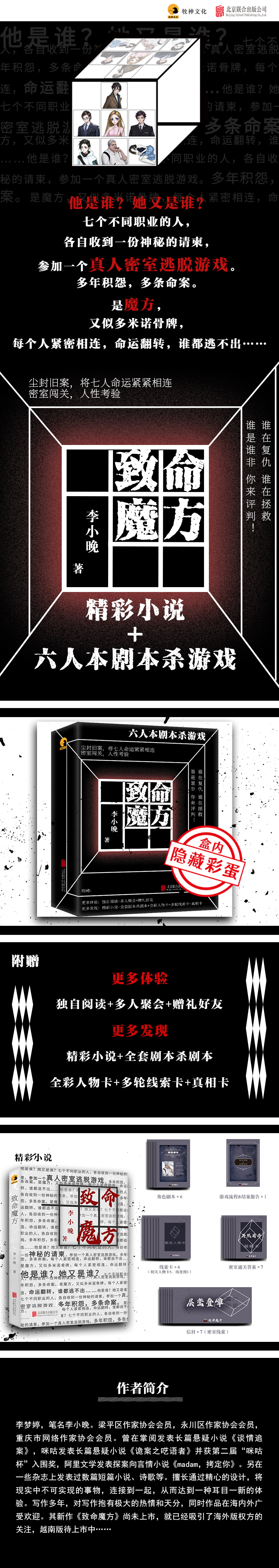 李梦婷,笔名李小晚。梁平区作家协会会员,永川区作家协会会员,重庆市网络作家协会会员。曾在掌阅发表长篇悬疑小说《谈情追案》,咪咕发表长篇悬疑小说《诡案之呓语者》并获第二届“咪咕杯”入围奖,阿里文学发表探案向言情小说《madam,拷定你》。另在一些杂志上发表过数篇短篇小说、诗歌等。擅长通过精心的设计,将现实中不可实现的事物,连接到一起,从而达到一种耳目一新的体验。写作多年,对写作抱有极大的热情和天分,同时作品在海内外广受欢迎。其新作《致命魔方》尚未上市,就已经吸引了海外版权方的关注,越南版待上市中……