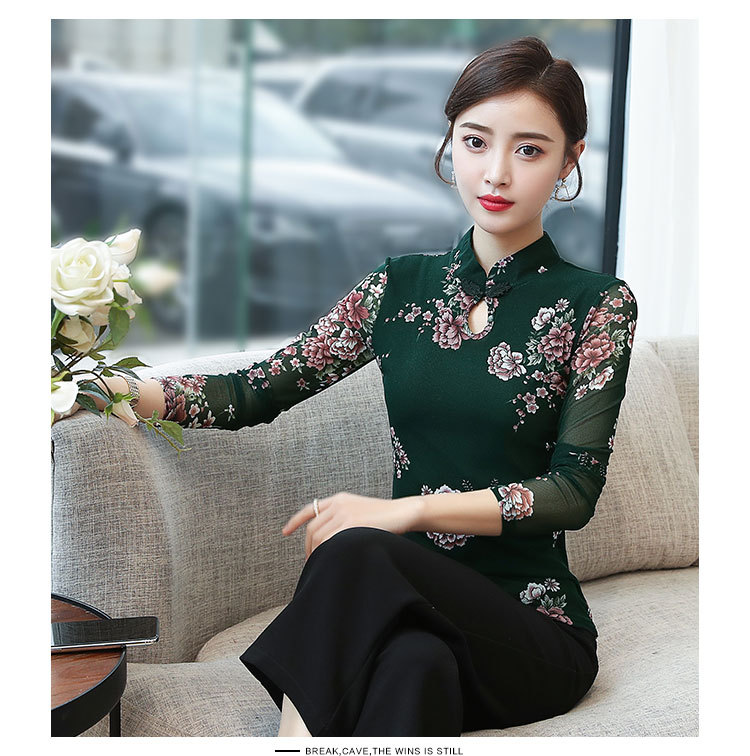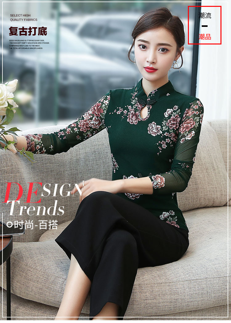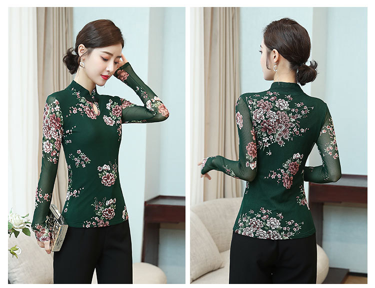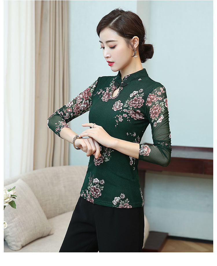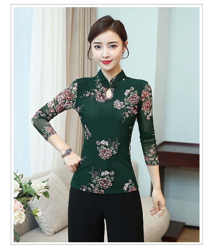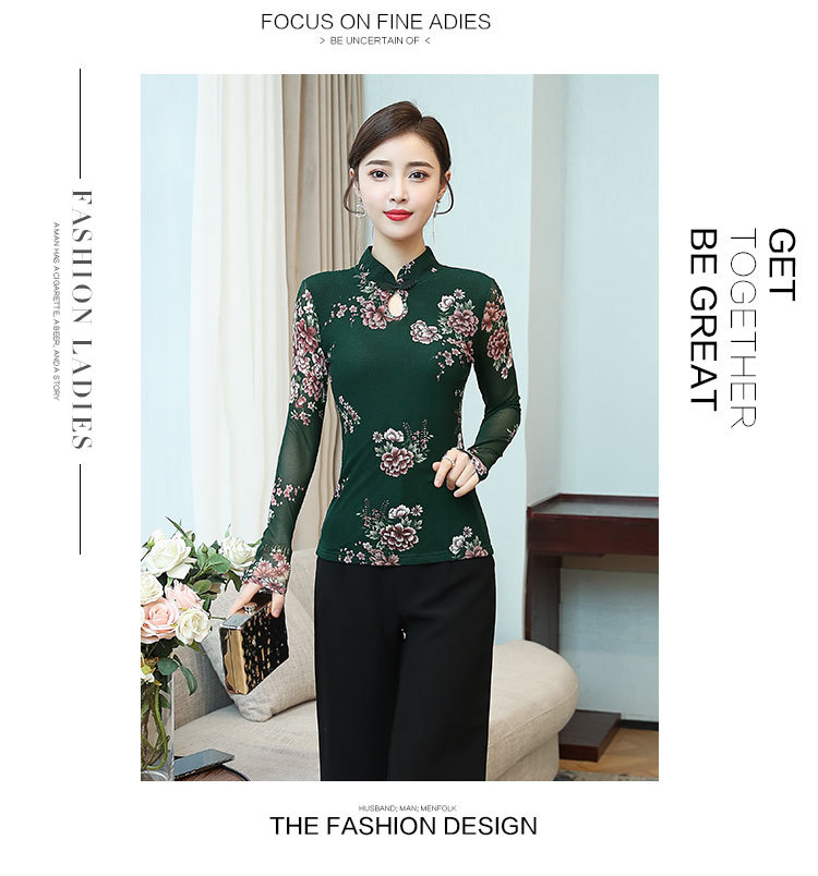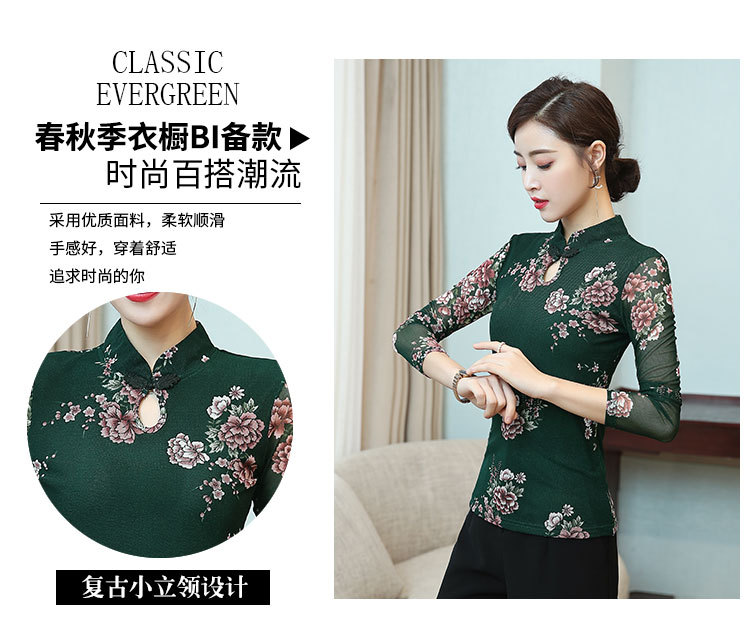 JL-571新款民族风立领 盘扣网纱蕾丝印花长袖女T恤