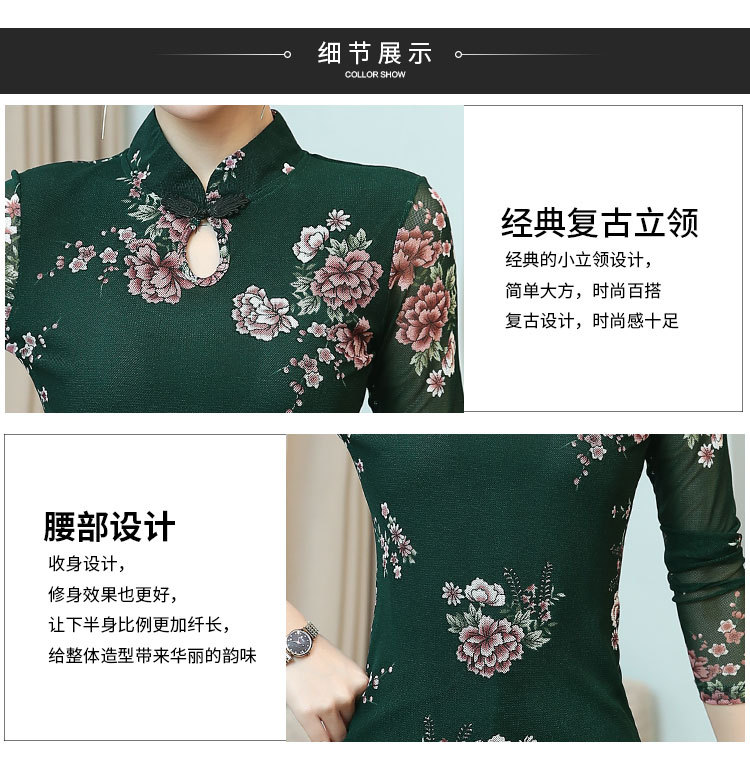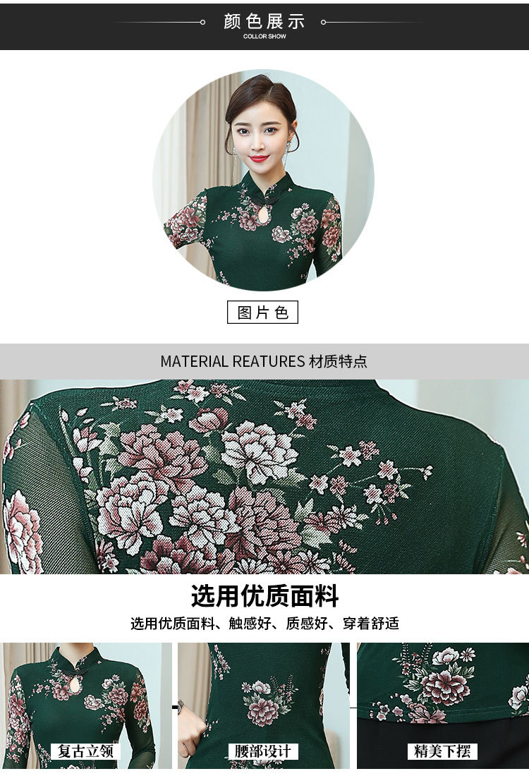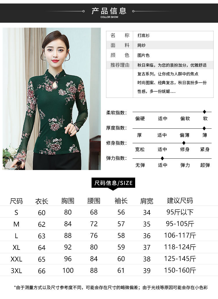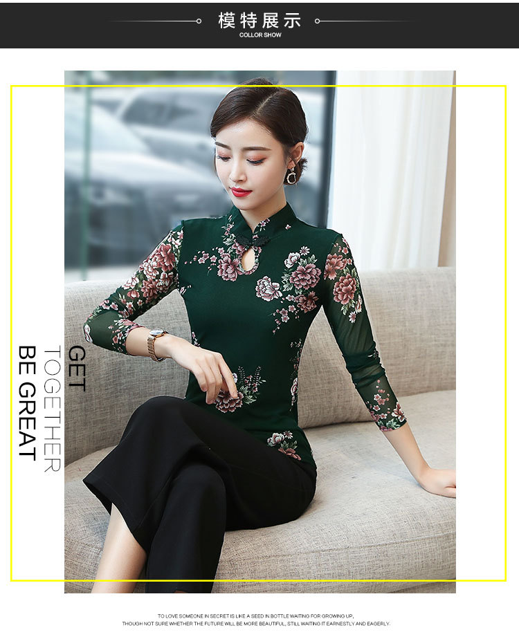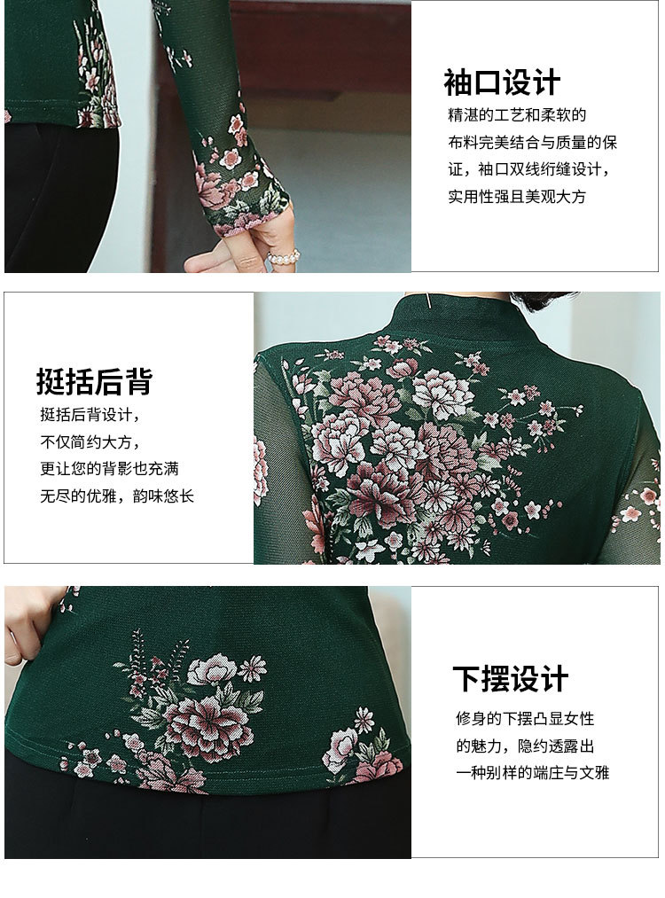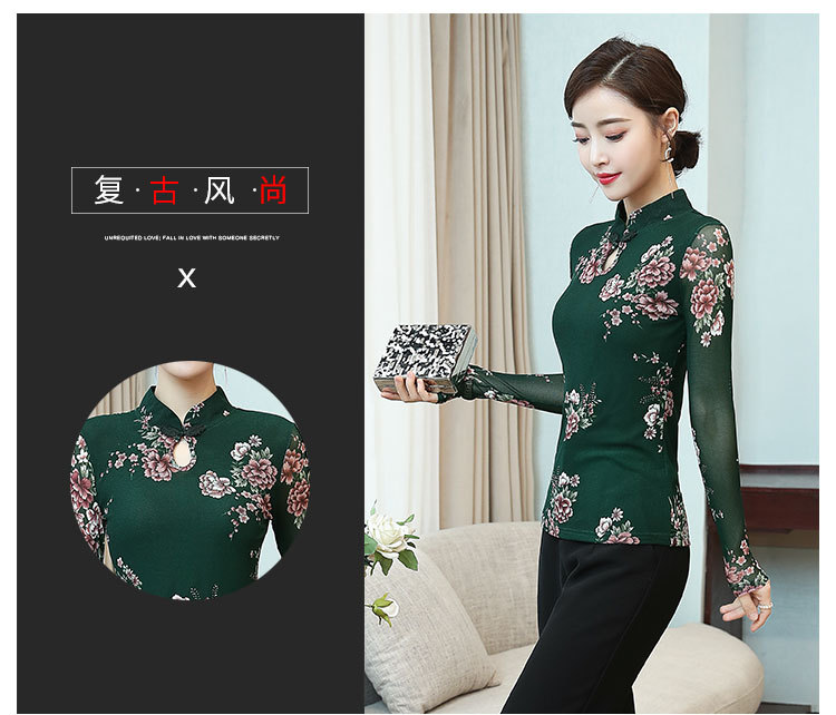 JL-571新款民族风立领 盘扣网纱蕾丝印花长袖女T恤