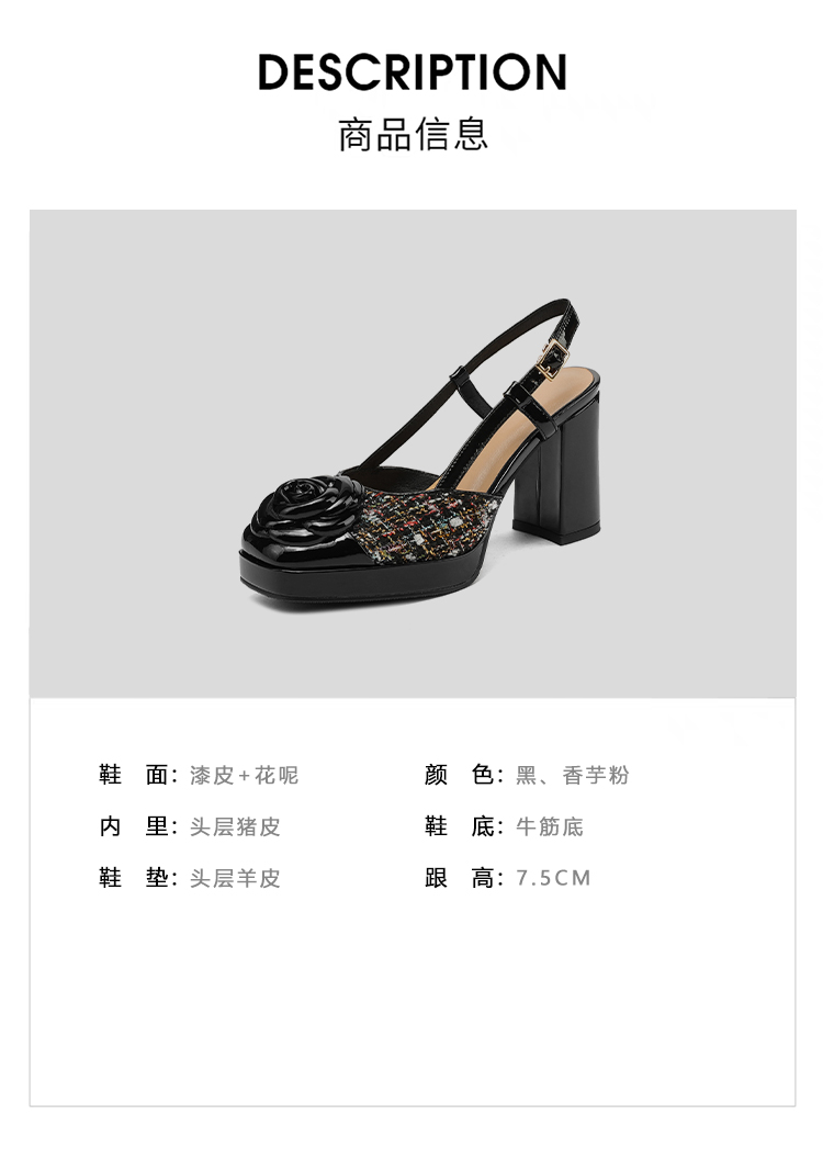 【货 号】T12【鞋面材质】漆皮+花呢【鞋里材质】头层猪皮【鞋垫材质】头层羊皮【鞋 底】牛筋底【掌 宽】8cm【跟 高】7.5cm【颜 色】黑色 香芋粉【尺 码】34-39