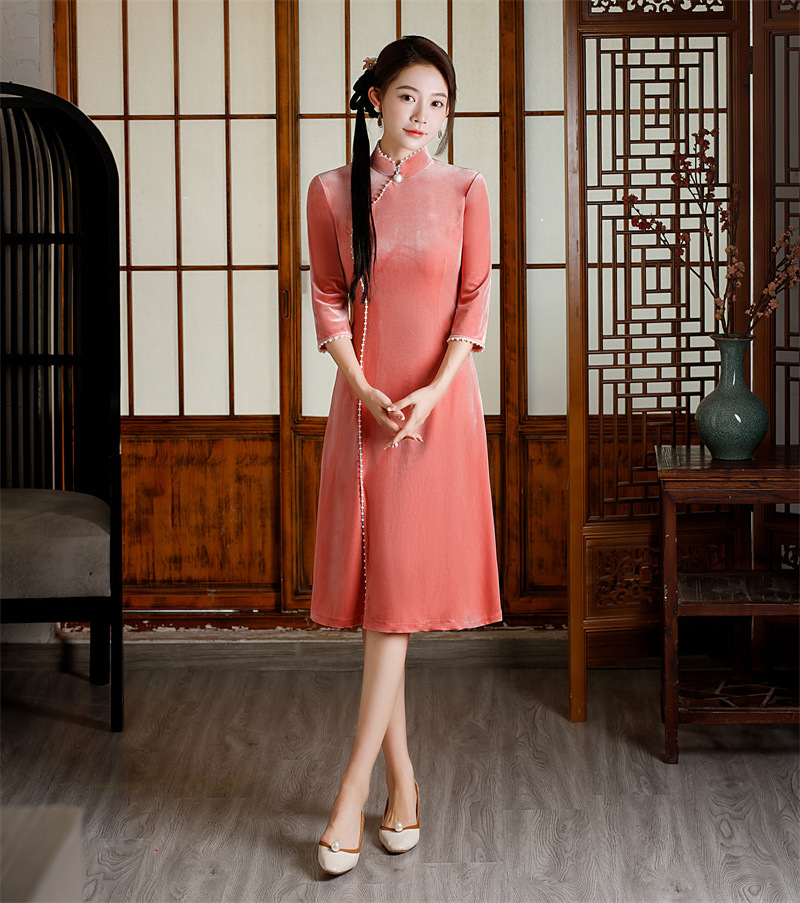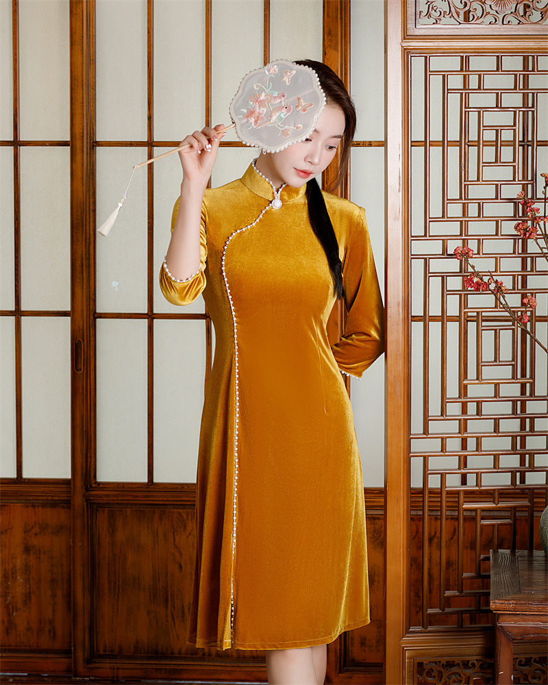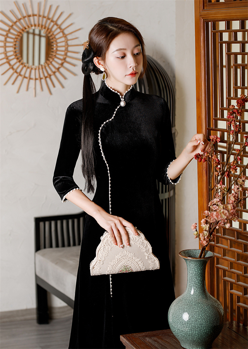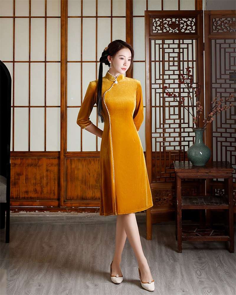 简单时尚A版七分袖丝绒旗袍2022秋冬新款改良现代女士日常旗袍裙GX