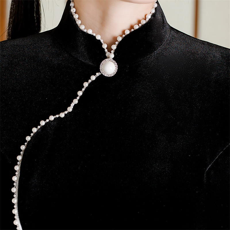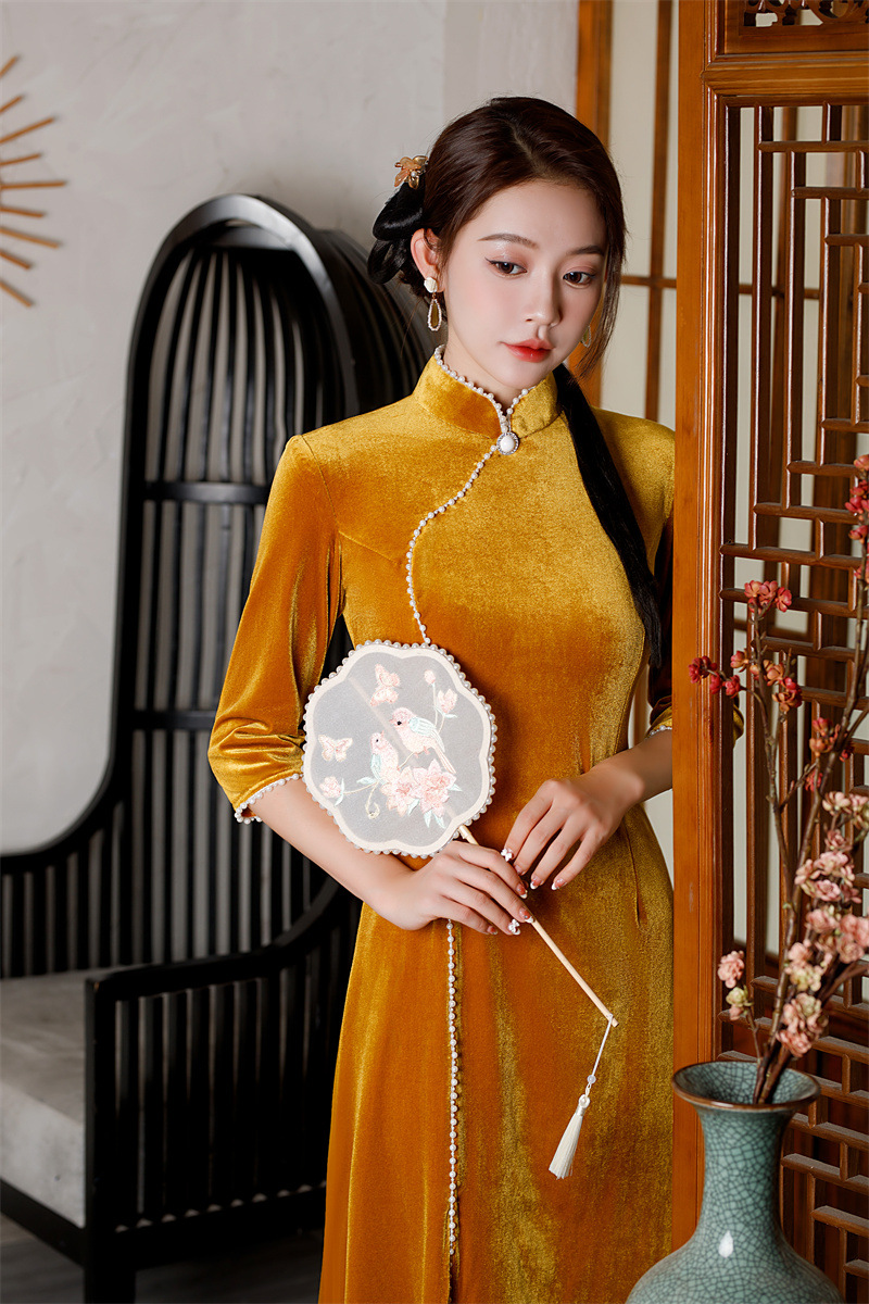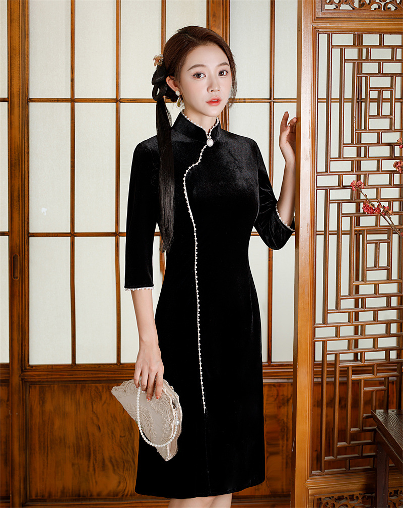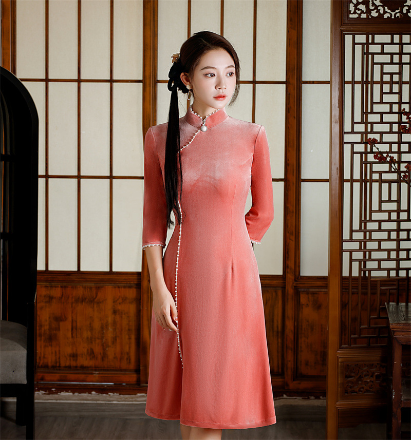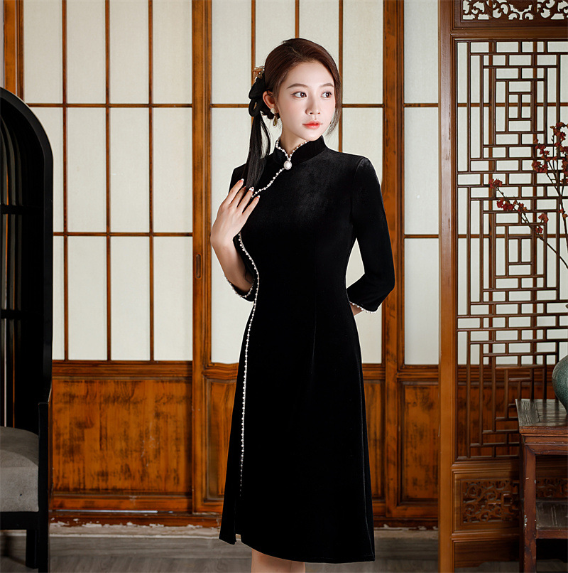 简单时尚A版七分袖丝绒旗袍2022秋冬新款改良现代女士日常旗袍裙GX