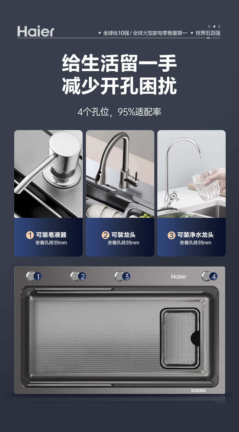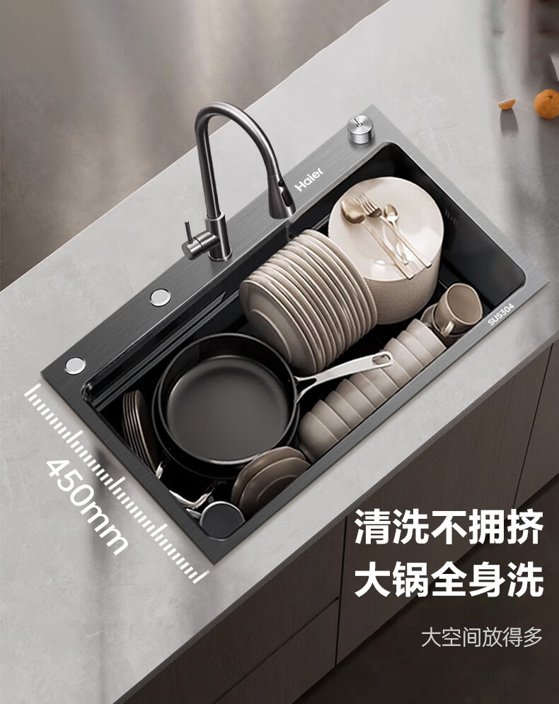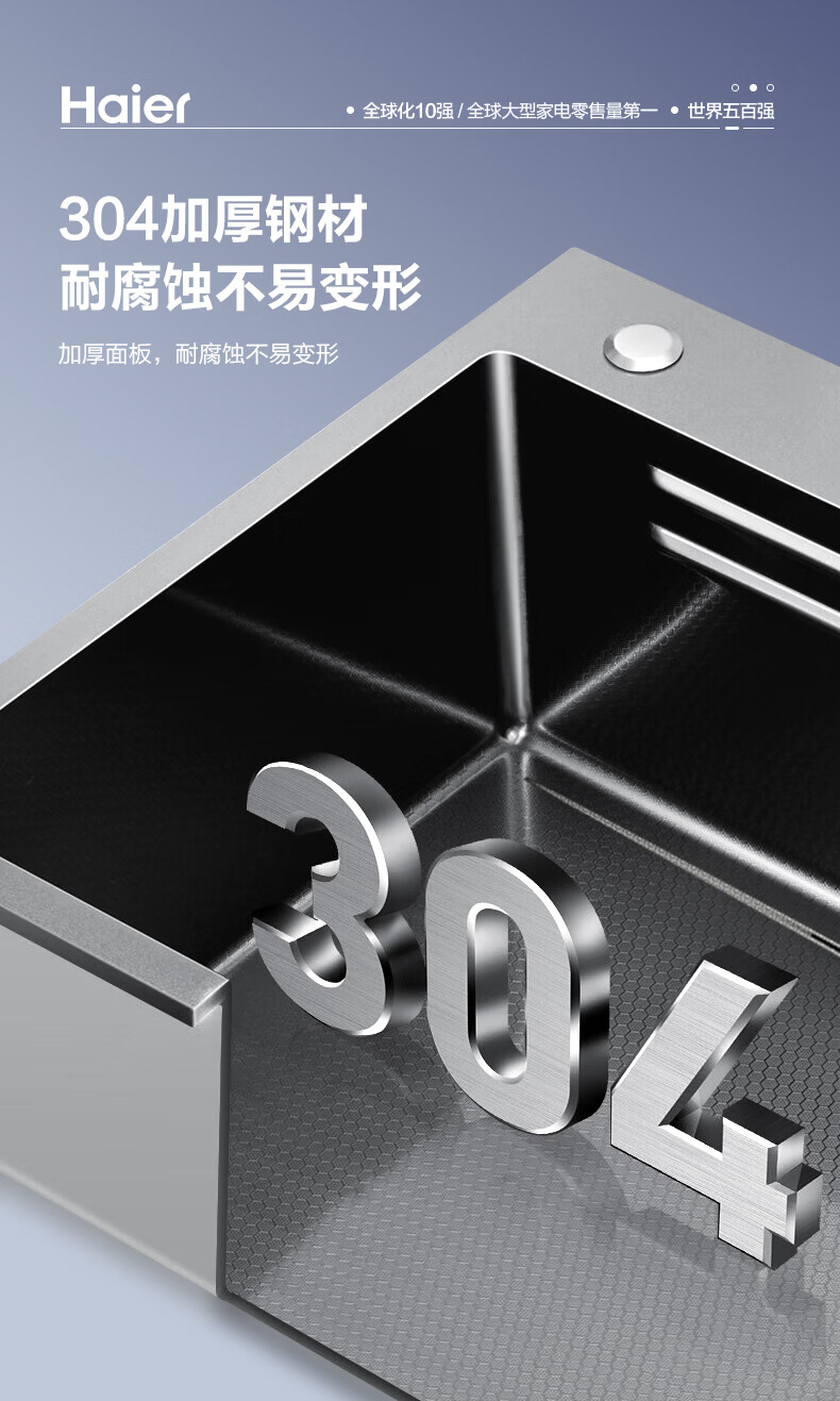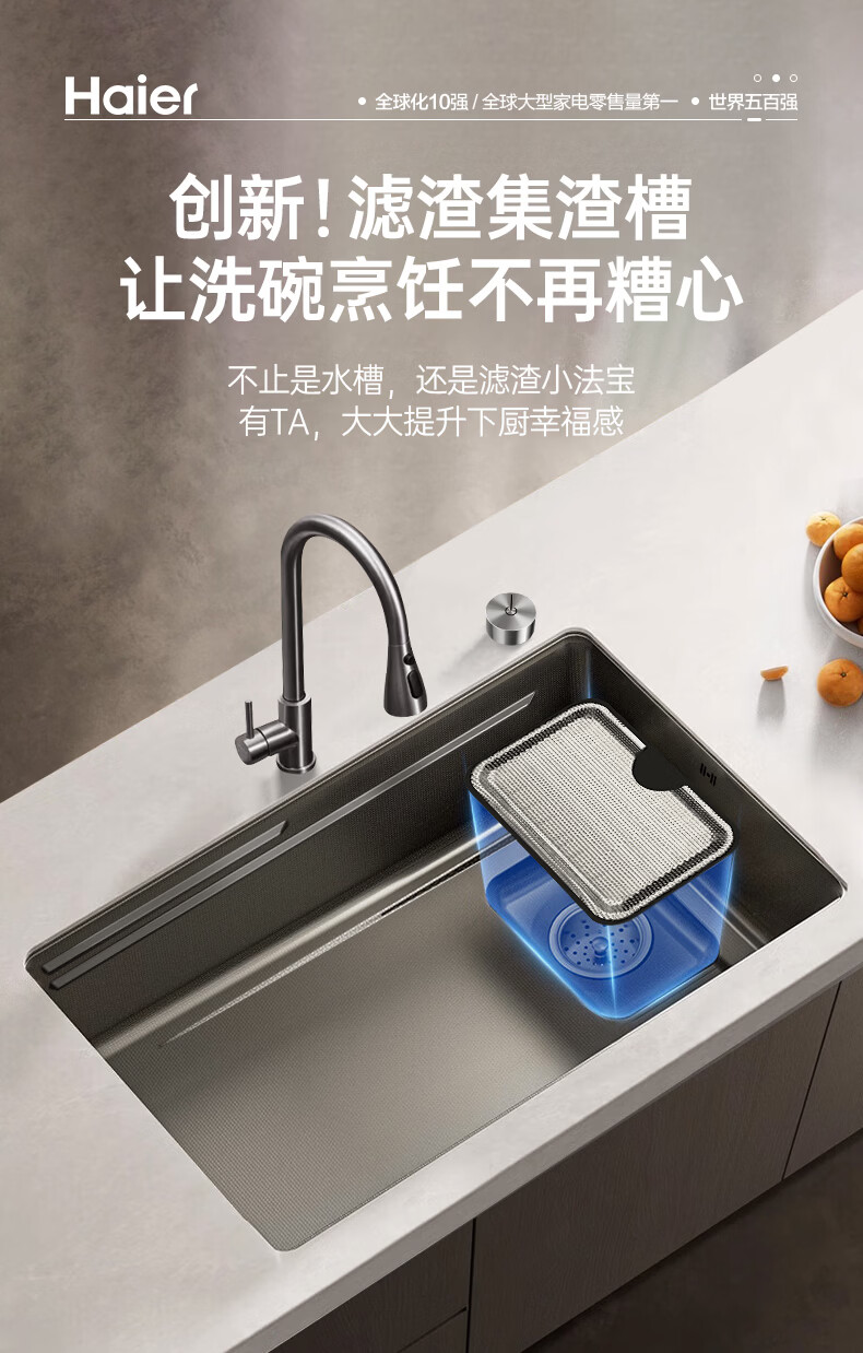 海尔水槽大单槽洗菜盆一体盆单槽厨房304不锈钢水槽双重滤渣洗碗槽
