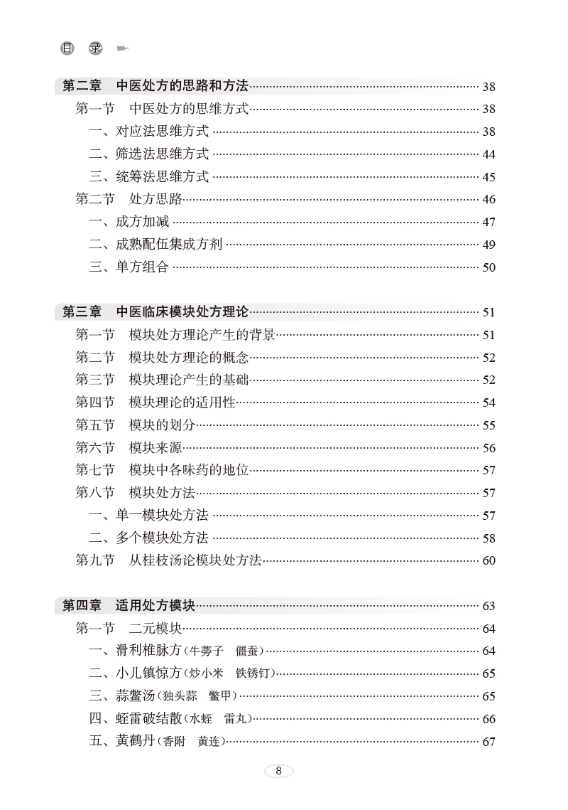 本书系统介绍了山西省名中医王树国教授在30余年临床实践基础上总结的创新性处方方法,继承历代名医对药、对方的学术经验,紧紧围绕对应关系,探讨处方的思路和方法,初步构建并分析了模块处方理论,归纳了95个常用模块(包括小成方、验方及成熟固定配伍等),按照中医内科学传统分类,围绕75例病案,精细示范了在辨证论治和君臣佐使理论指导下的模块集成方剂的临证处方策略,结构清晰,逻辑严密,简明实用,有一定的指导价值。