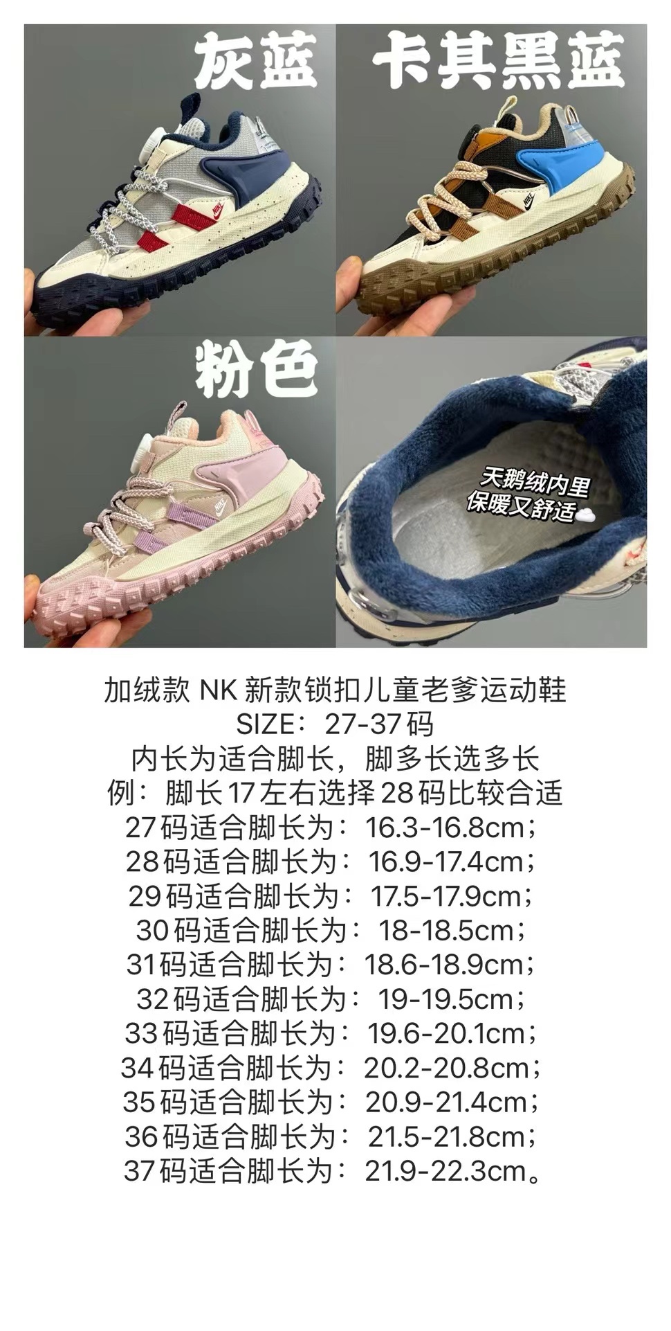 福利款~ 耐克Nike加绒款登山鞋儿童老爹鞋 内里保暖绒特别的细腻亲肤,上脚不会有扎脚的感觉和任何不适~ 旋钮科技设计,一提即开,一旋即紧,便携好穿脱!