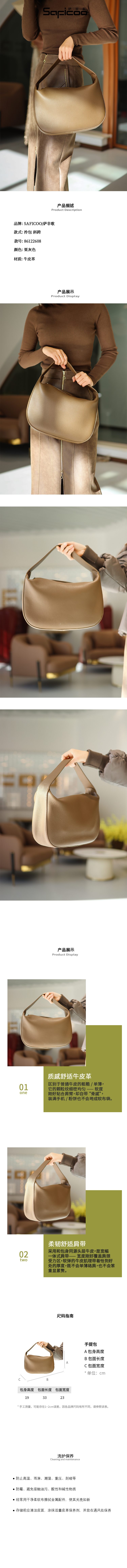 SAFICOO 慵懒风焦糖棕头层牛皮半月宽肩带单肩包