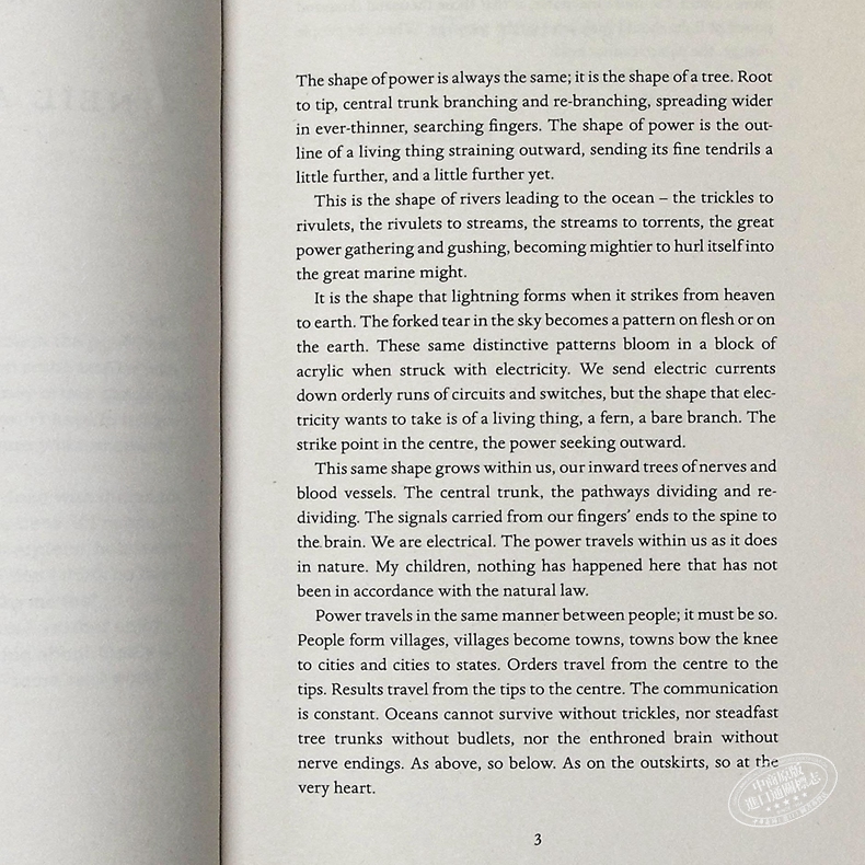 为了追踪这种新能力在家庭和政府间的急速发展,故事的叙述从一个美国女孩的卧室跳转到了英国黑帮的藏身之处,又切换到了欧洲的森林和其他地方。男性的自信心因此受挫,激怒了他们的大男子主义,男权政治彻底被颠覆。这个令人吃惊又充满煽动性的故事不仅解构了明显具有性别歧视的表达,并且解析了我们几个世纪以来忍受、尊重甚至幻想的内部权力架构。