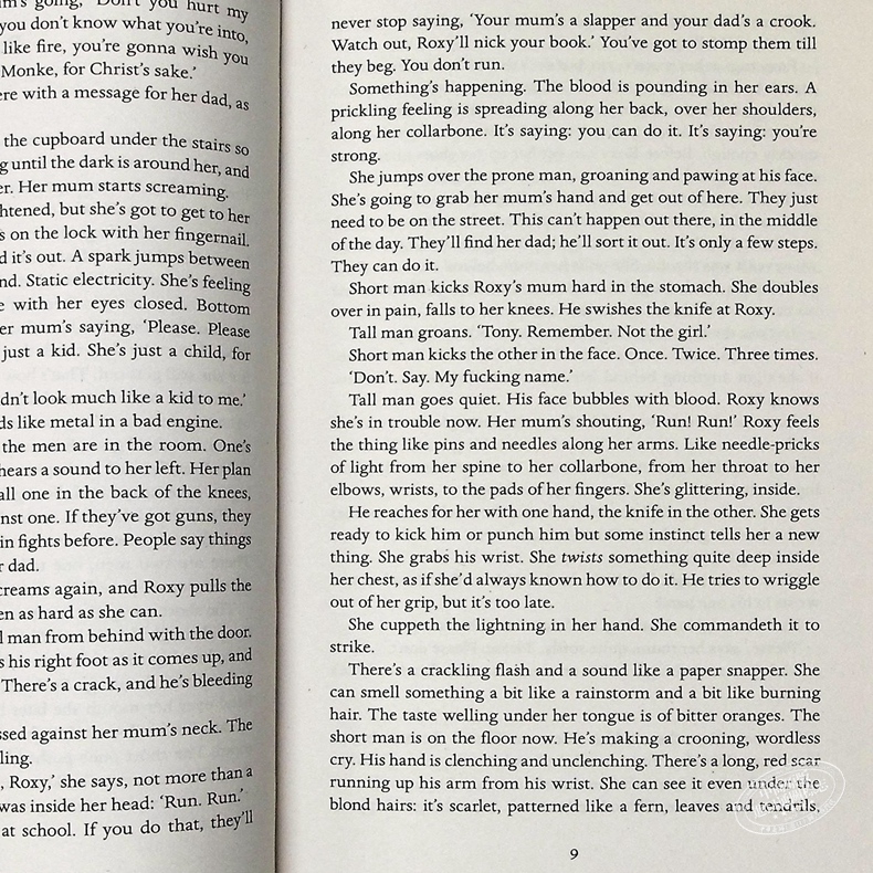 这部作品的亮点在于充满了各种“带电的”讽刺,让你觉得必须要带上“绝缘手套”才能读下去。有些内容“电力”微弱,难以察觉,比如阿尔德曼在书中描述了一个严肃的女性和她英俊的男性搭档共同主持的新闻节目;但有些情节“电力”强劲,让人汗毛直立,比如她对于那些四处漫游、嗜血暴力的女性所犯下的战争罪行的描写。
