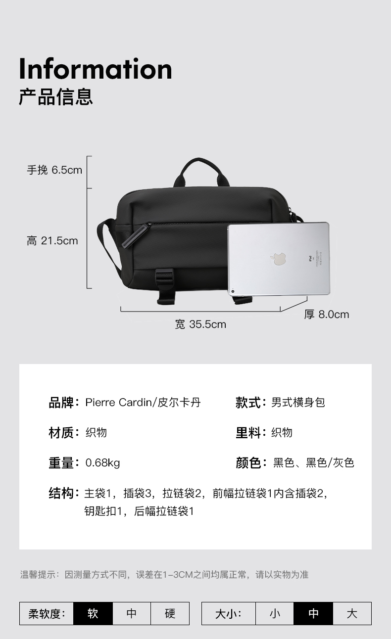 皮尔卡丹simplify系列 日式立体横身包男士斜挎包