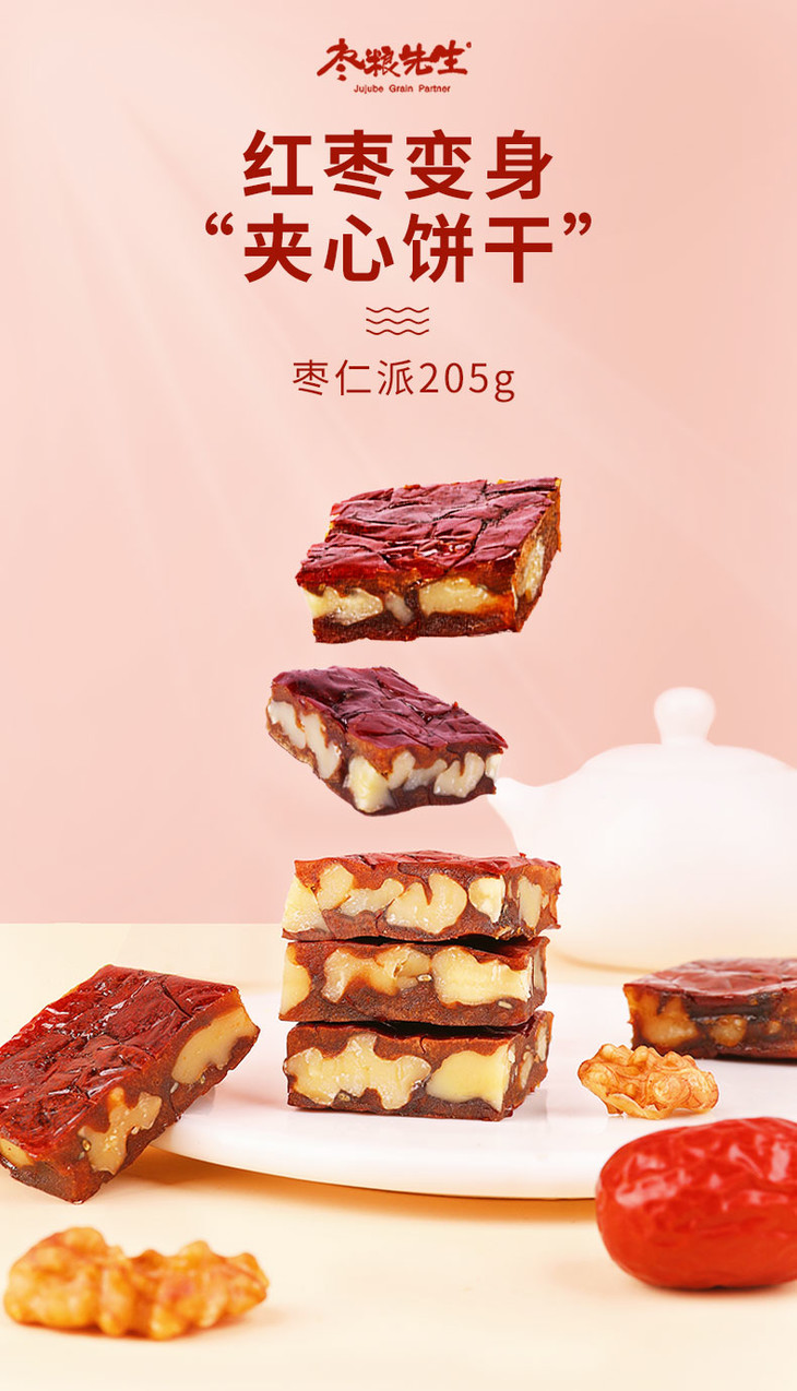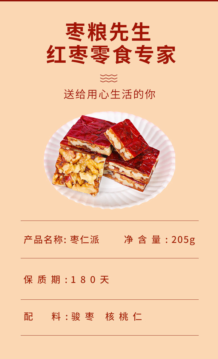 【配料干净无糖】枣粮先生核桃枣仁派 红枣夹核桃新吃法 入口香醇有层次 香甜枣肉酥脆核桃 配料简单无添加 仅有红枣核桃仁 独立真空锁鲜小包装 开袋即食 205g/包