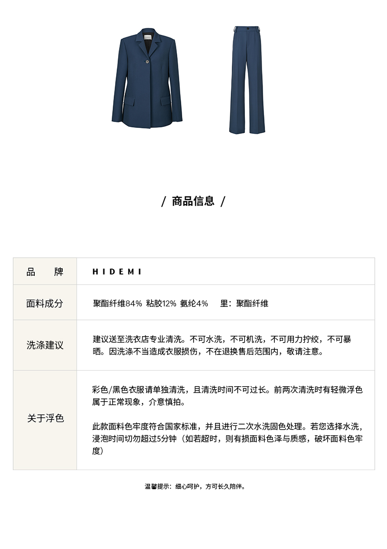 HIDEMI夜蓝一粒扣西装套装 一粒扣西装/长裤