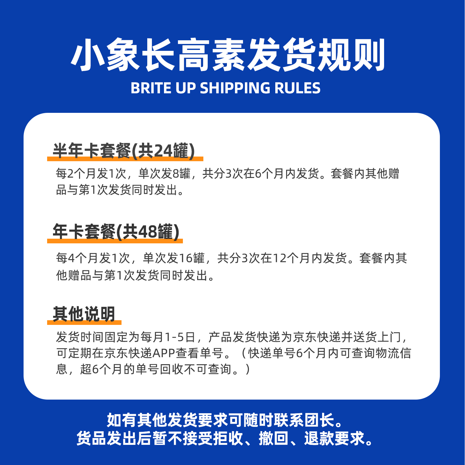 *半年卡、年卡套餐默认按周期分批发货,平均每2个月发货8罐,分批发完。如有需要一次性发货的或其他数量分批发货的都可联系您的专属客服。