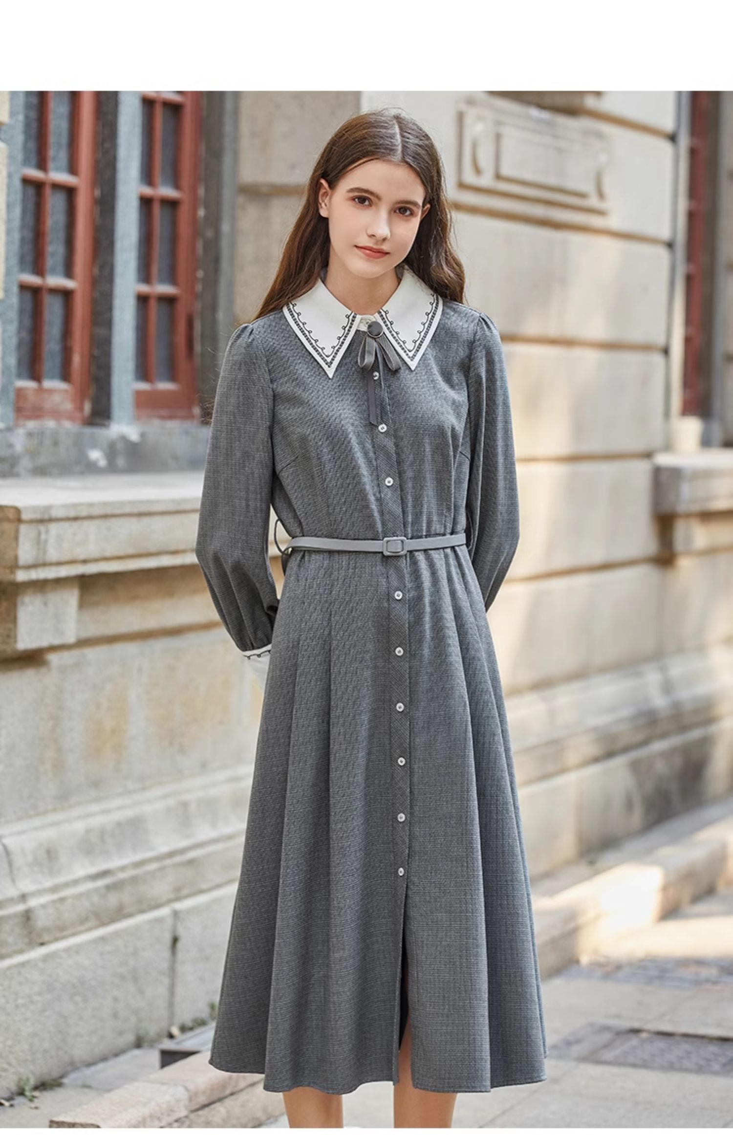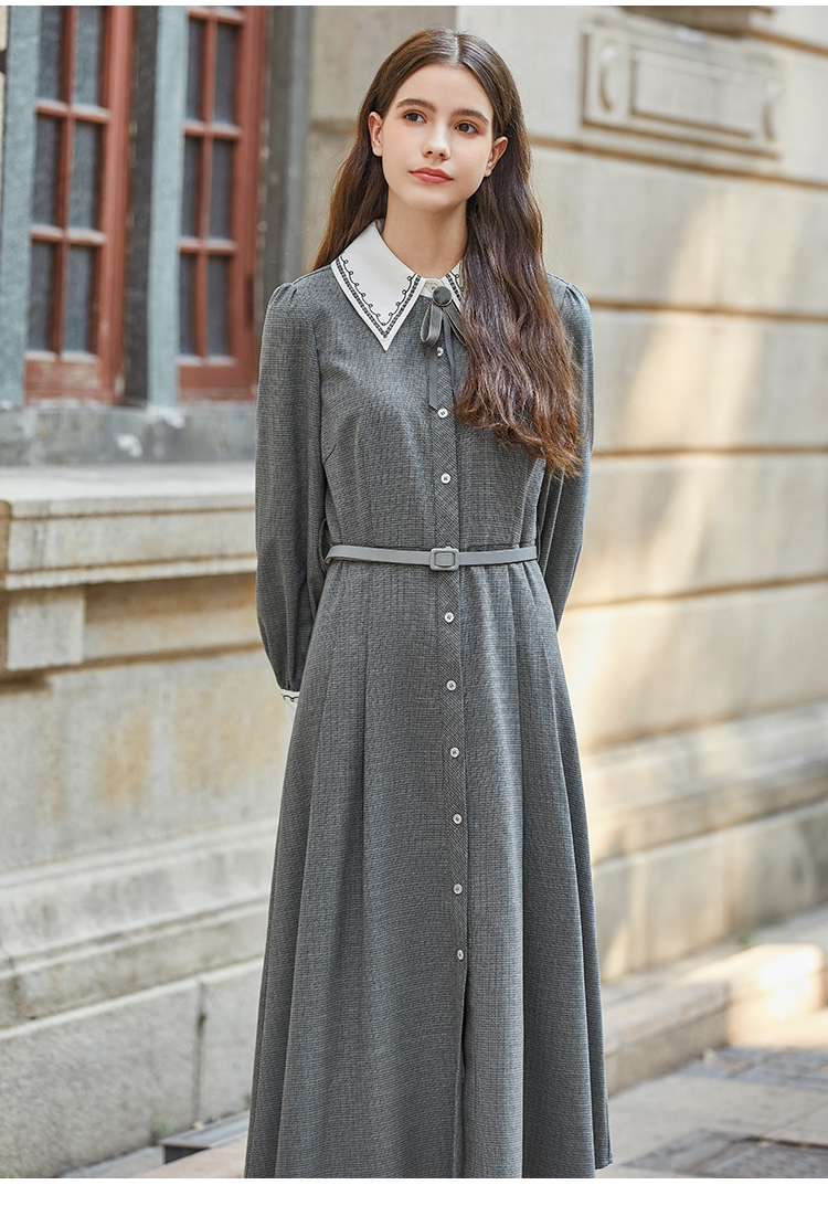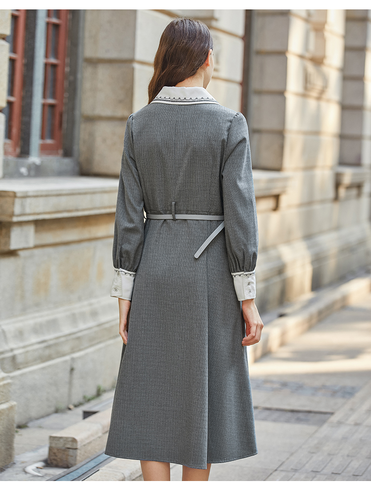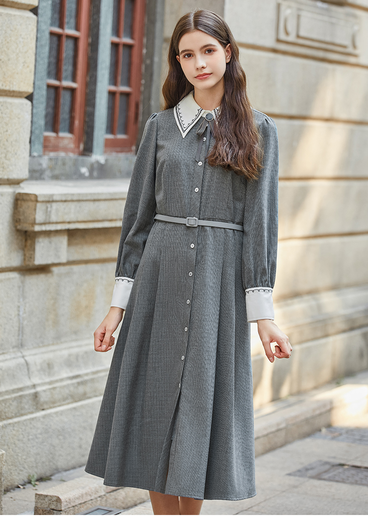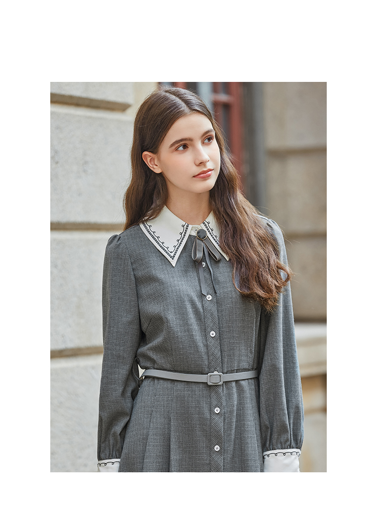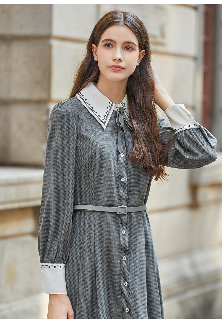 Famecoco范可儿撞色刺绣气质通勤衬衫裙冬FAB8FA020