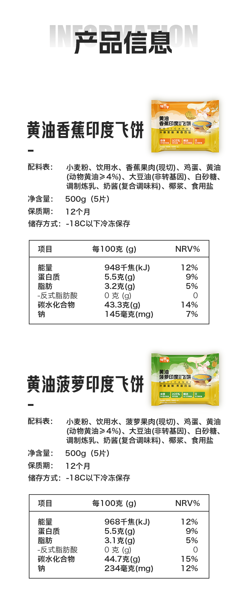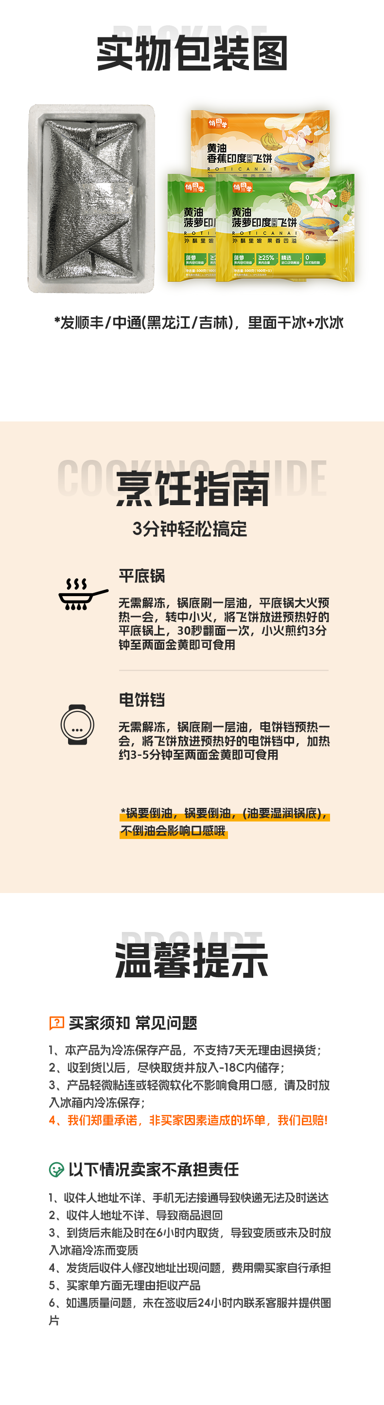 | 【品名】饼同学黄油印度飞饼 【规格】 香蕉味(500g/袋)1袋5片 菠萝味(500g/袋)1袋5片 【保质期】12个月 【储藏方式】请置于-18℃冷冻保存 【产地】四川遂宁 【发货地】全国13仓就近发货 【发货快递】顺丰速运 【不发地区】新疆、西藏、港澳台不发 【发货时效】48-72小时发货,节假日顺延 |
