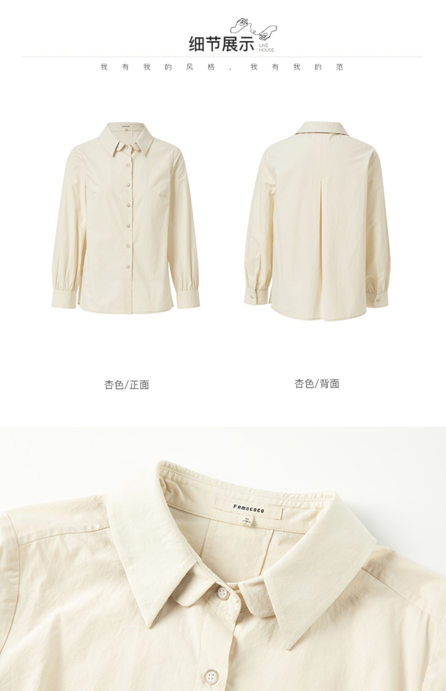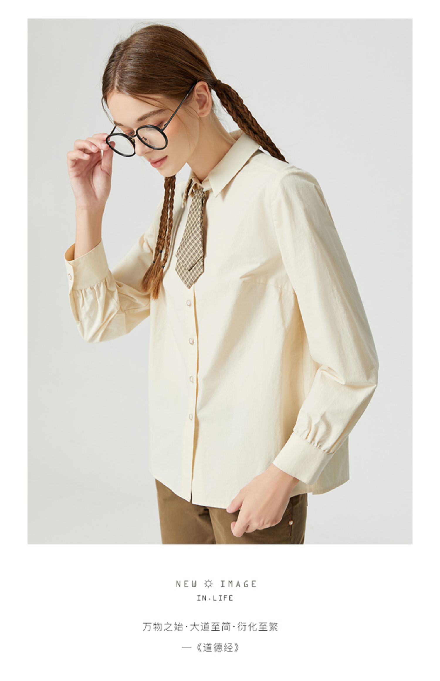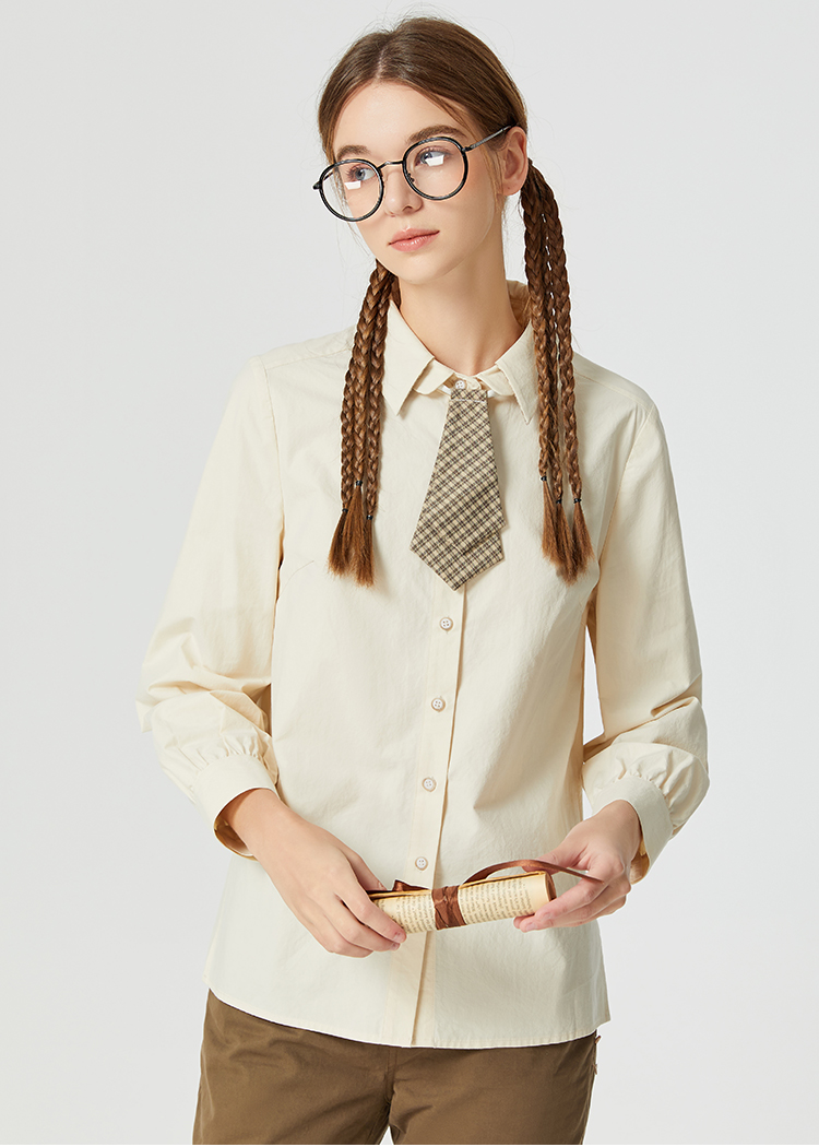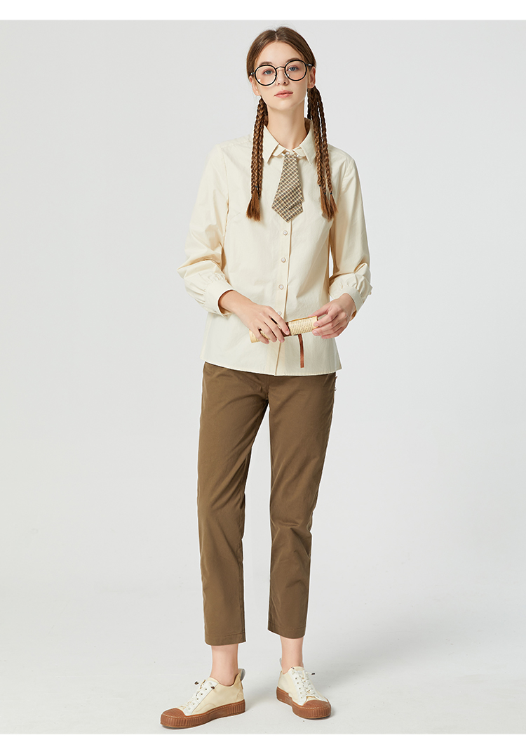 famecoco范可儿原创纯棉衬衫带领带女早秋双层领衬衣杏色百搭长袖F225BH006