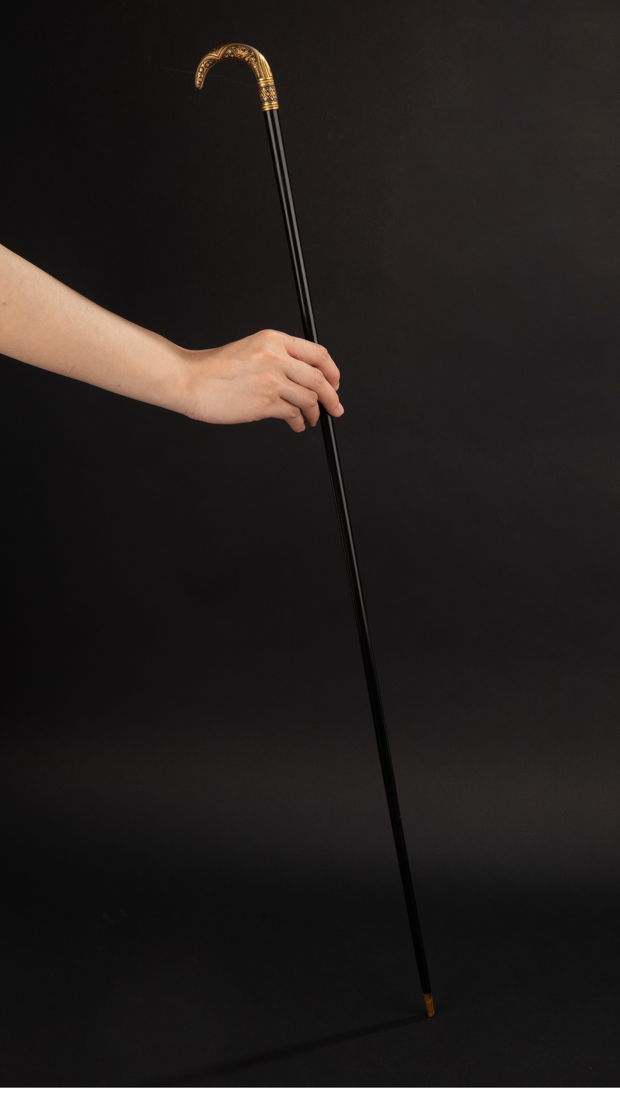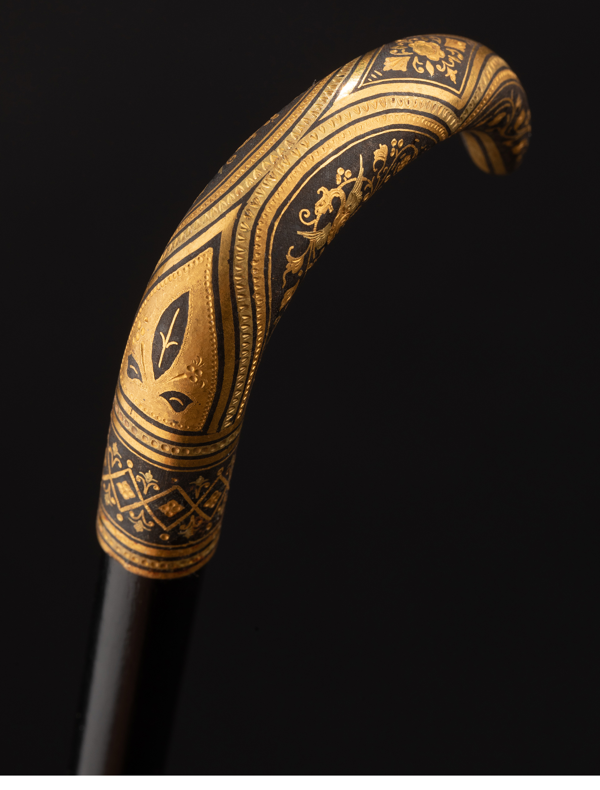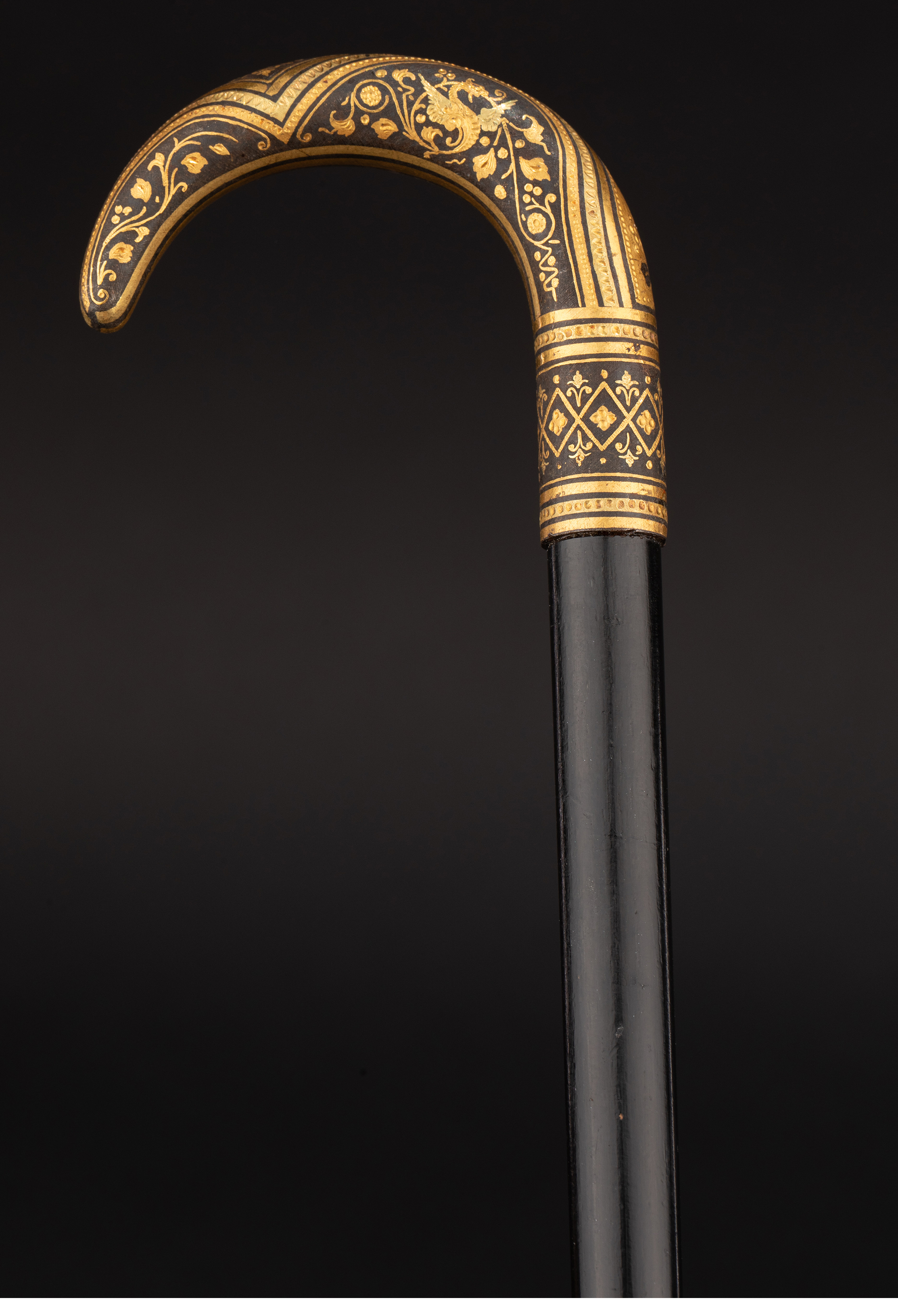 1900年代西班牙出品卷叶花卉纹饰托莱多钢镶嵌黄金杖柄硬木古董手杖