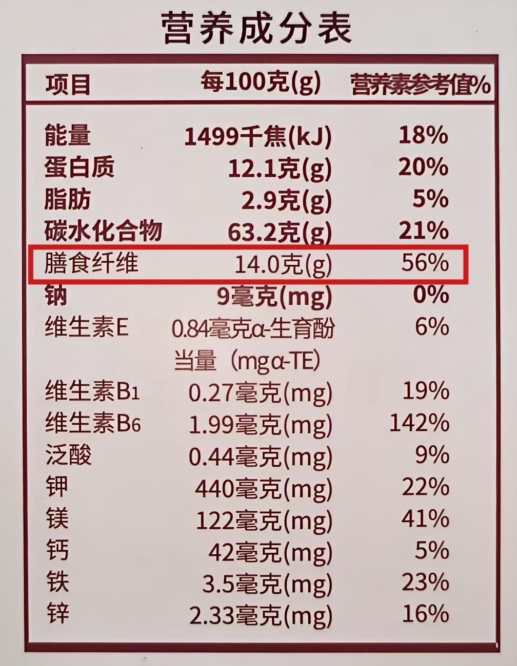 高膳食纤维52%nrv,含有维生素B族与矿物质镁、铁、锌、硒。