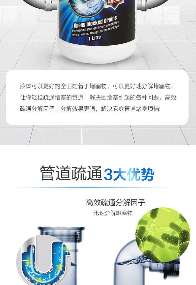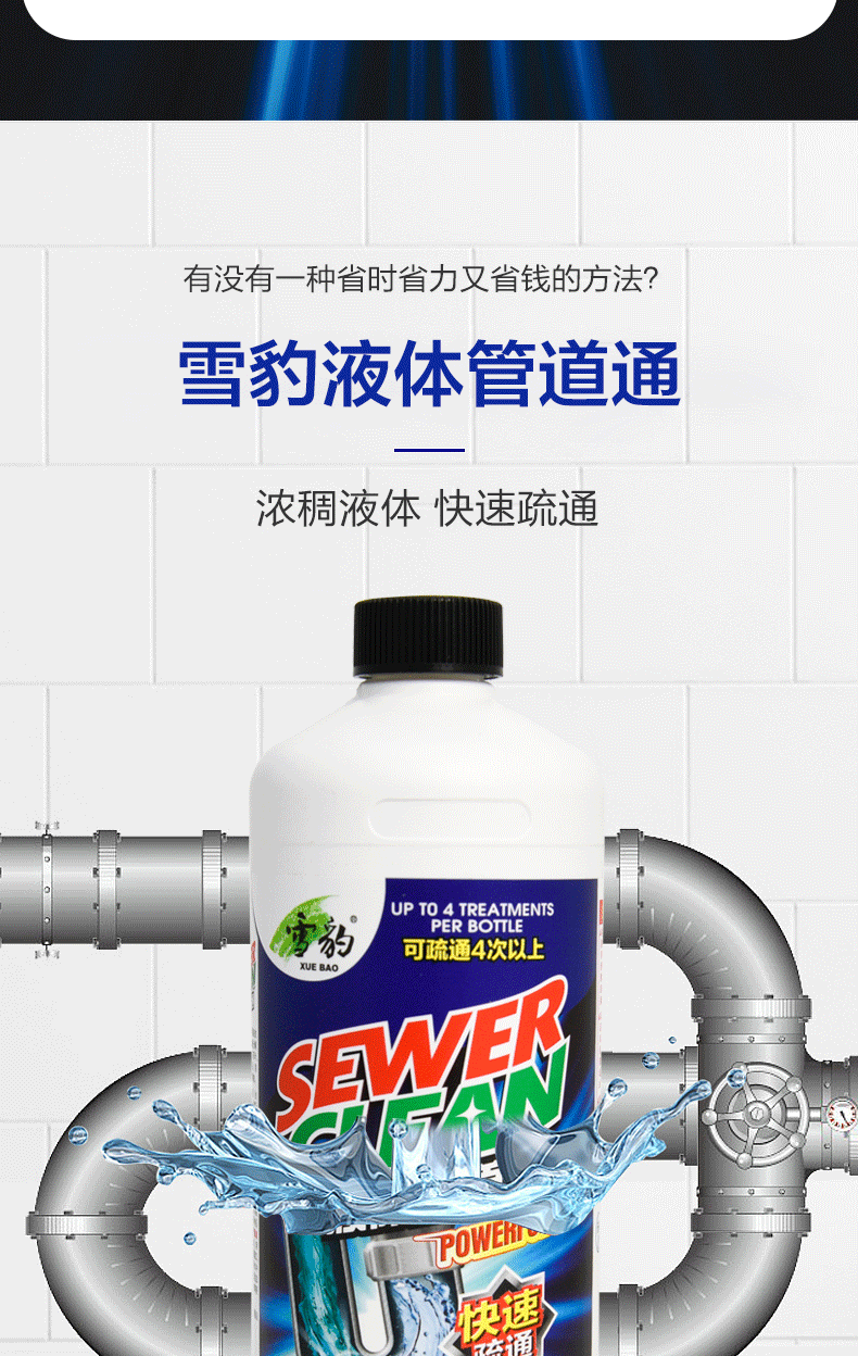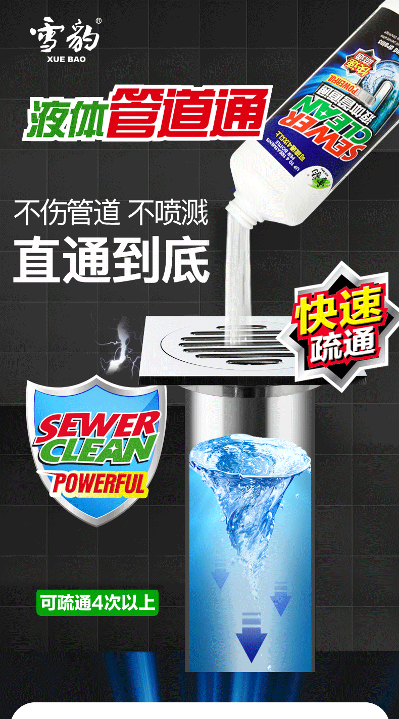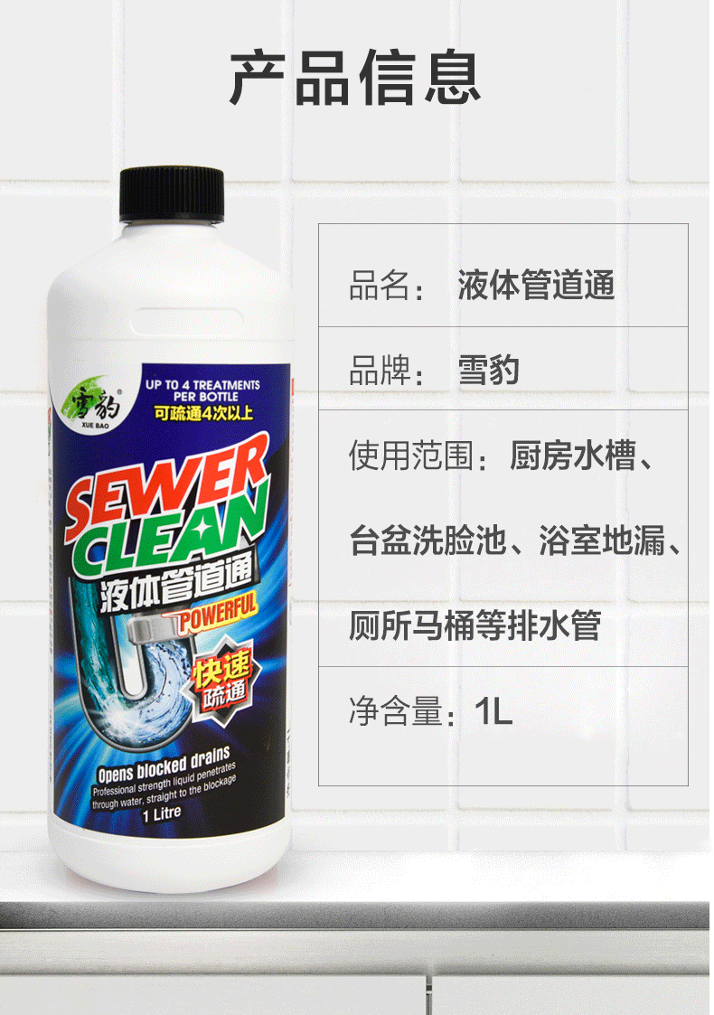 雪豹 液体管道疏通剂下水道疏通剂1L装马桶坐便器座便器管道通3342