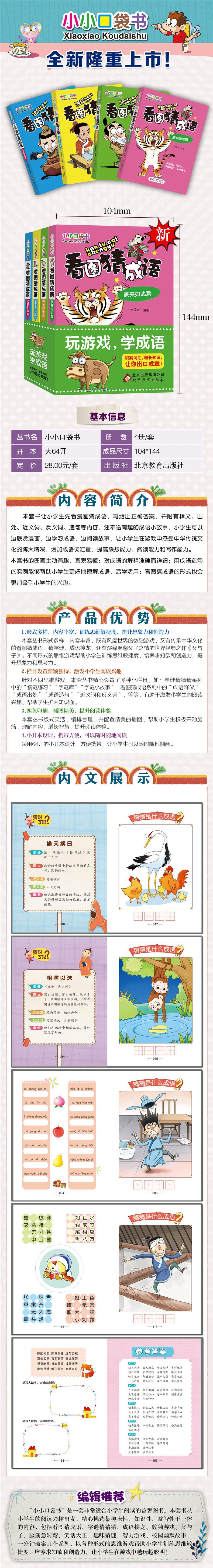 本套书让小学生先看漫画猜成语,再给出正确答案,并附有释义、出处、近义词、反义词、造句等内容,还奉送有趣的成语小故事,小学生可以边欣赏漫画,边学习成语,边阅读故事,让小学生在游戏中感受中华传统文化的博大精深,增加成语词汇量,提高联想能力、阅读能力和写作能力。本套书的图画生动有趣,直观易懂;对成语的解释准确而详细;用成语造句的实例能够帮助小学生更好地理解成语,活学活用;看图猜成语的形式也会更加吸引小学生的兴趣。