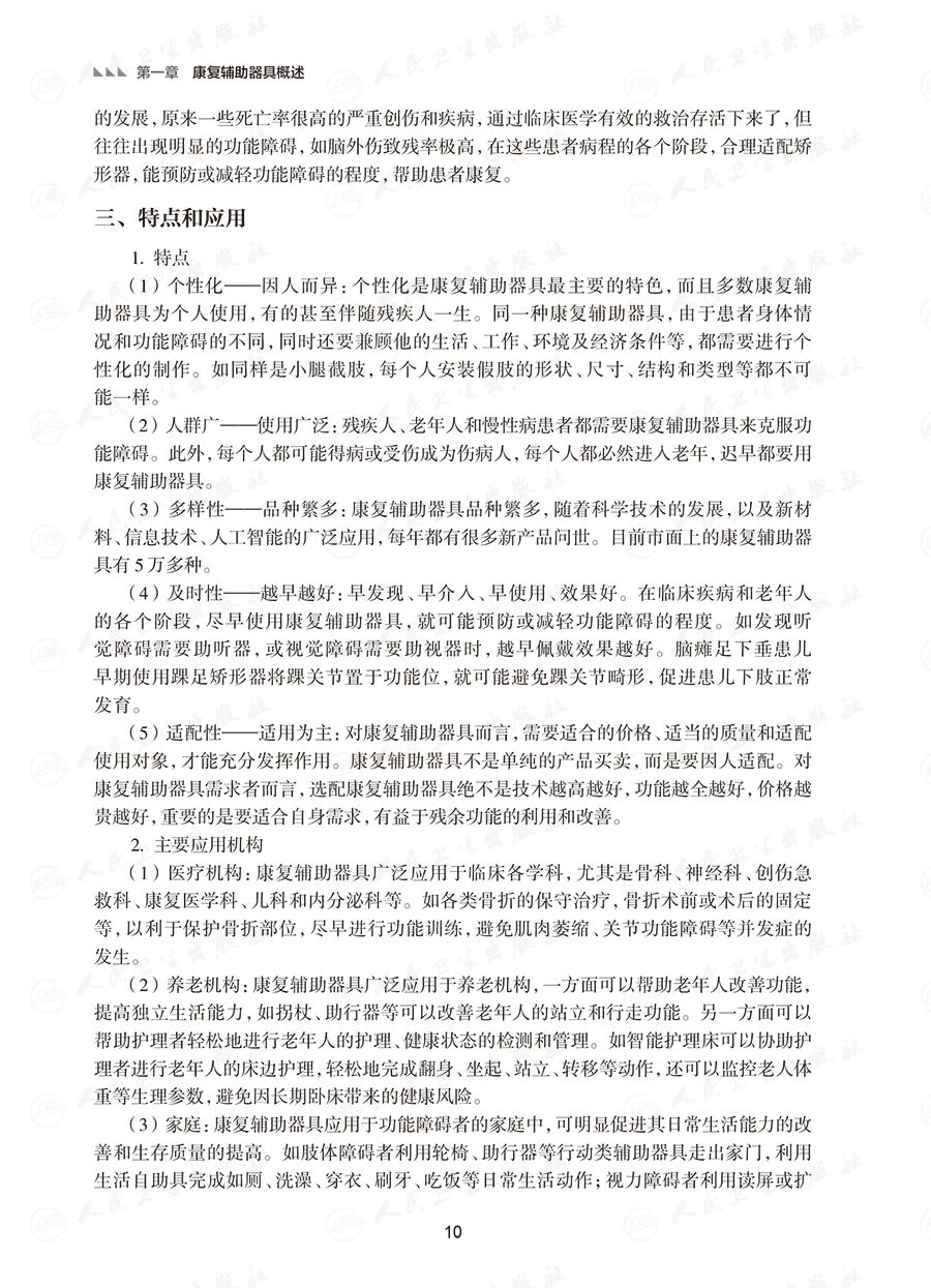 可以说,每个人的一生中总有一个阶段需要康复辅助器具,比如发生疾病、外伤、老年后功能减退等,都需要某一种或几种康复辅助器具来改善、提高或代偿降低的功能。因此康复辅助器具的临床应用对于患者、功能障碍者和老年人最大限度地改善功能障碍、提高生活自理能力、早日返回家庭和工作岗位具有十分重要的作用。