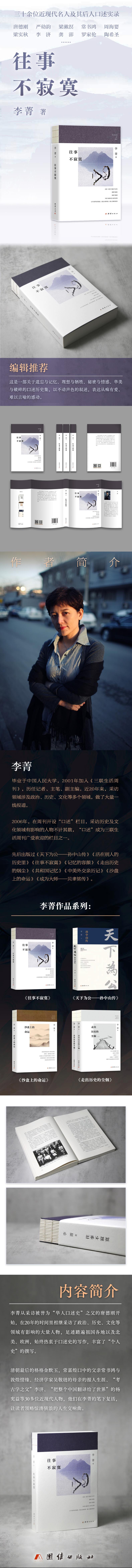 李菁从采访被誉为“华人口述史”之父的唐德刚开始,在20年的时间里相继采访了政治、历史、文化等领域有影响的大量人物,足迹踏遍祖国各地以及北美、欧洲,始终热衷于口述史的写作,丰富了“个人史”的撰写。清朝最后的格格金默玉, 常嘉煌口中的父亲常书鸿与敦煌情缘、经济学家吴敬琏的母亲的报人生涯、“考古学之父”李济、“把整个中国翻译给了世界”的杨宪益等30多位近现代人物,他们在李菁的笔下复活,让读者领略惊涛骇浪的人生交响曲。