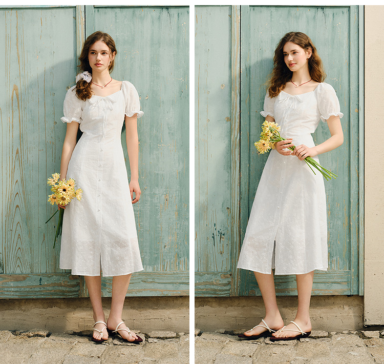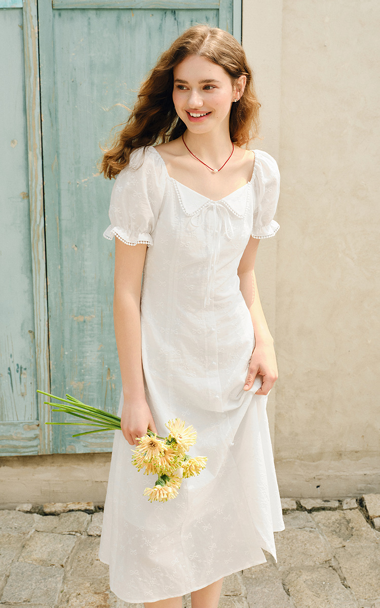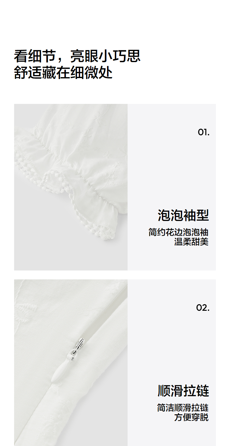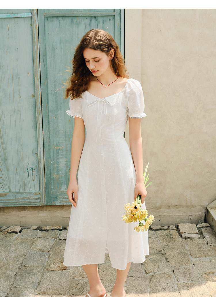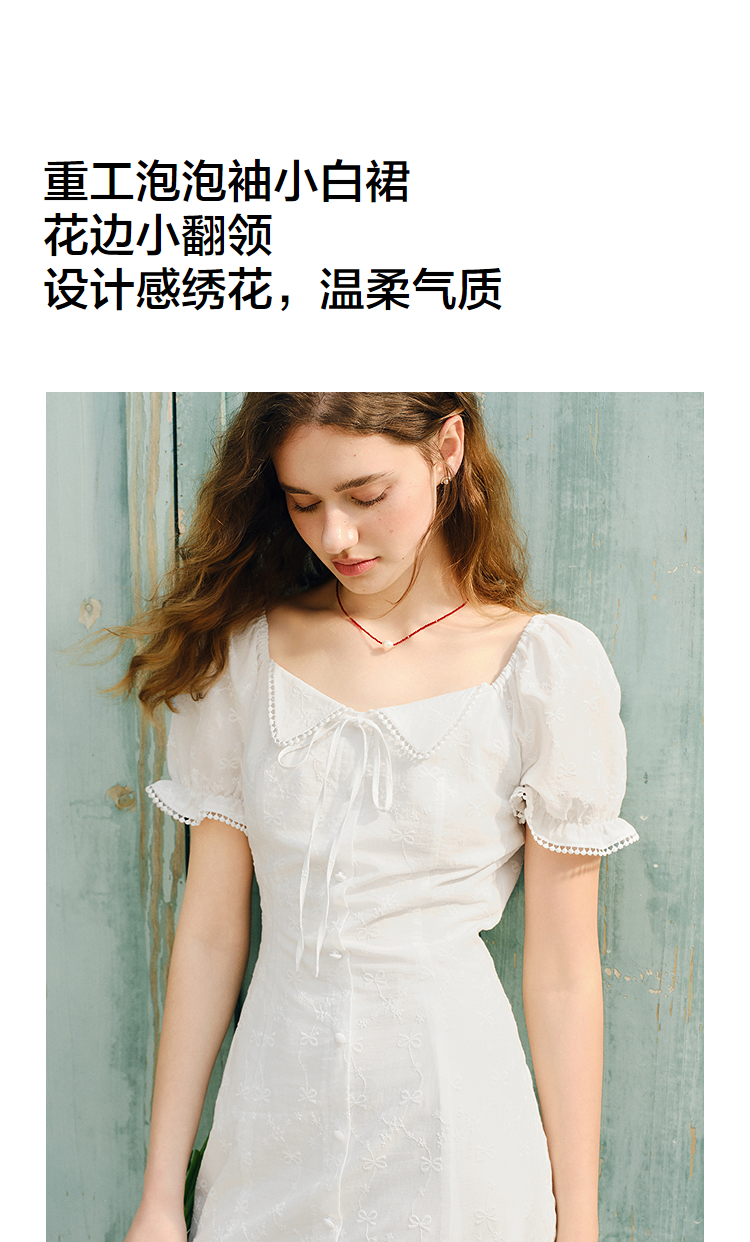 森马连衣裙女设计感重工绣花气质夏2025新款花边翻领泡泡袖小白裙