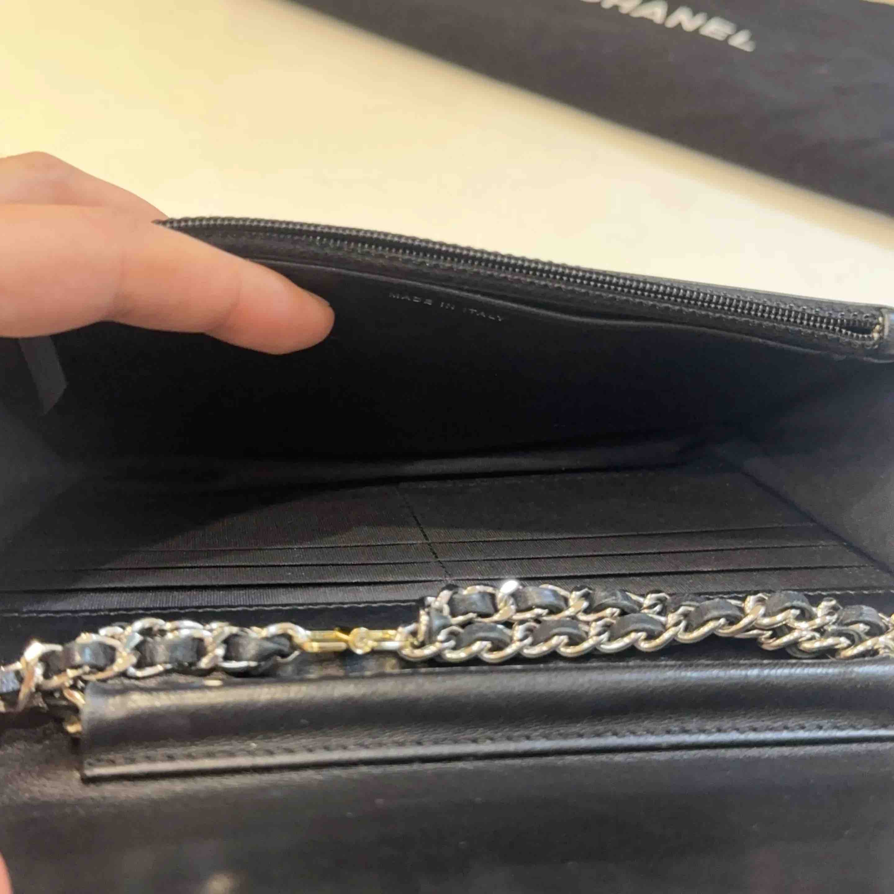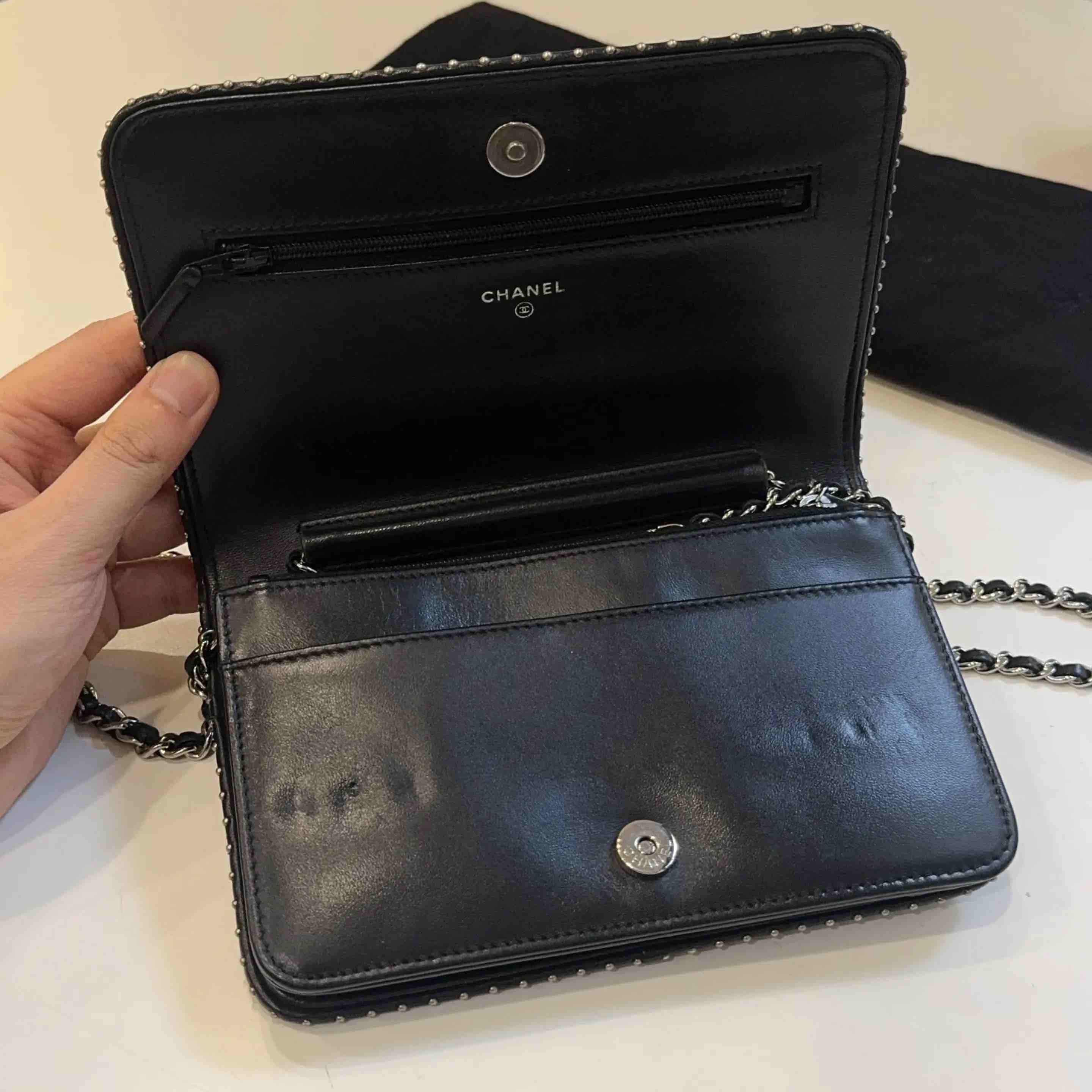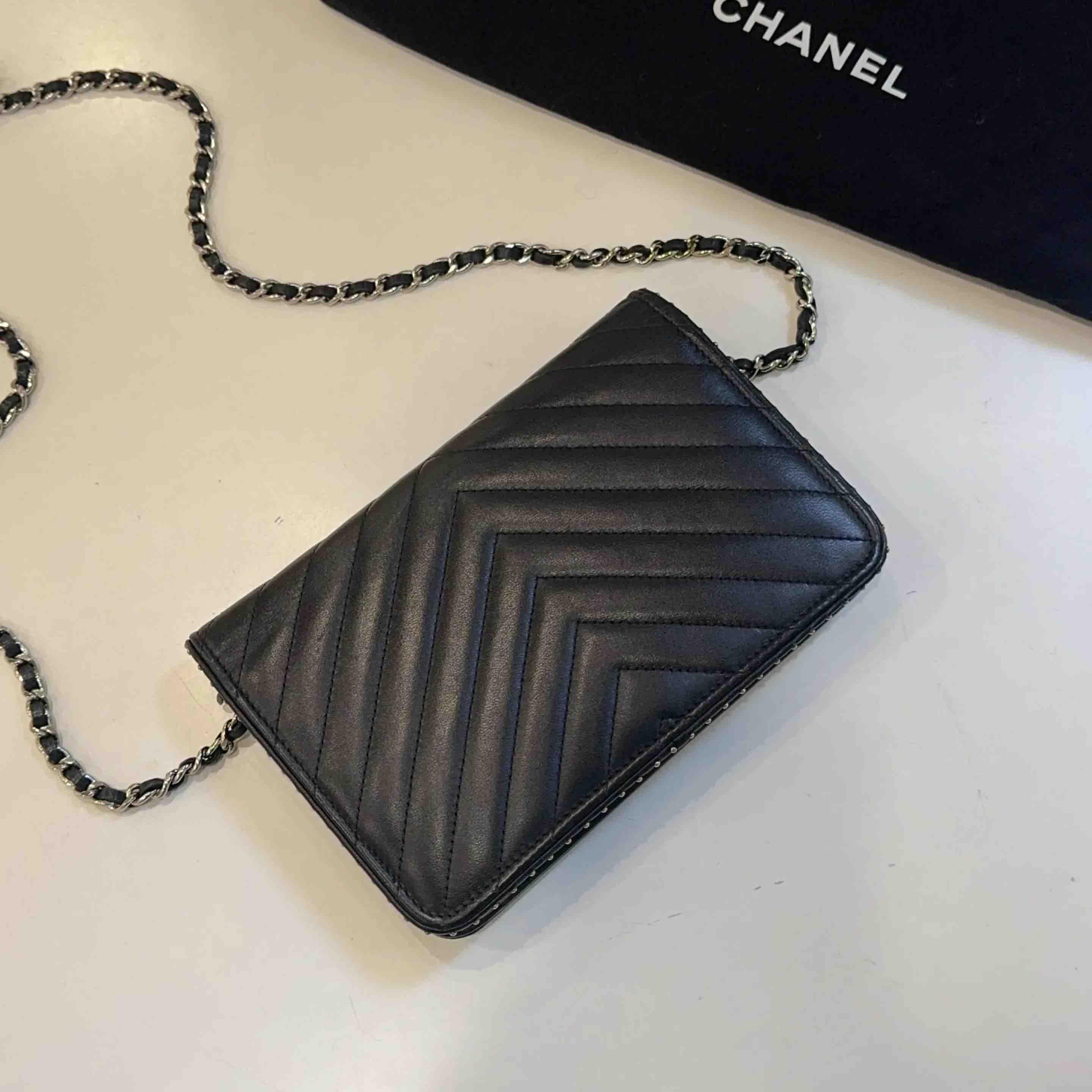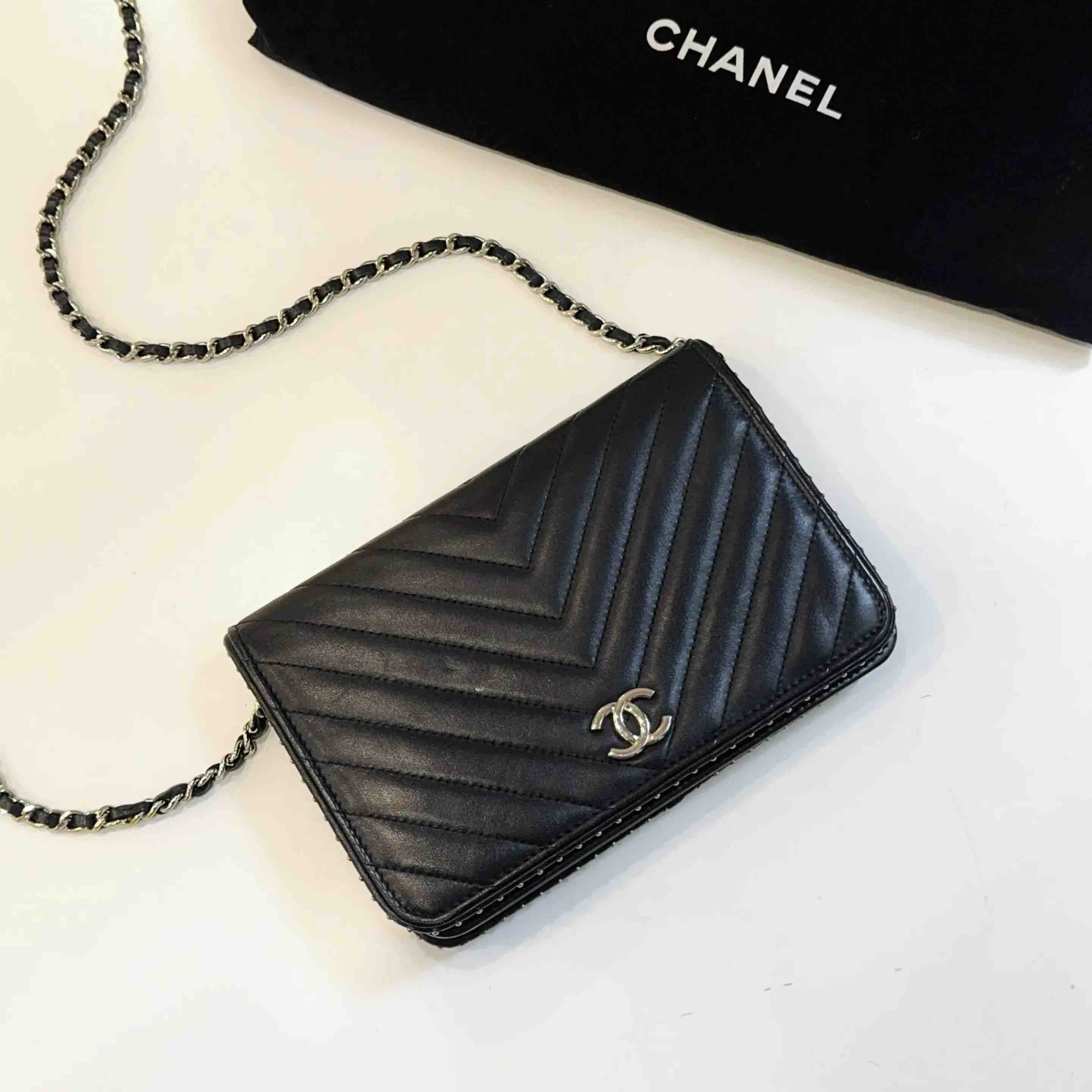 【商品详情】正品二手 Chanel V纹 铆钉 Woc 链条包⛓️95新 19*12 镭射26开 配件:防尘袋。包侧两边配皮正常使用感。实用又有品牌感。