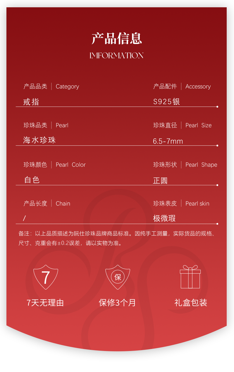 【阮仕珍珠】阮仕心语系列S925银 Akoya珍珠戒指 6.5-7mm