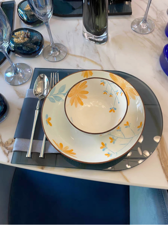 餐具以手绘的笔触呈现出小雏菊花园的美景 如同一幅绚丽的画卷展开在餐盘之上 每一朵小雏菊都是精心绘制的 细致入微的描绘让人仿佛能够闻到花香的味道 同时,釉下彩工艺 保证了餐具的安全性和健康性,让人吃得安心