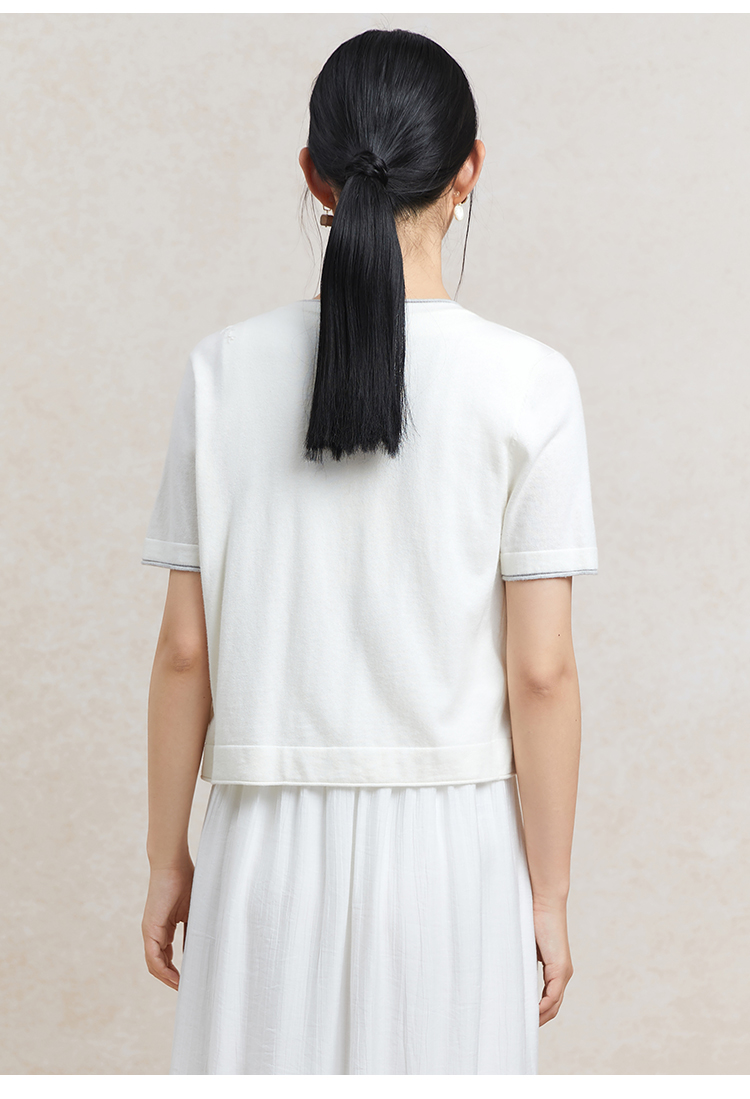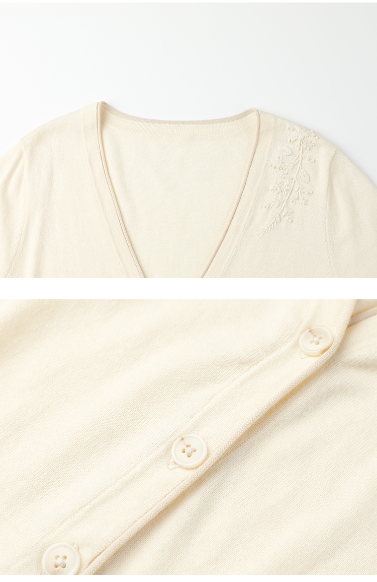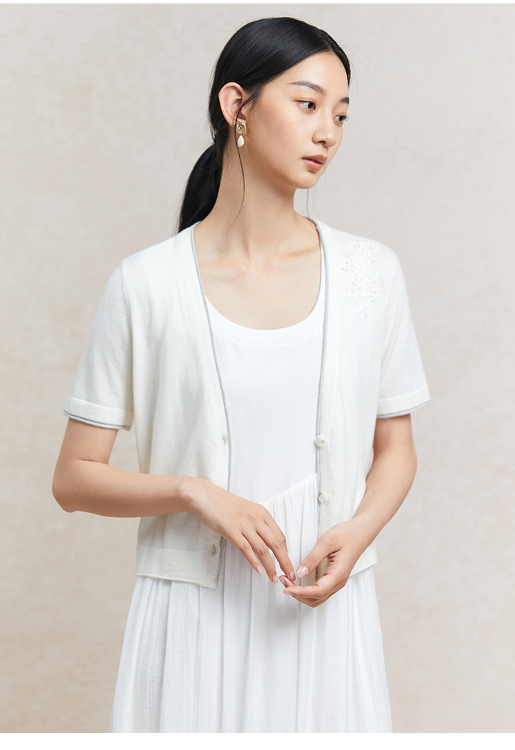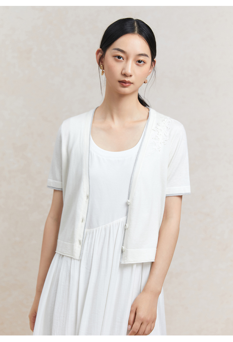 Famecoco范可儿植物刺绣针织开衫女夏纯棉短袖v领外套FAC3DE005