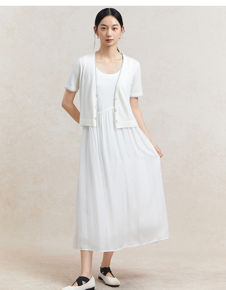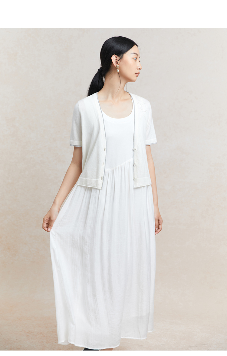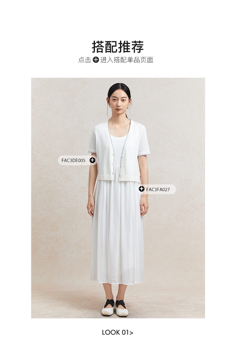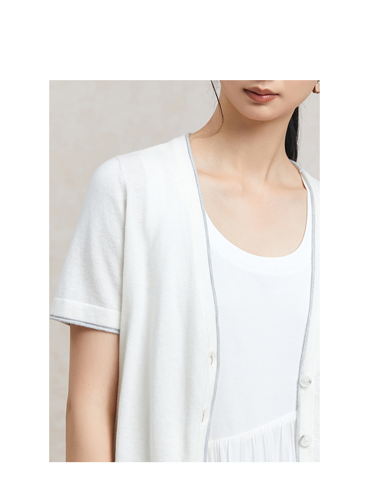 Famecoco范可儿植物刺绣针织开衫女夏纯棉短袖v领外套FAC3DE005