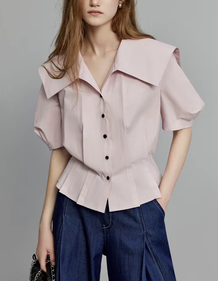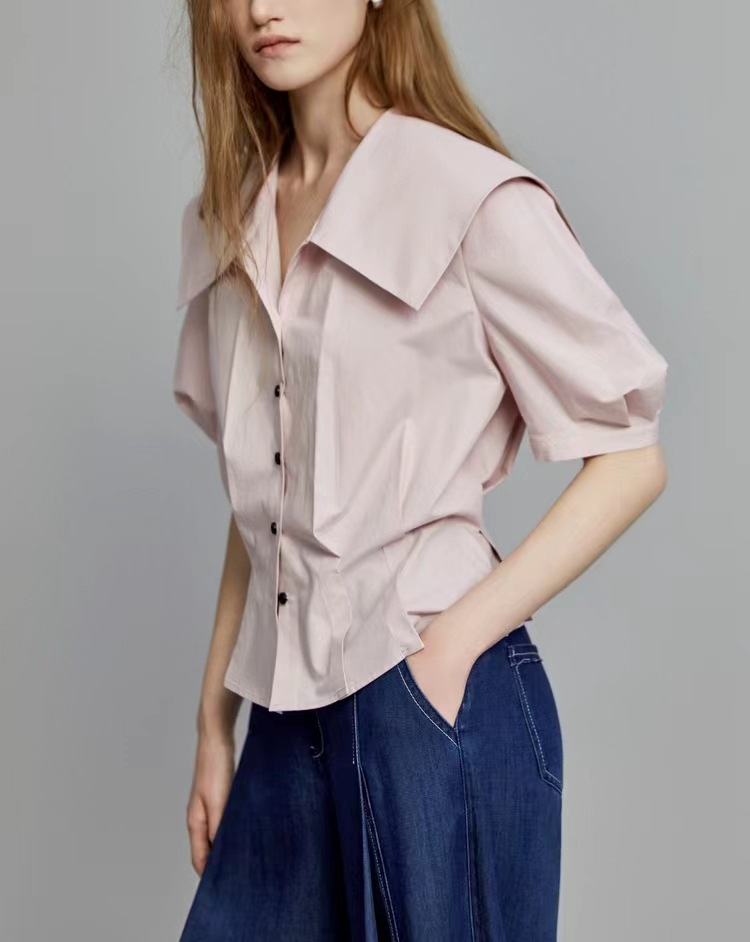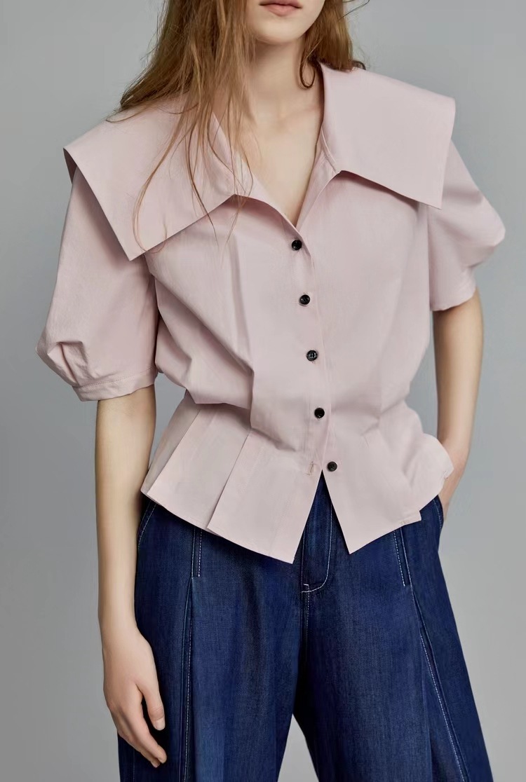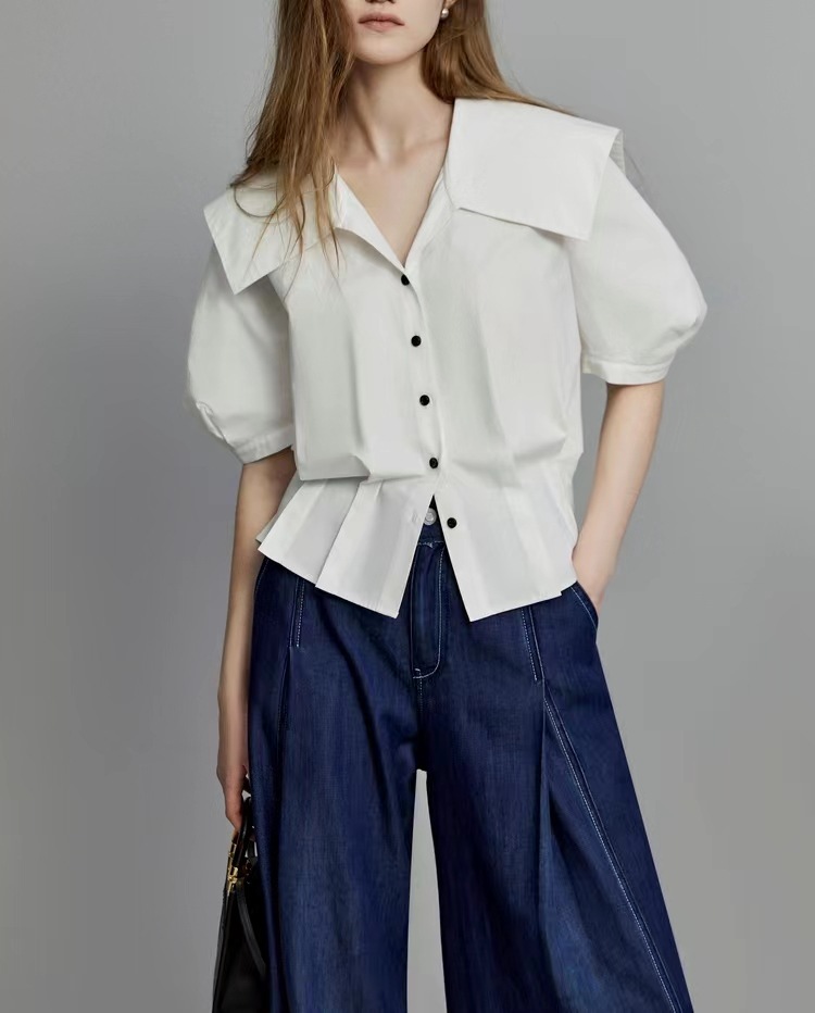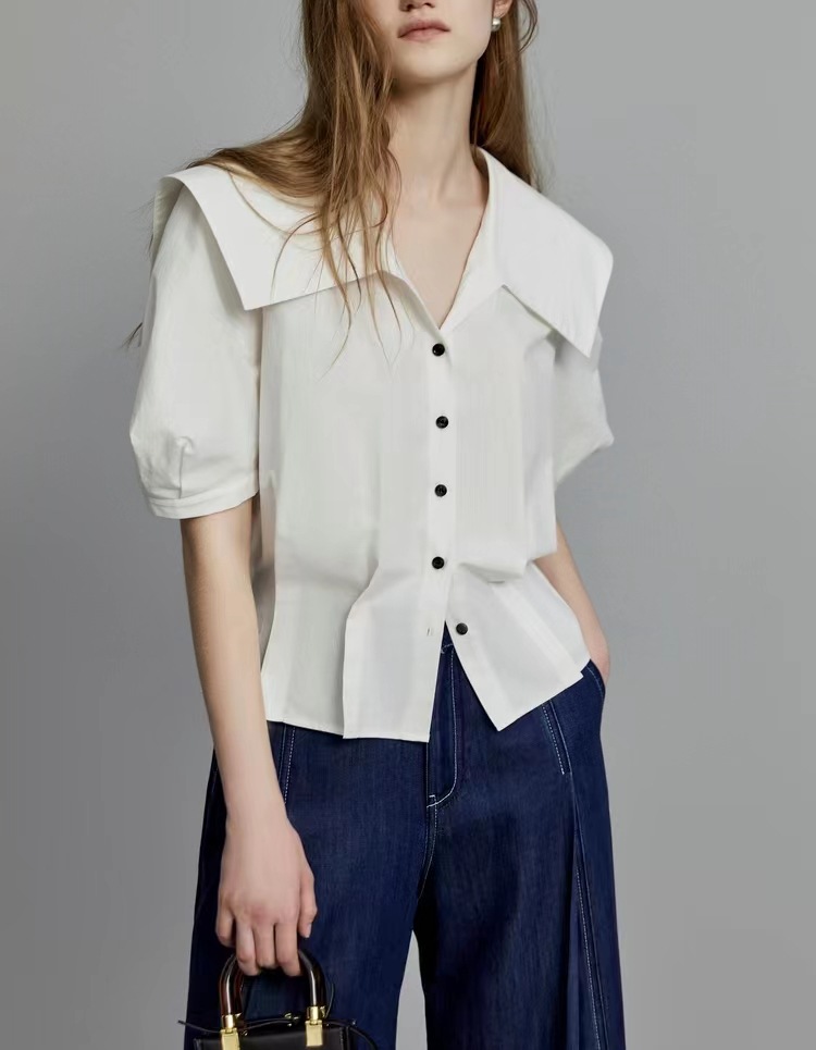 法式翻领收腰纯棉衬衫女2023夏季新款通勤简约小众上衣