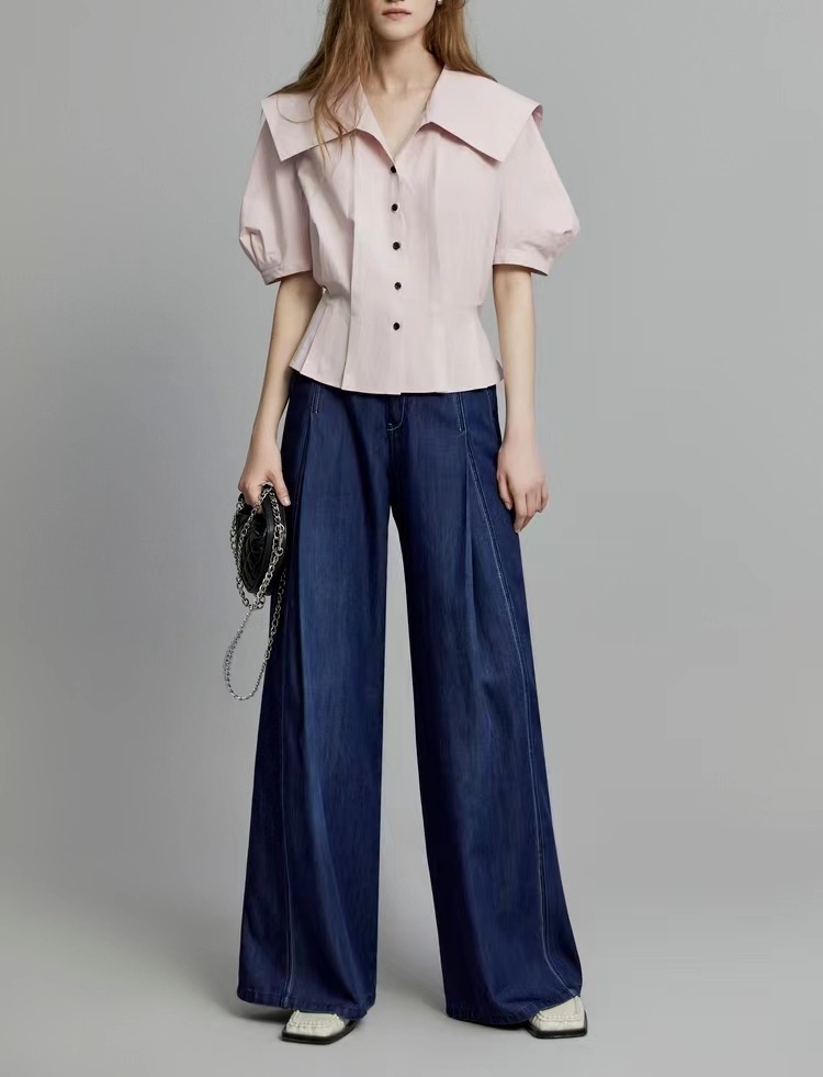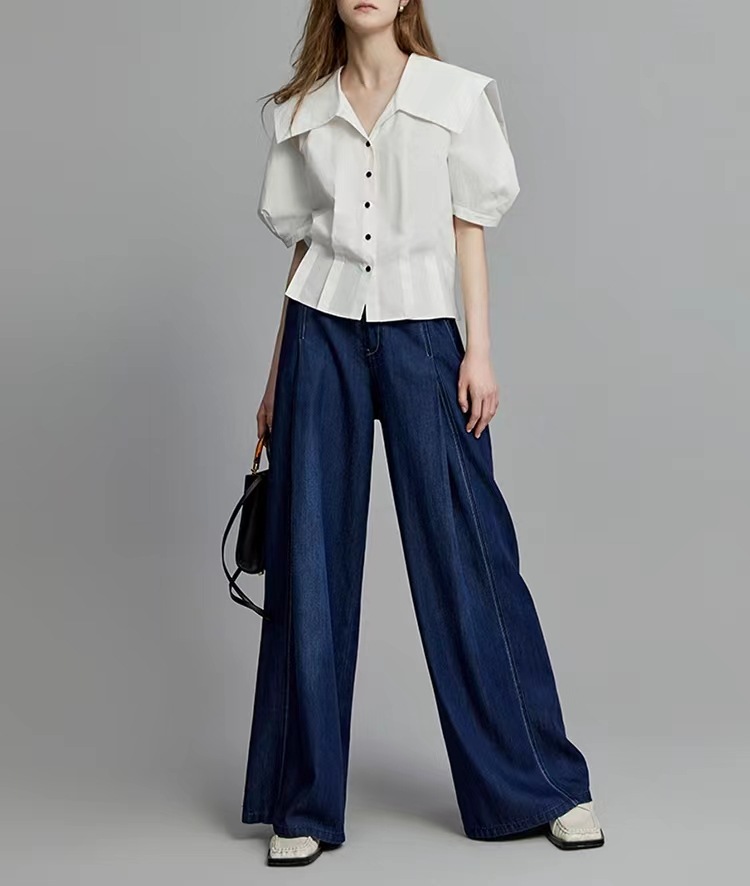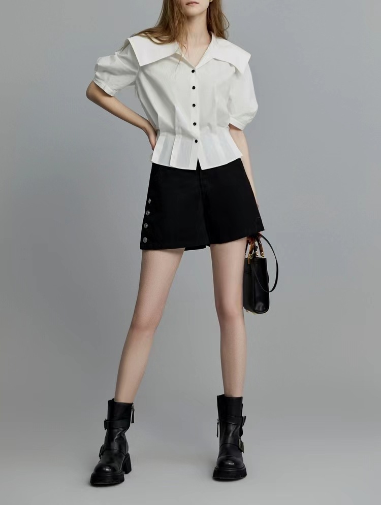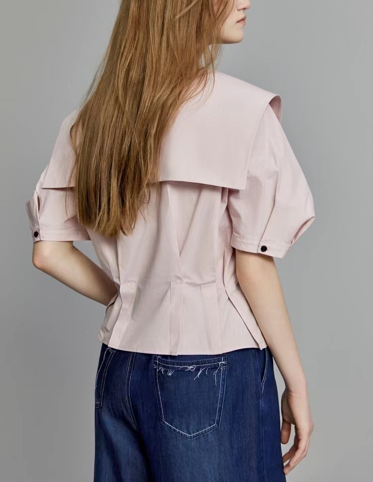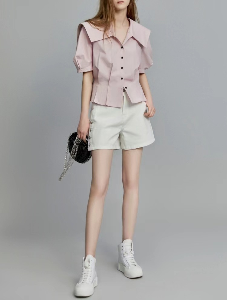 法式翻领收腰纯棉衬衫女2023夏季新款通勤简约小众上衣