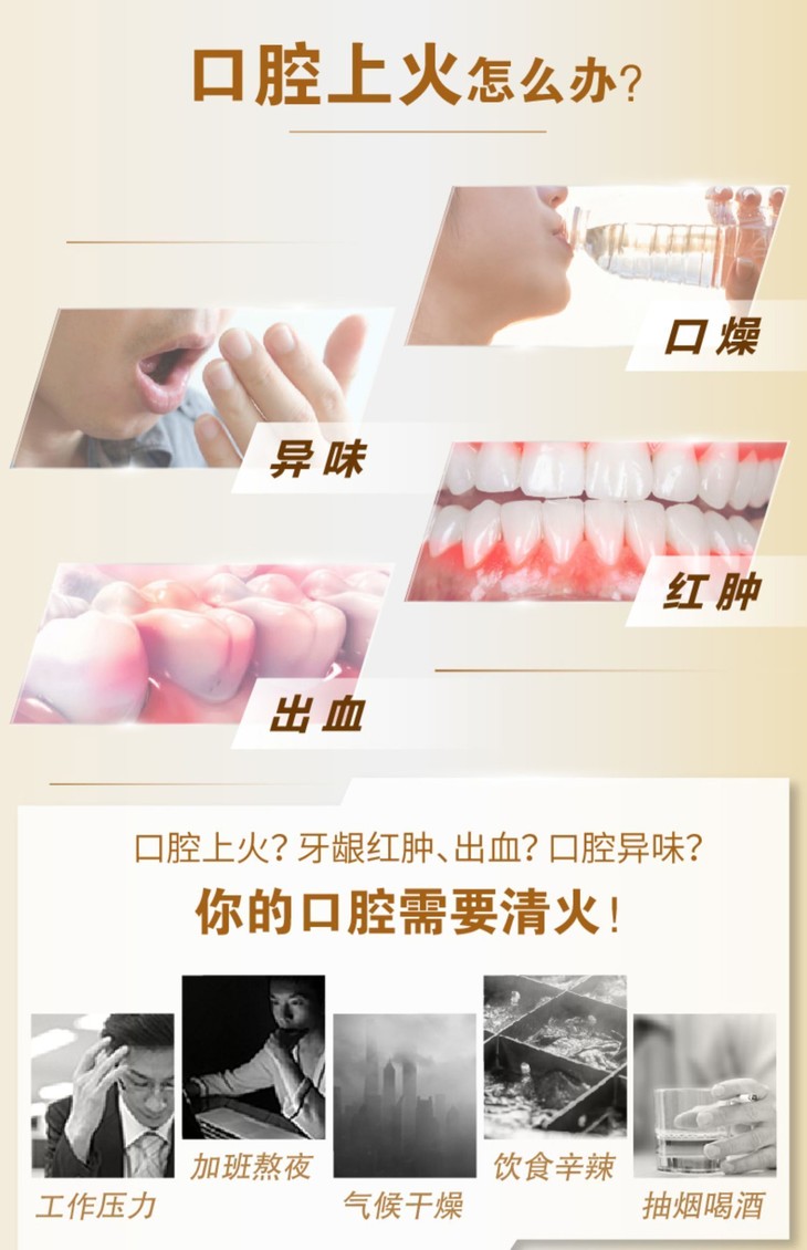 蛇胆,具有清热降火作用❗ 从根源上缓解上火异味干燥 保护牙龈,减少牙菌斑清火降燥的作用 让口腔舒适清爽、干净 其中的牛黄,珍贵而稀少 比黄金还要贵上好几倍的中药材 。 中医上记载,可清热解毒 舒缓牙龈肿痛 可以缓解饮食辛辣带来的气火过旺 田七被称为“天然止血药” 具有止血、定痛的作用 是消炎止血必备的天然修复剂 💯 可以消除牙痛、减少牙龈出血 缓解牙龈红肿问题